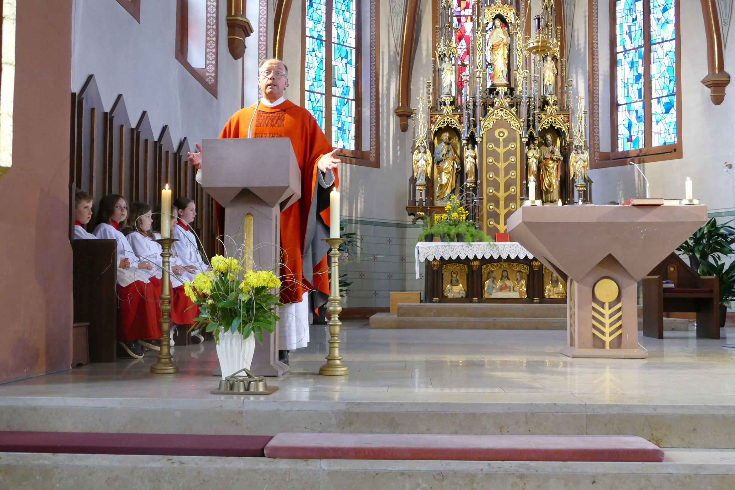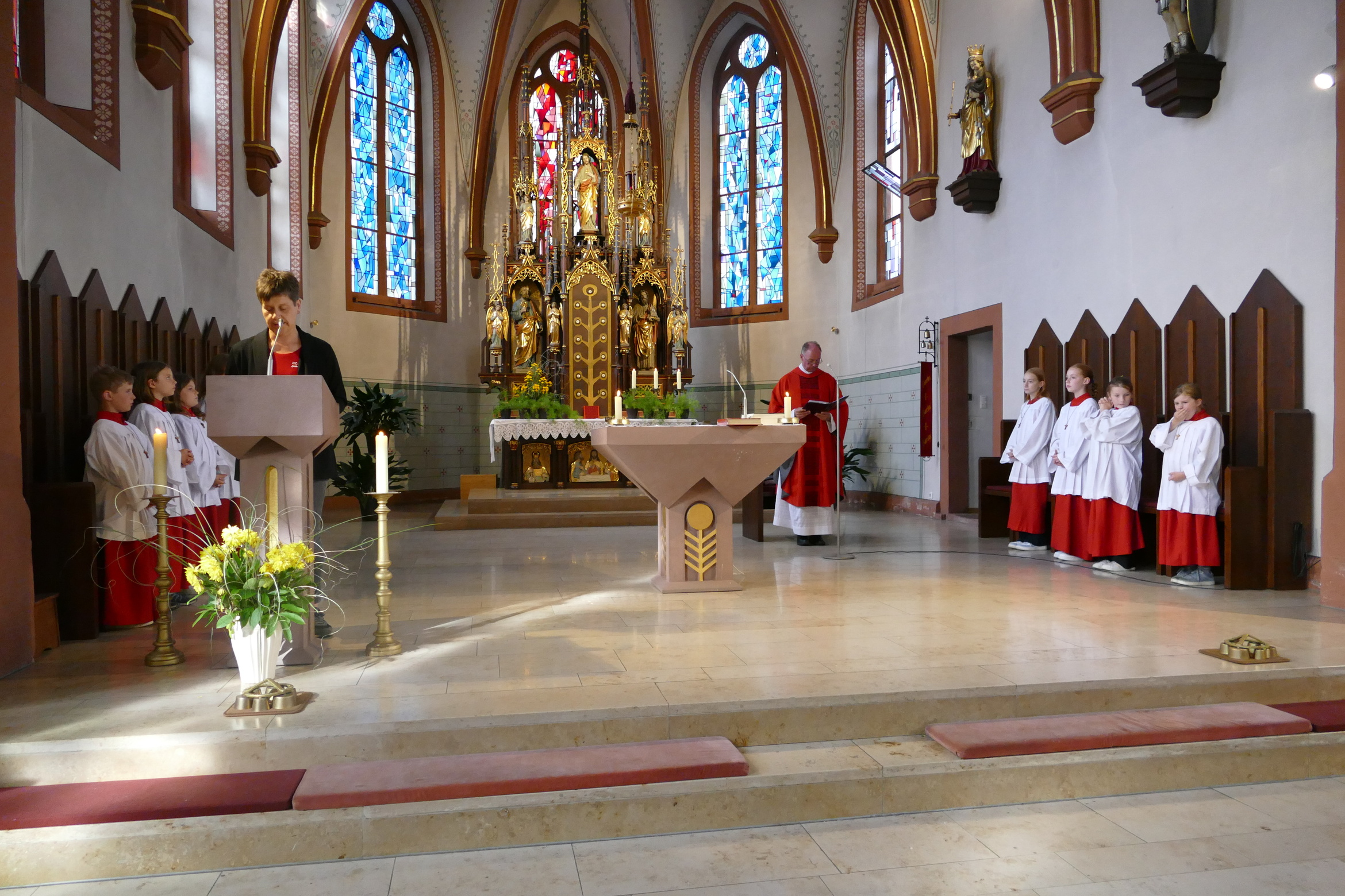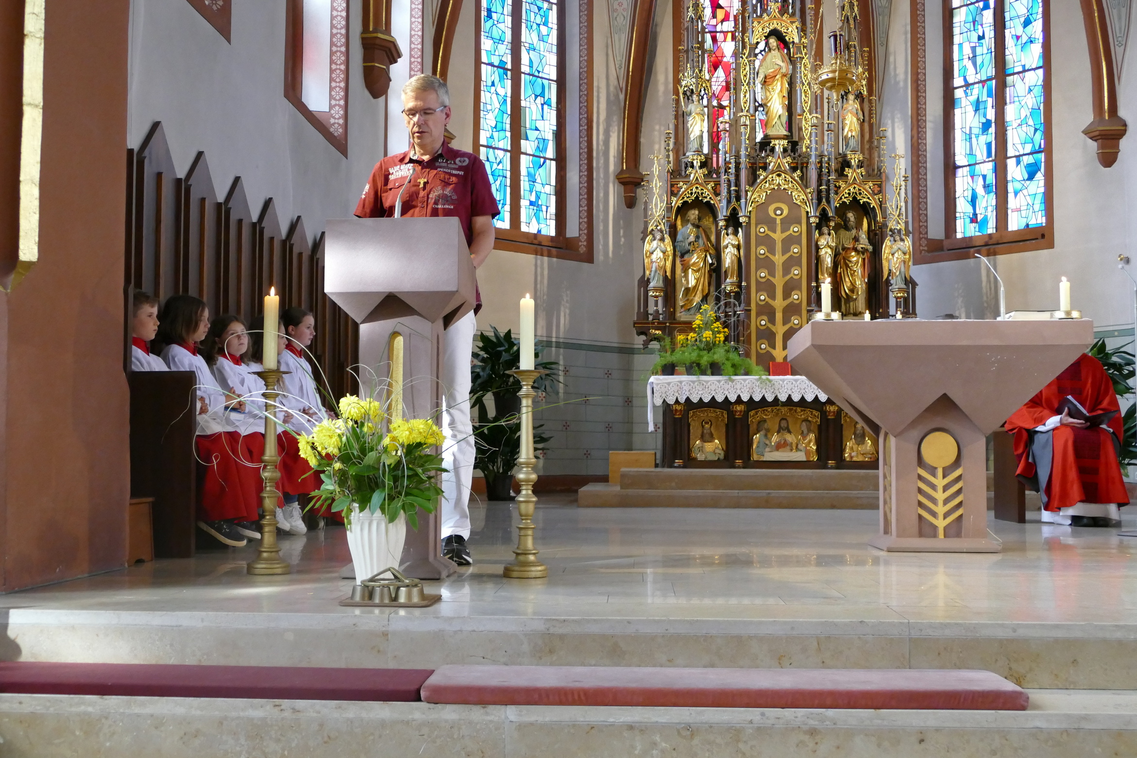 am Sonntag, 07. Juli. Pfarrer Michael Prokschi begrüßte im Besonderen die neuen Ministrantinnen und Ministranten, die sich bereit erklärt haben, den Dienst in den Gemeinden auszuüben. Ebenso begrüßte er die Mitglieder der Carneval Club Kirchzell, die den Gottesdienst mitfeierten und im Anschluss den Dämmerschoppen ausrichteten. In seiner Predigt ging Pfr. Prokschi auf die Frankenheiligen Kilian, Kolonat und Totnan ein, blickte auf unzählige Frauen und Männer in der Diözese, die bis heute die Botschaft des Glaubens durch ihr Leben verkünden. Auch die Ministranten geben so Zeugnis und verrichten einen wichtigen Dienst innerhalb der Gemeinde. Er wünschte den Buben und Mädchen viel Freude in ihrem Dienst, bat zugleich die Eltern und die Gemeinde, die Kinder zu unterstützen.