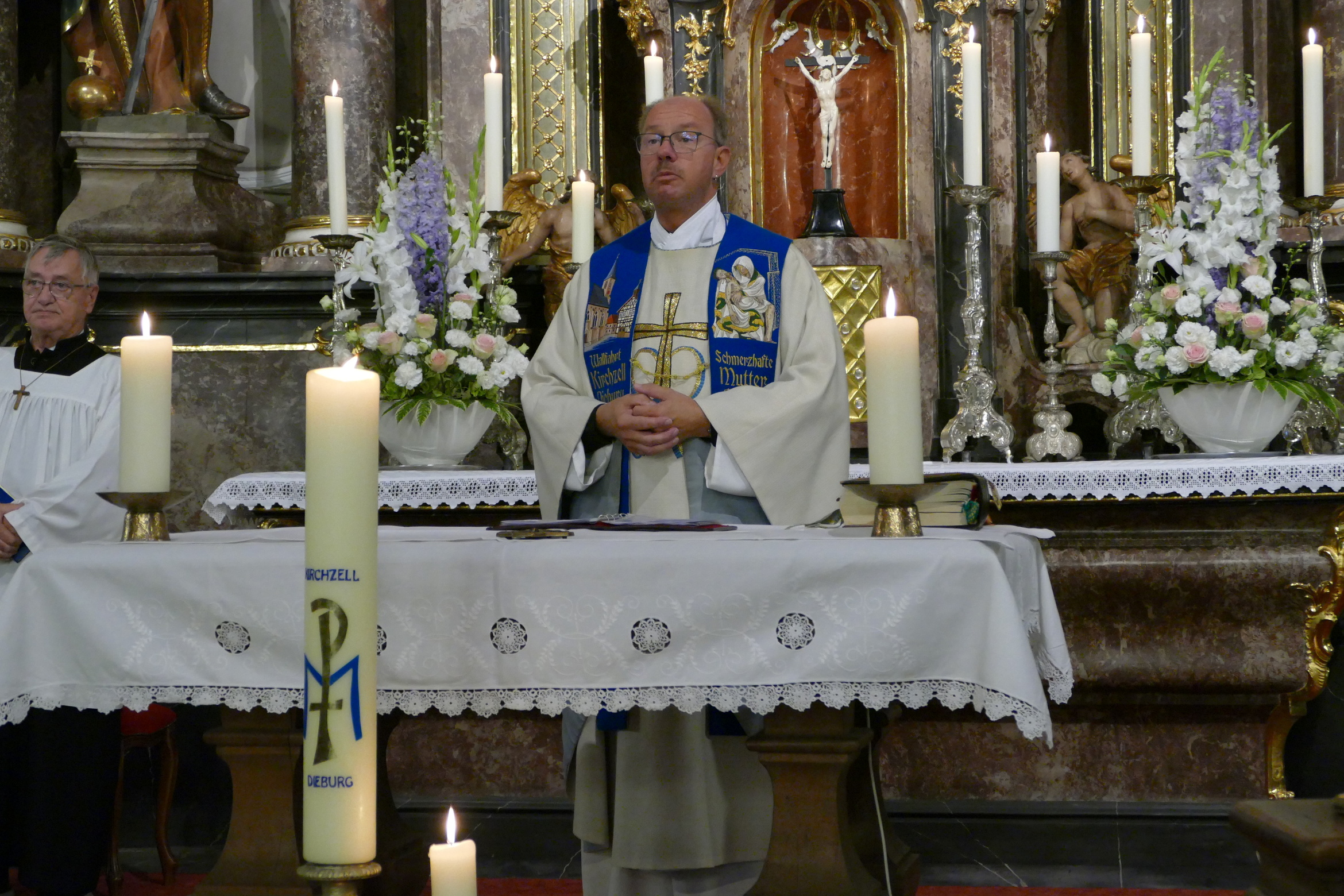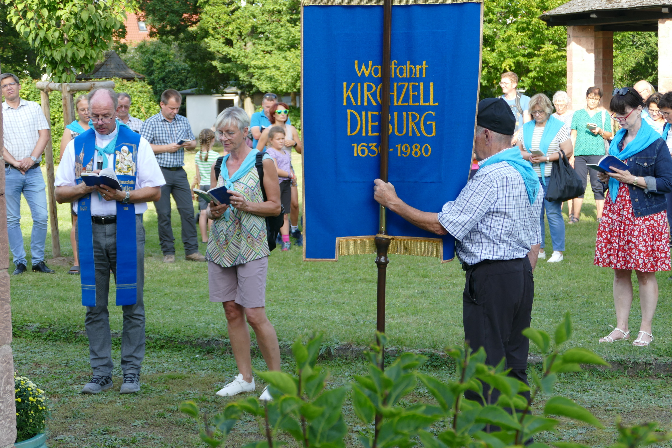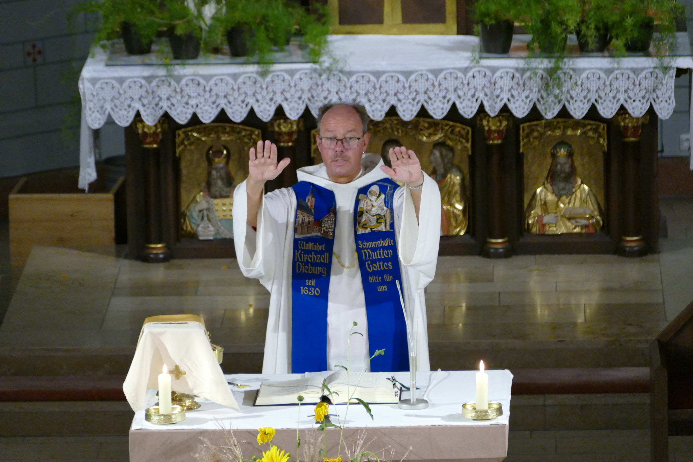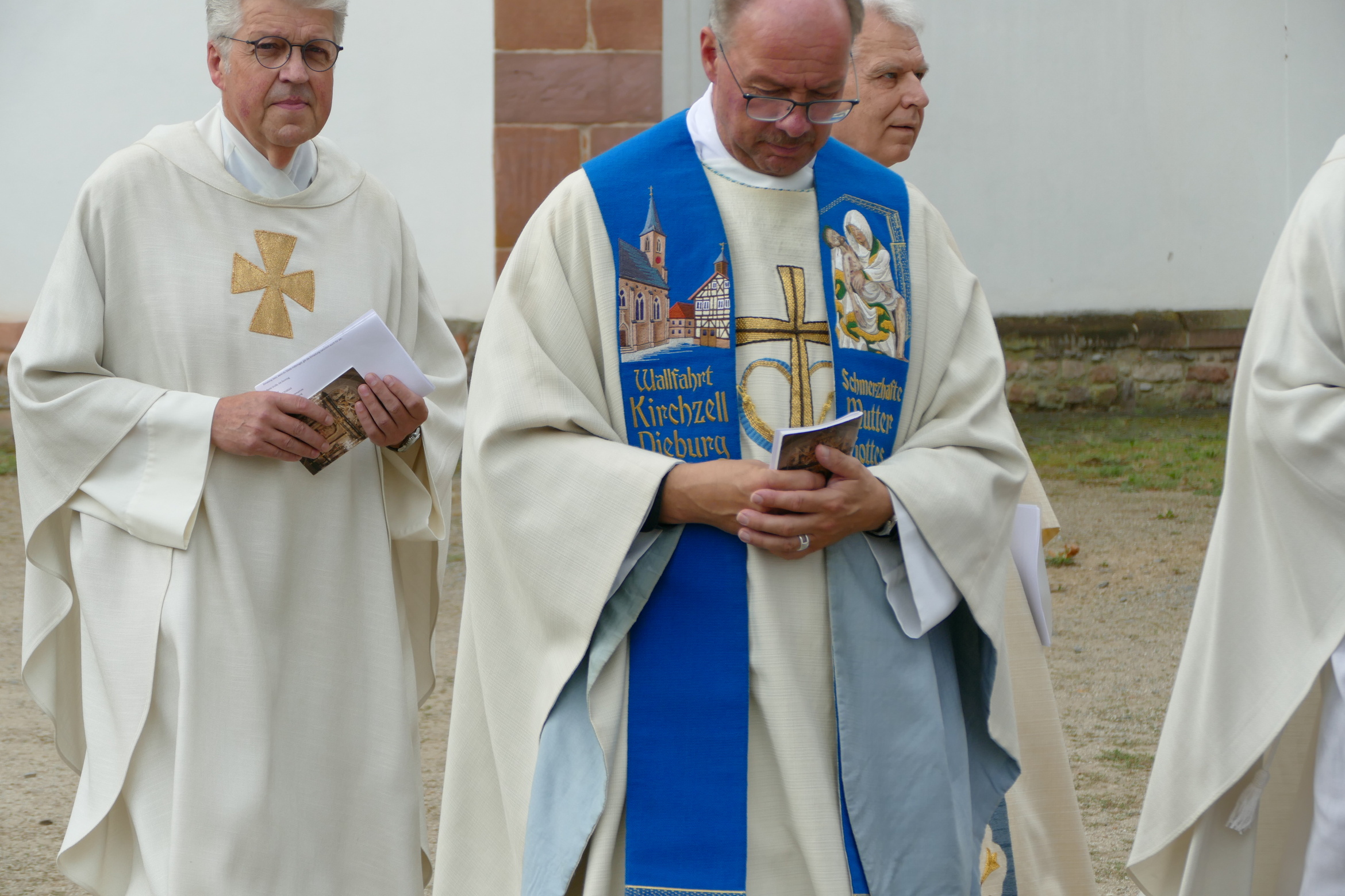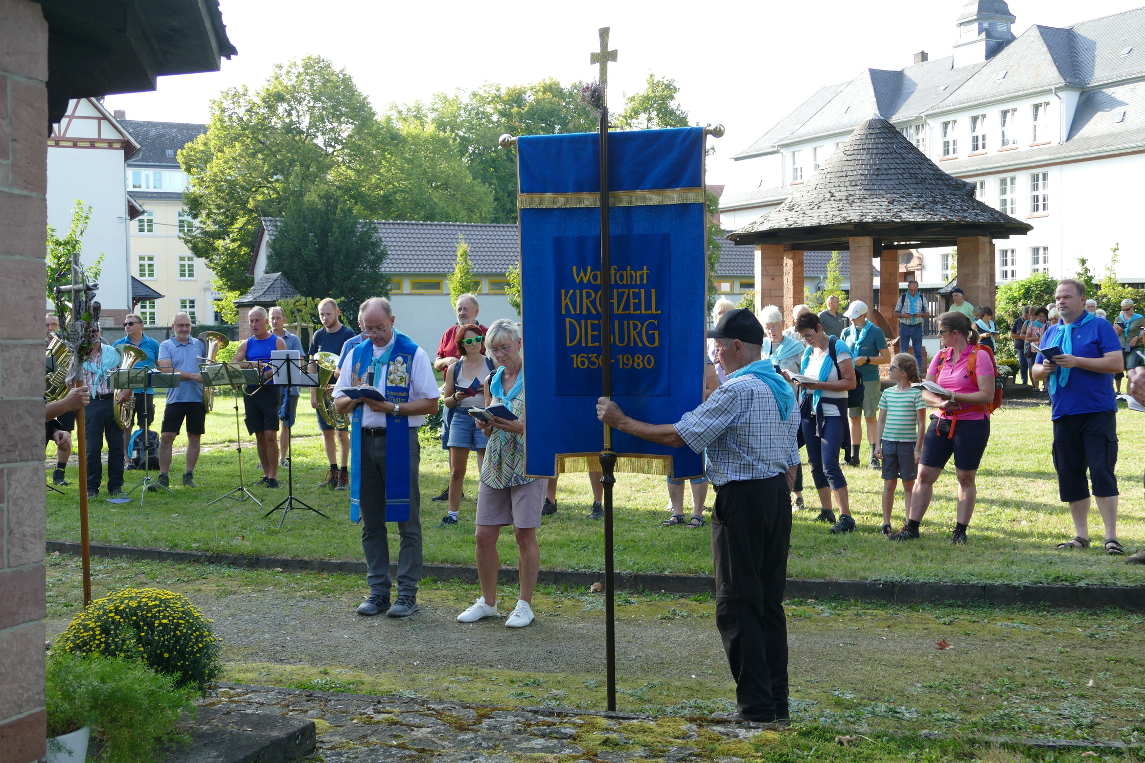 Pfarrer Alexander Vogel begrüßte die Wallfahrer und begleitet von den Dieburgbläsern und vielen weiteren Gemeindemitgliedern wurde betend und singend in die Gnadenkapelle eingezogen. Seit 1630, seither auch ununterbrochen, sind die Kirchzeller zum Fest Maria Geburt in Dieburg. Am Vortag, dem 07.September werden die Stationen zu den sieben Schmerzen Mariens gebetet, im Anschluss segnet Pfarrer Michael Prokschi die Kerzen und Wallfahrtsandenken. Am Abend ist dann der festliche Gottesdienst am Freialtar,m die beeindruckende Lichterprozession durch Dieburg schließt sich an. Am Festtag Maria Geburt ist um 7.00 Uhr das gelobte Amt der Kirchzeller, um 10.00 Uhr nochmal die Messe am Freialtar.