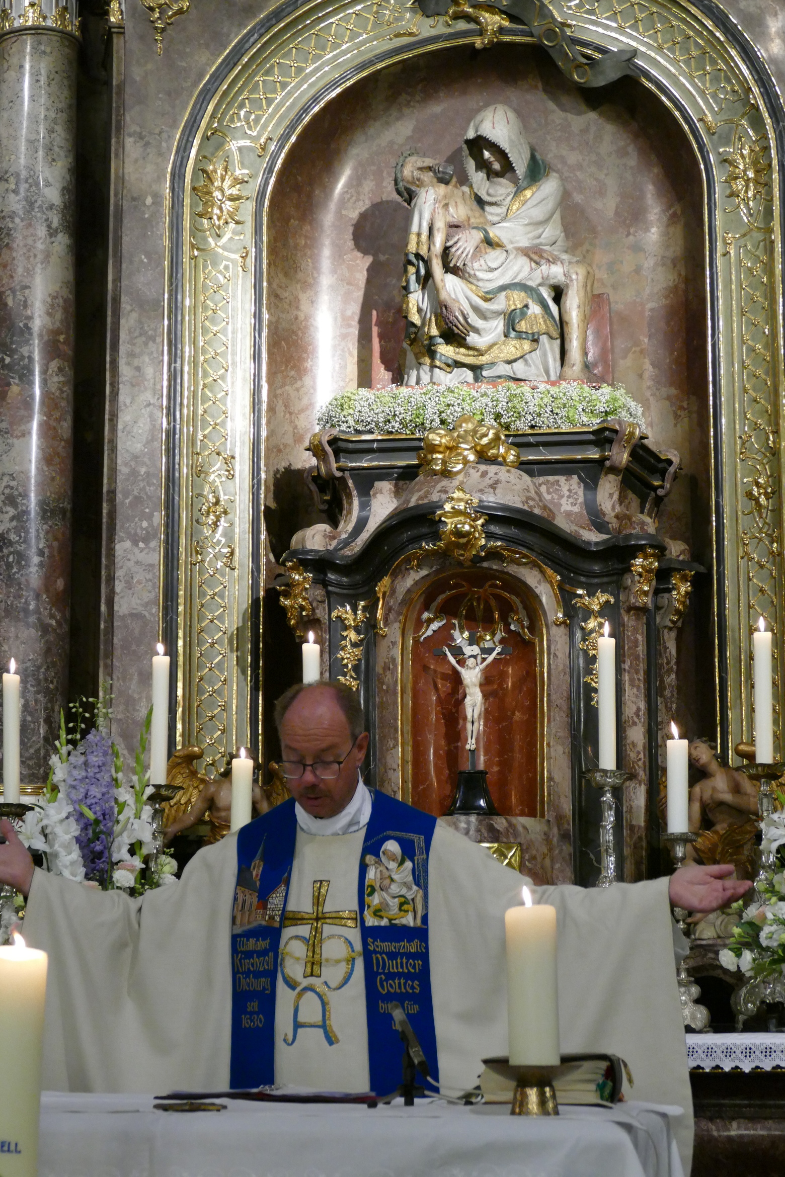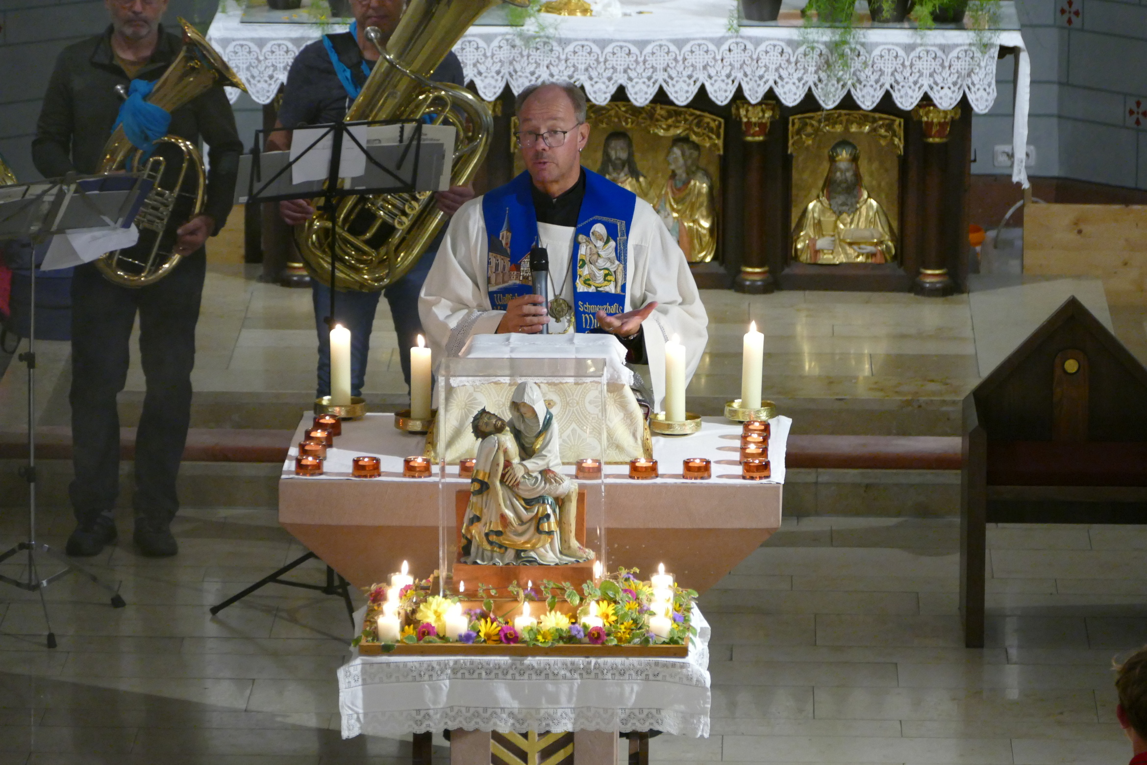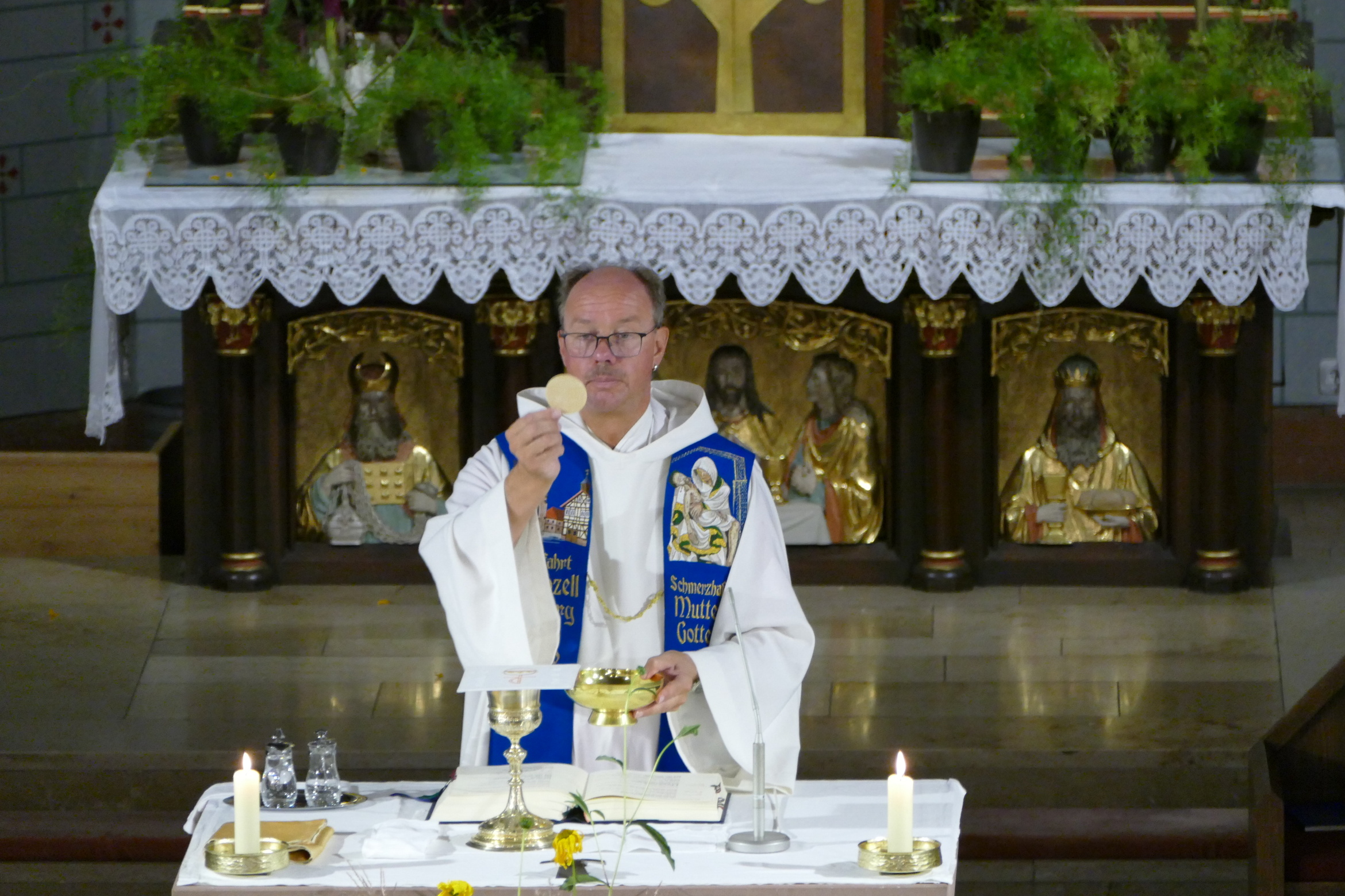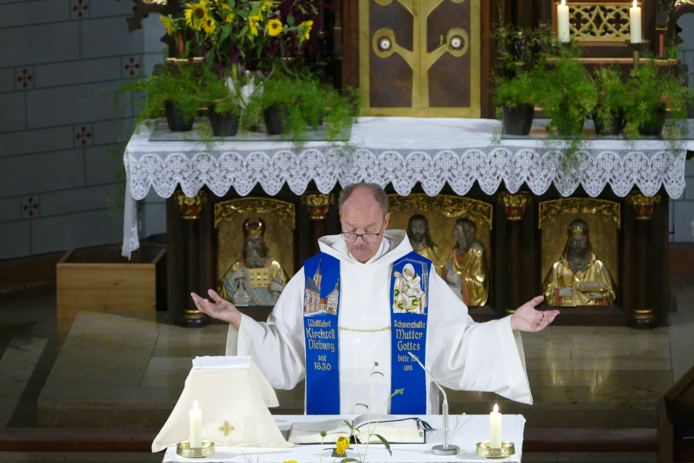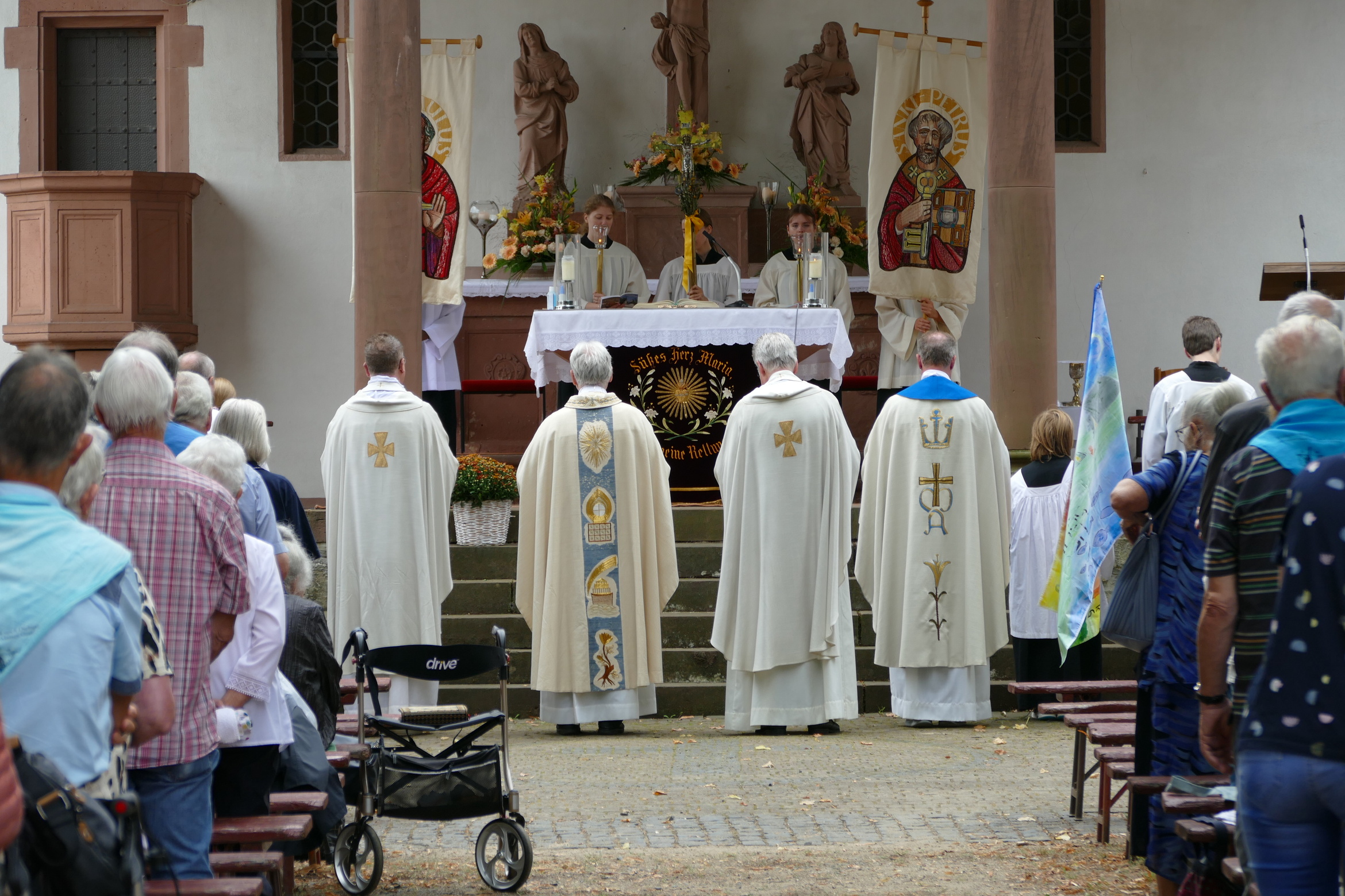 Pfarrer Alexander Vogel begrüßte die Wallfahrer und begleitet von den Dieburgbläsern und vielen weiteren Gemeindemitgliedern wurde betend und singend in die Gnadenkapelle eingezogen. Seit 1630, seither auch ununterbrochen, sind die Kirchzeller zum Fest Maria Geburt in Dieburg. Am Vortag, dem 07.September werden die Stationen zu den sieben Schmerzen Mariens gebetet, im Anschluss segnet Pfarrer Michael Prokschi die Kerzen und Wallfahrtsandenken. Am Abend ist dann der festliche Gottesdienst am Freialtar,m die beeindruckende Lichterprozession durch Dieburg schließt sich an. Am Festtag Maria Geburt ist um 7.00 Uhr das gelobte Amt der Kirchzeller, um 10.00 Uhr nochmal die Messe am Freialtar.