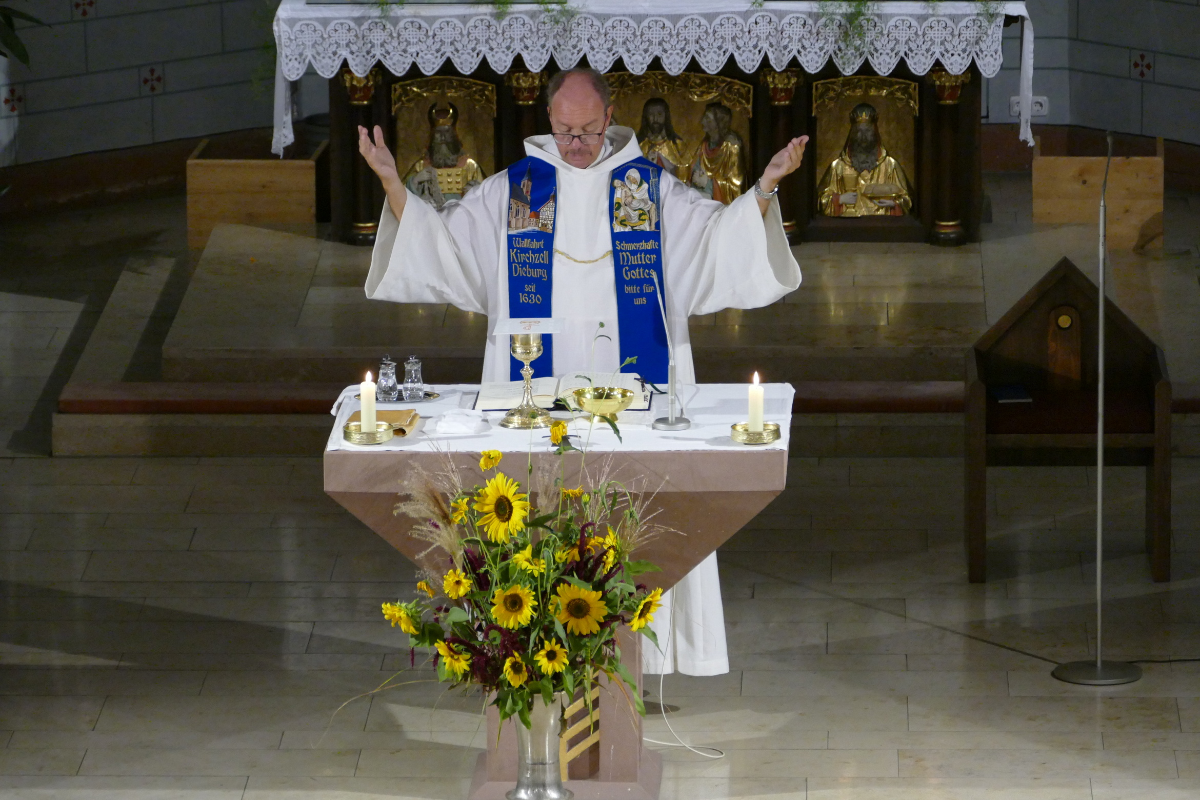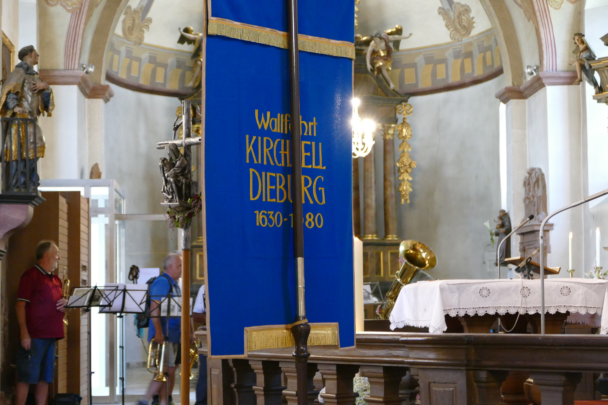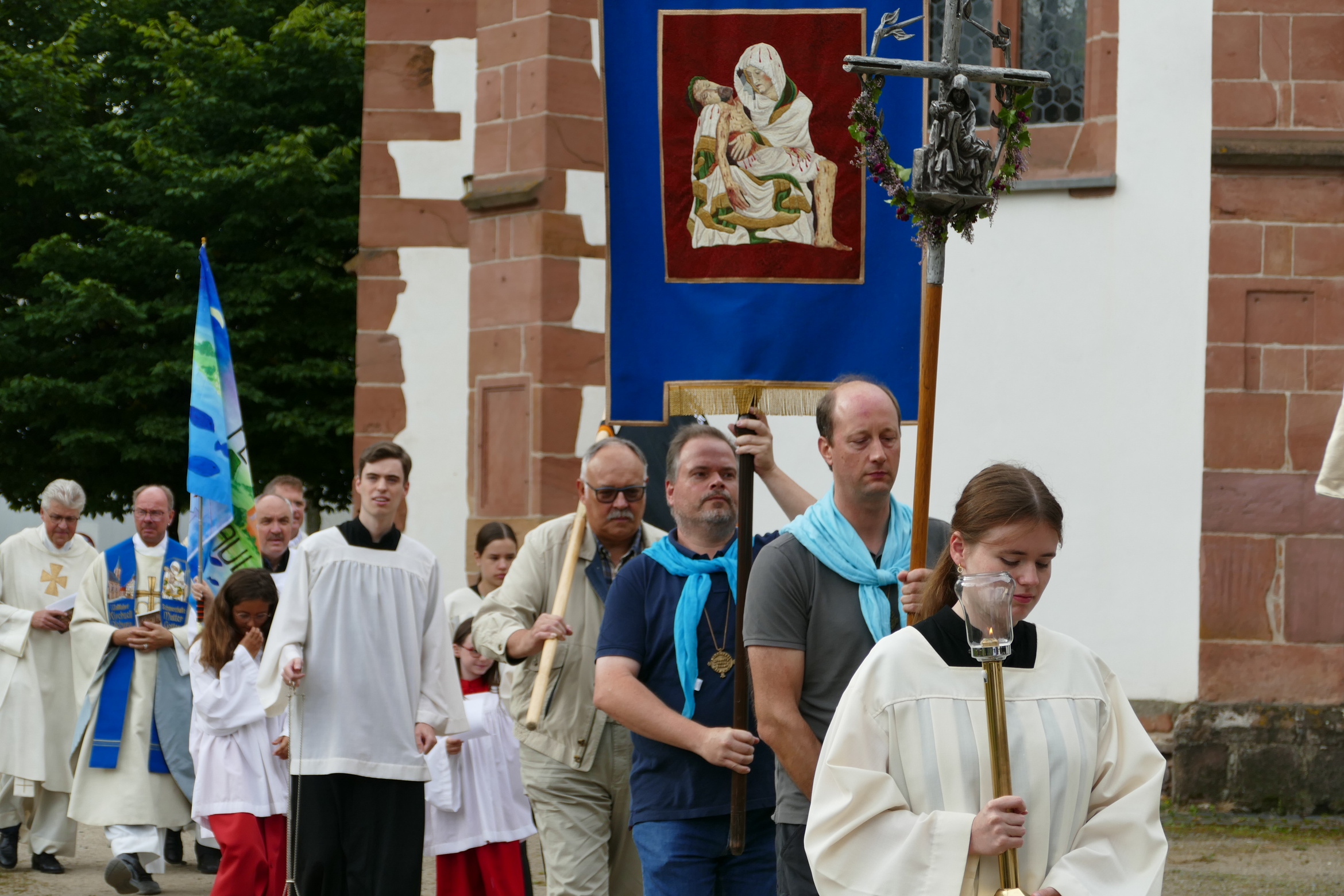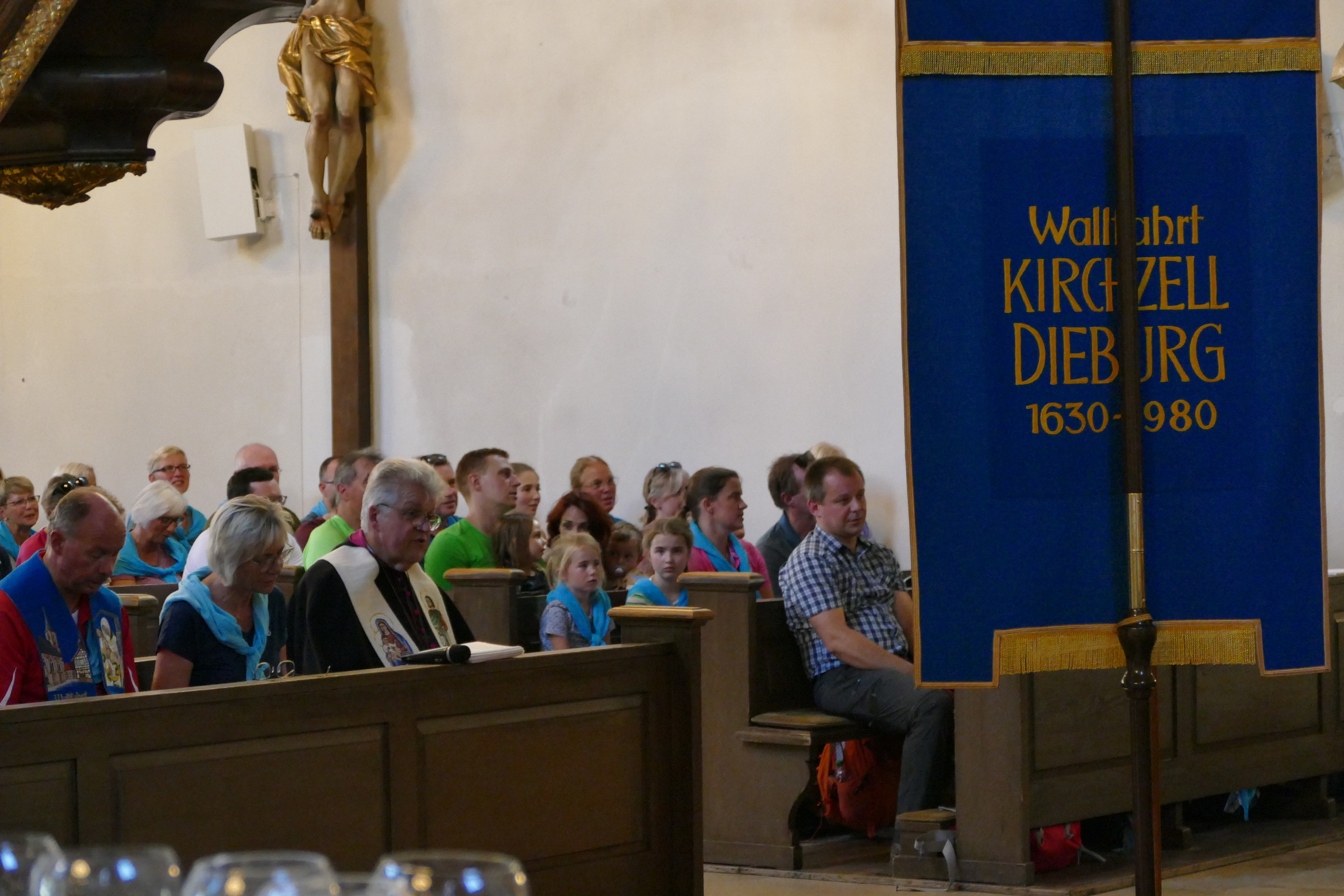 Pfarrer Alexander Vogel begrüßte die Wallfahrer und begleitet von den Dieburgbläsern und vielen weiteren Gemeindemitgliedern wurde betend und singend in die Gnadenkapelle eingezogen. Seit 1630, seither auch ununterbrochen, sind die Kirchzeller zum Fest Maria Geburt in Dieburg. Am Vortag, dem 07.September werden die Stationen zu den sieben Schmerzen Mariens gebetet, im Anschluss segnet Pfarrer Michael Prokschi die Kerzen und Wallfahrtsandenken. Am Abend ist dann der festliche Gottesdienst am Freialtar,m die beeindruckende Lichterprozession durch Dieburg schließt sich an. Am Festtag Maria Geburt ist um 7.00 Uhr das gelobte Amt der Kirchzeller, um 10.00 Uhr nochmal die Messe am Freialtar.