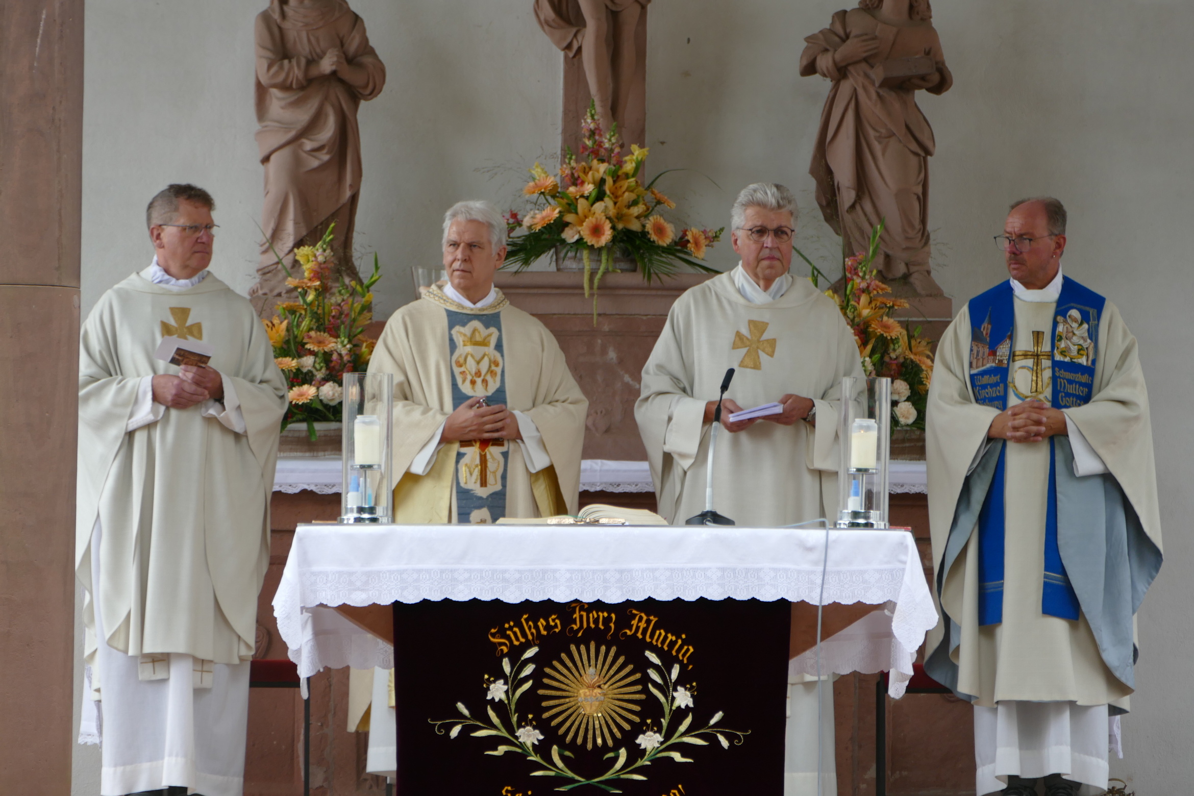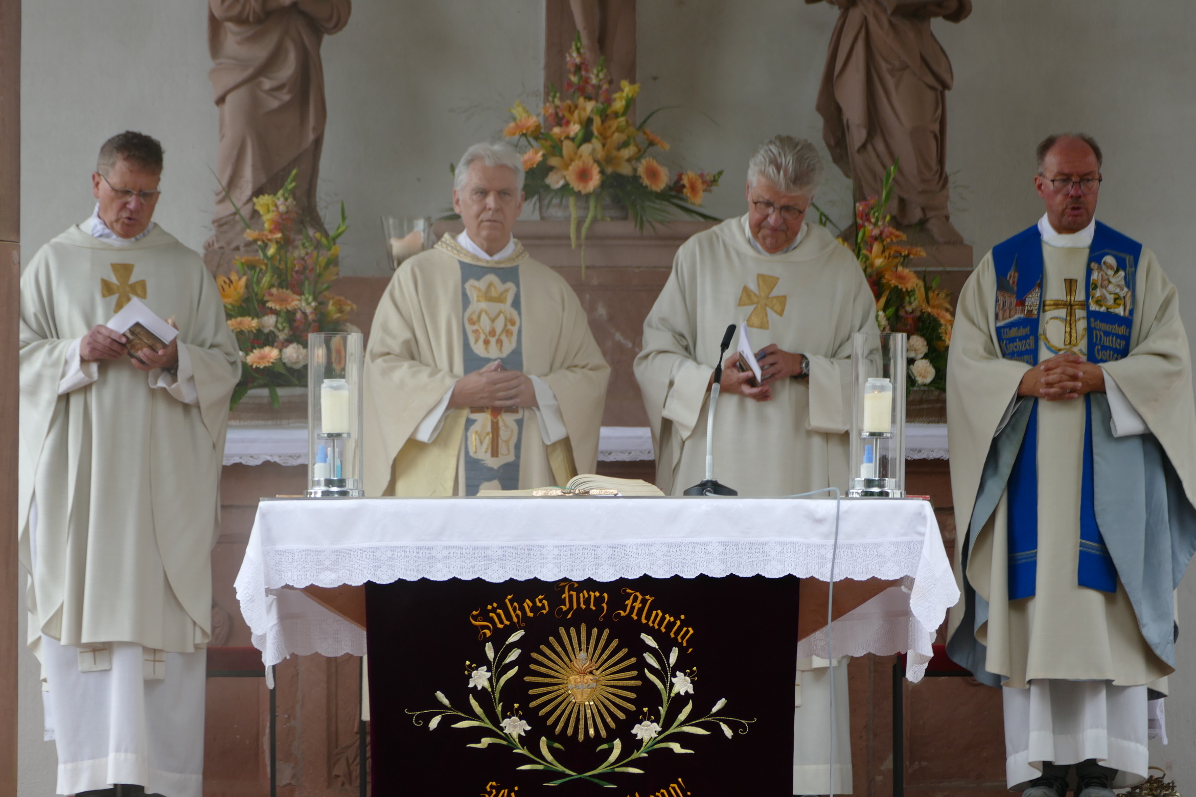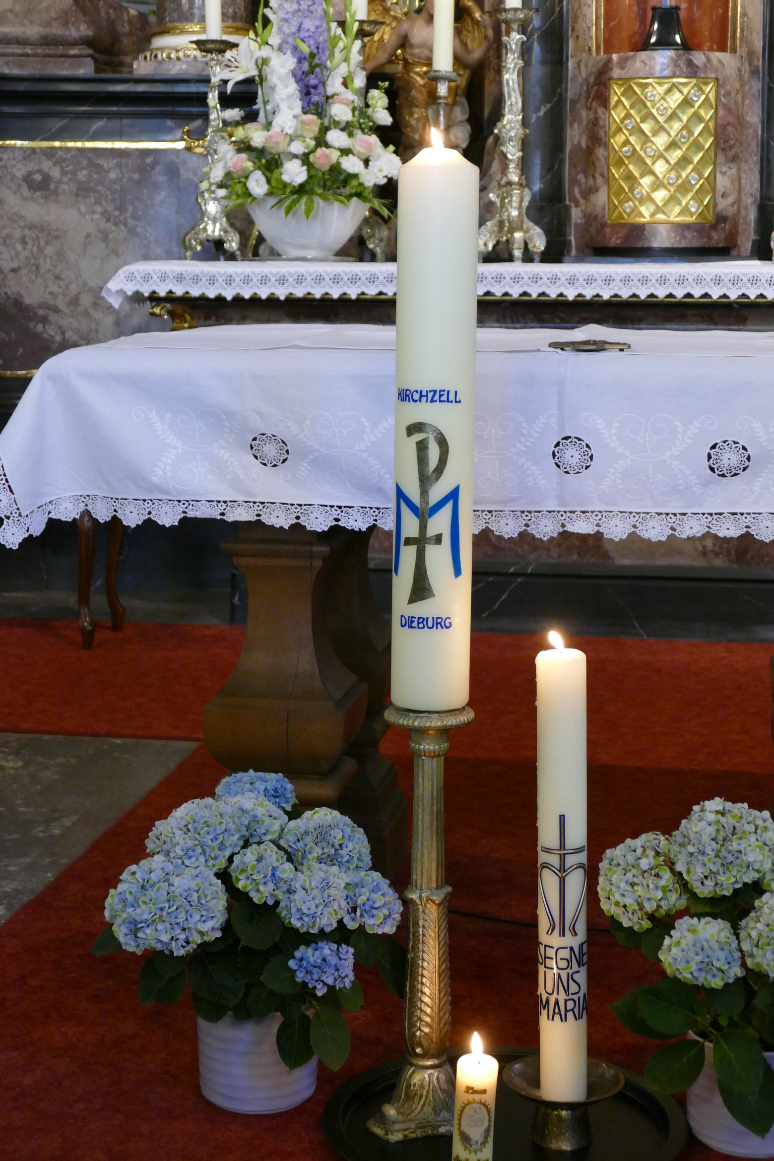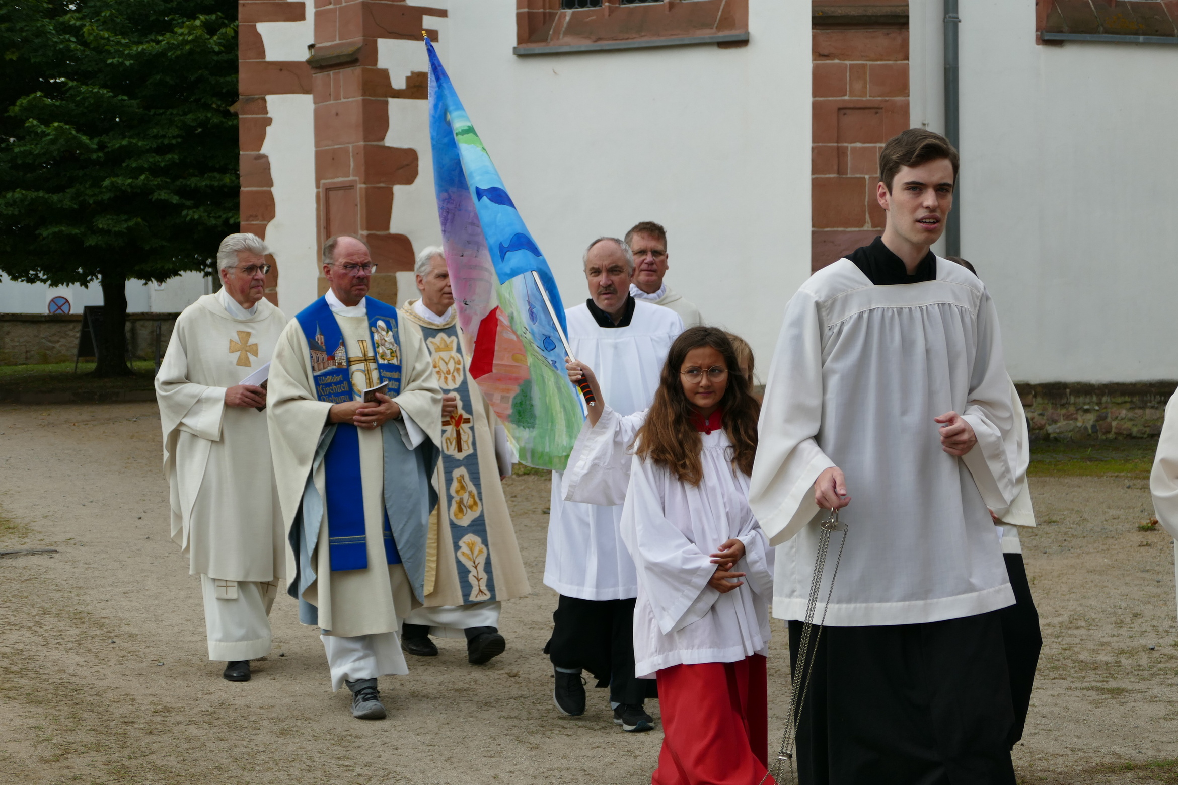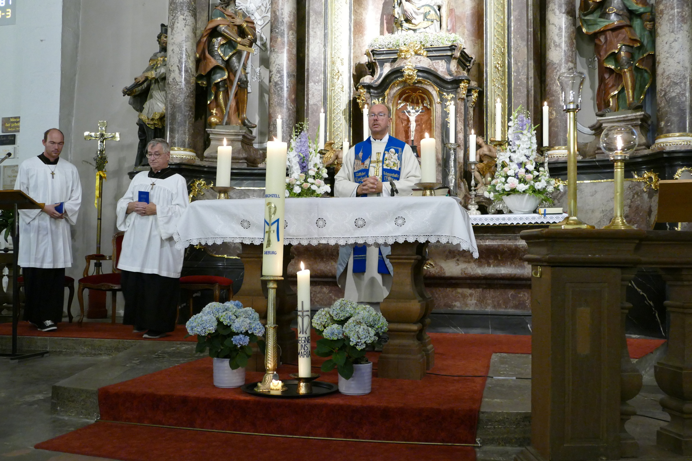 Pfarrer Alexander Vogel begrüßte die Wallfahrer und begleitet von den Dieburgbläsern und vielen weiteren Gemeindemitgliedern wurde betend und singend in die Gnadenkapelle eingezogen. Seit 1630, seither auch ununterbrochen, sind die Kirchzeller zum Fest Maria Geburt in Dieburg. Am Vortag, dem 07.September werden die Stationen zu den sieben Schmerzen Mariens gebetet, im Anschluss segnet Pfarrer Michael Prokschi die Kerzen und Wallfahrtsandenken. Am Abend ist dann der festliche Gottesdienst am Freialtar,m die beeindruckende Lichterprozession durch Dieburg schließt sich an. Am Festtag Maria Geburt ist um 7.00 Uhr das gelobte Amt der Kirchzeller, um 10.00 Uhr nochmal die Messe am Freialtar.