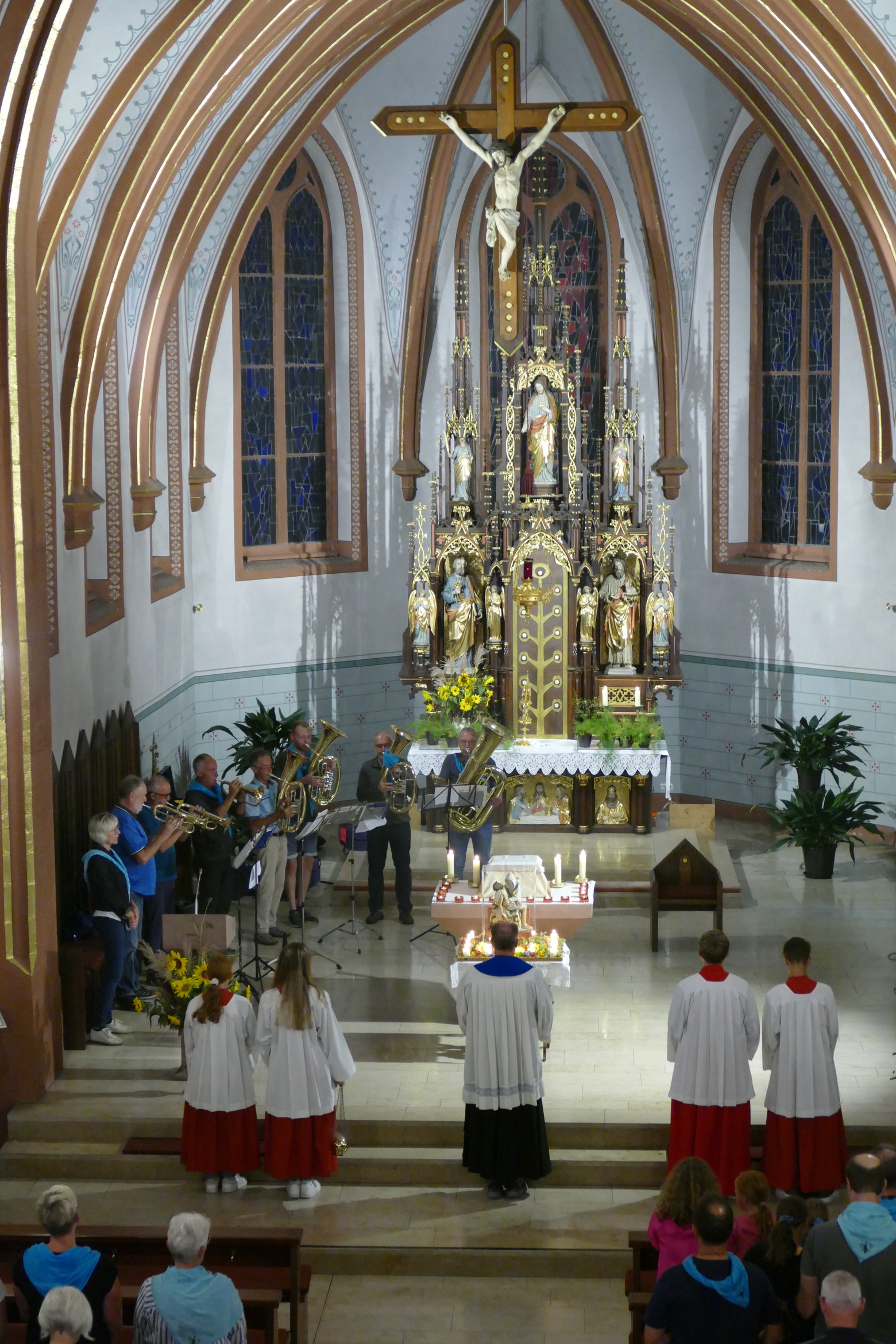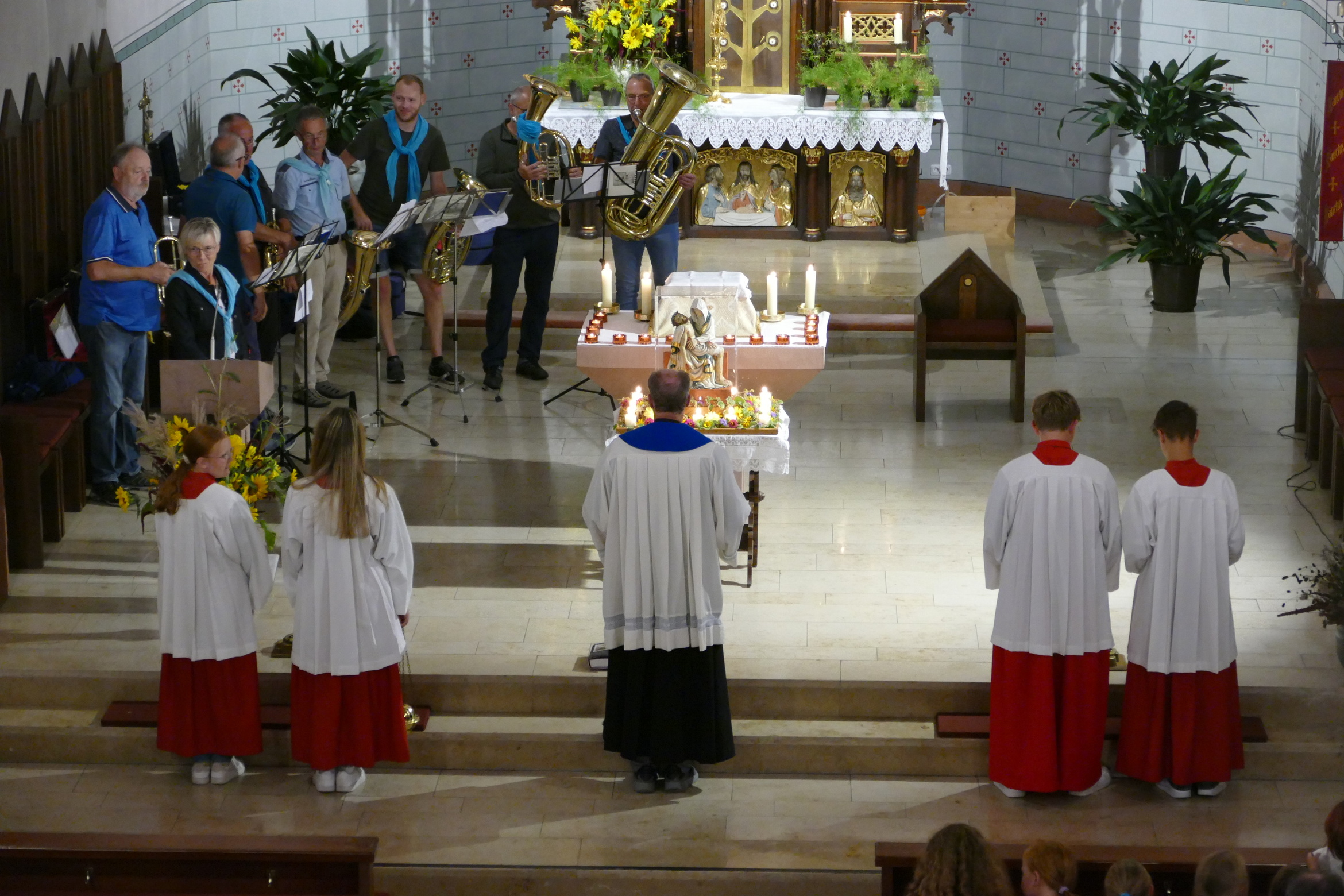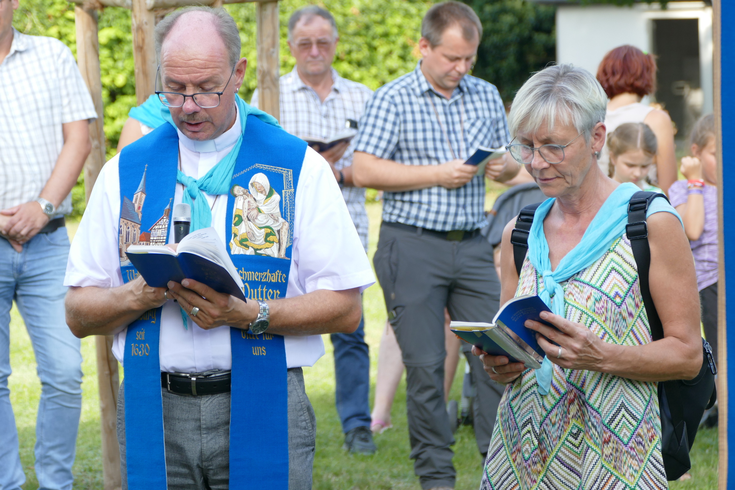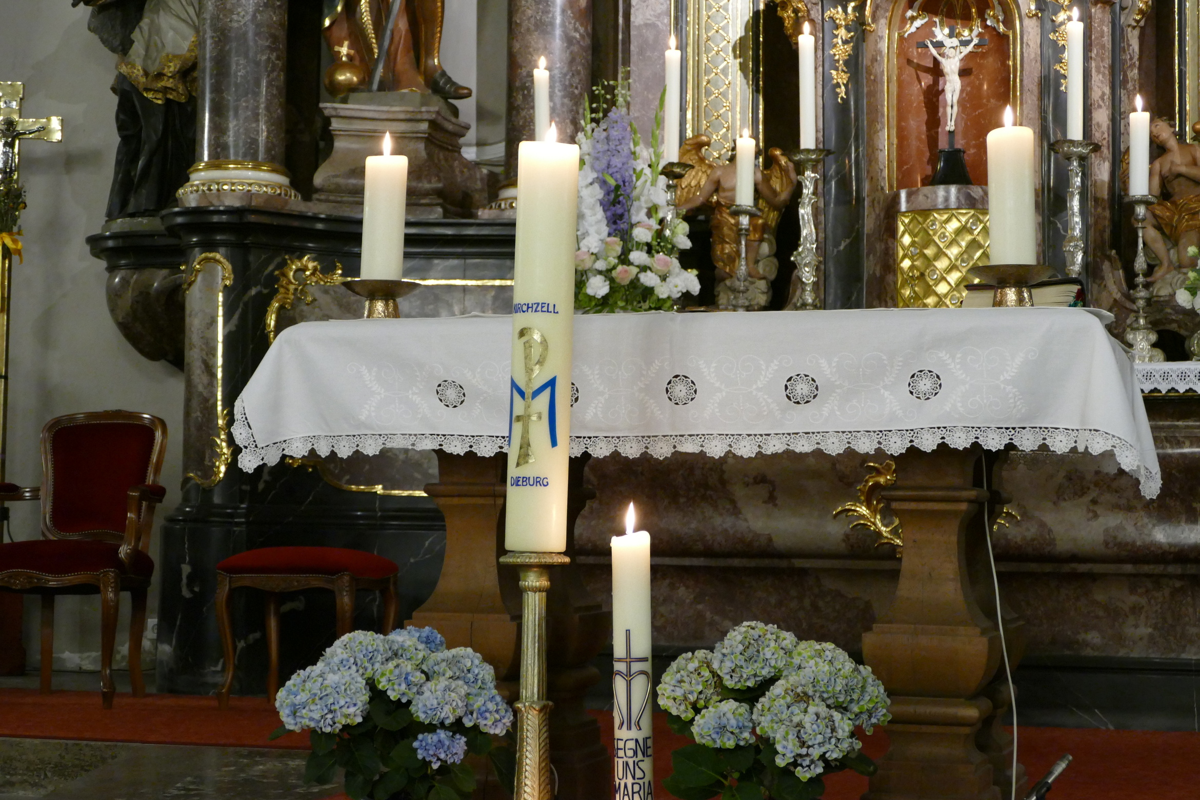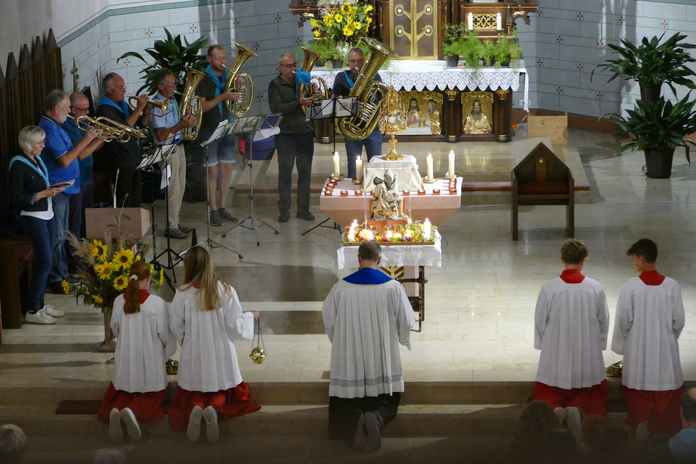 Pfarrer Alexander Vogel begrüßte die Wallfahrer und begleitet von den Dieburgbläsern und vielen weiteren Gemeindemitgliedern wurde betend und singend in die Gnadenkapelle eingezogen. Seit 1630, seither auch ununterbrochen, sind die Kirchzeller zum Fest Maria Geburt in Dieburg. Am Vortag, dem 07.September werden die Stationen zu den sieben Schmerzen Mariens gebetet, im Anschluss segnet Pfarrer Michael Prokschi die Kerzen und Wallfahrtsandenken. Am Abend ist dann der festliche Gottesdienst am Freialtar,m die beeindruckende Lichterprozession durch Dieburg schließt sich an. Am Festtag Maria Geburt ist um 7.00 Uhr das gelobte Amt der Kirchzeller, um 10.00 Uhr nochmal die Messe am Freialtar.