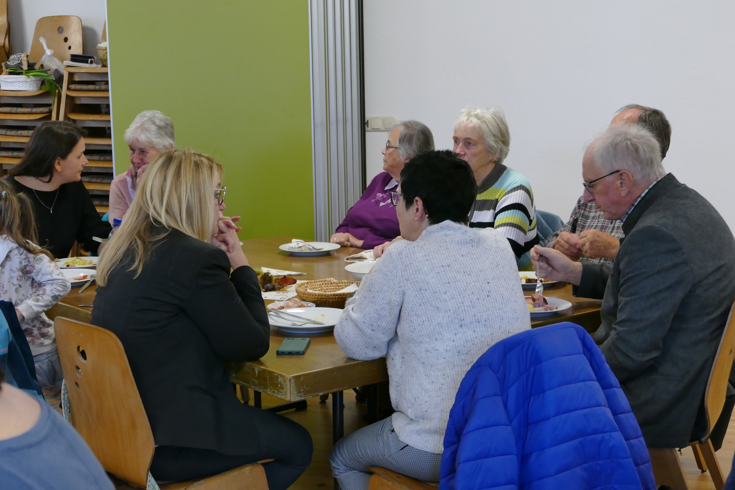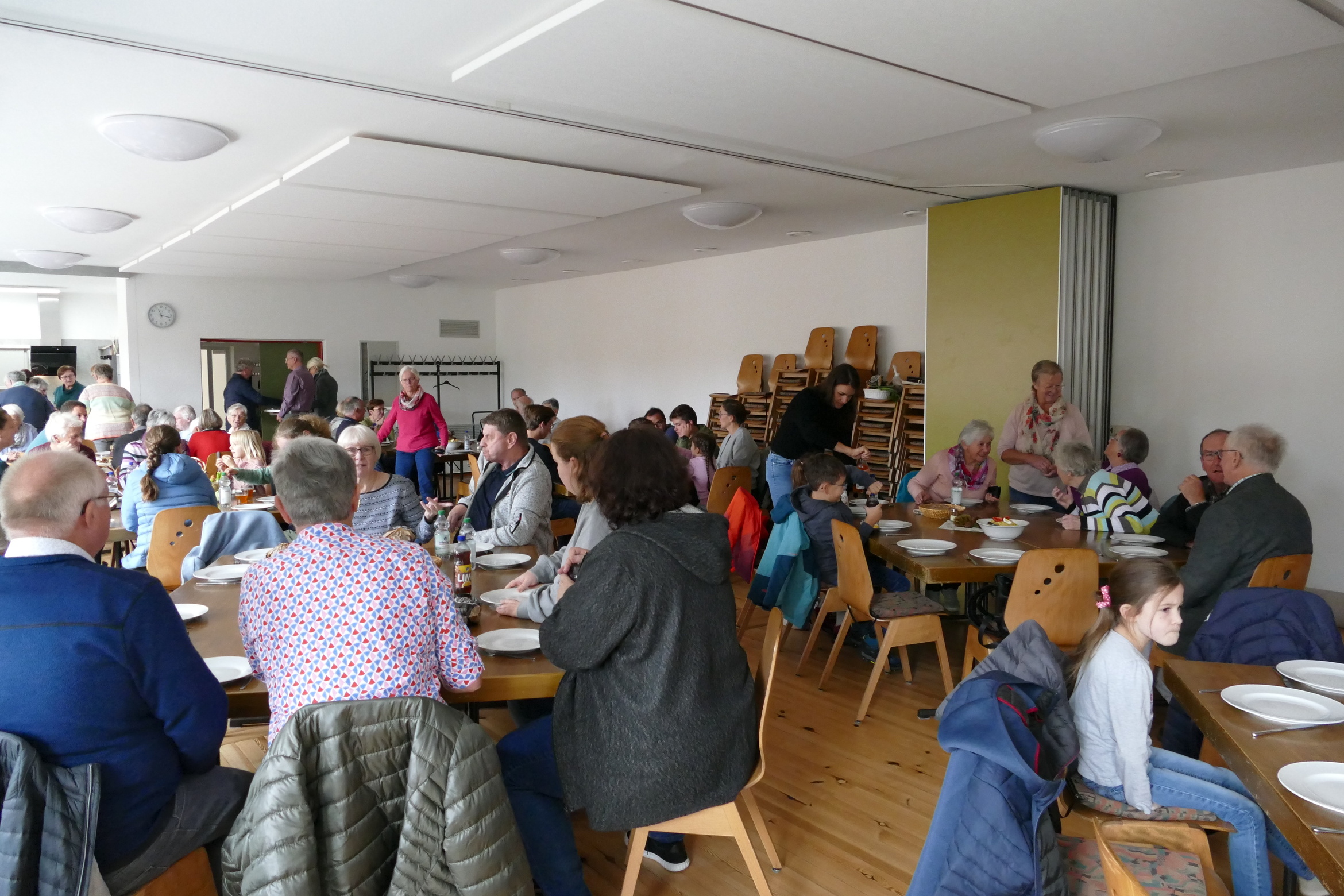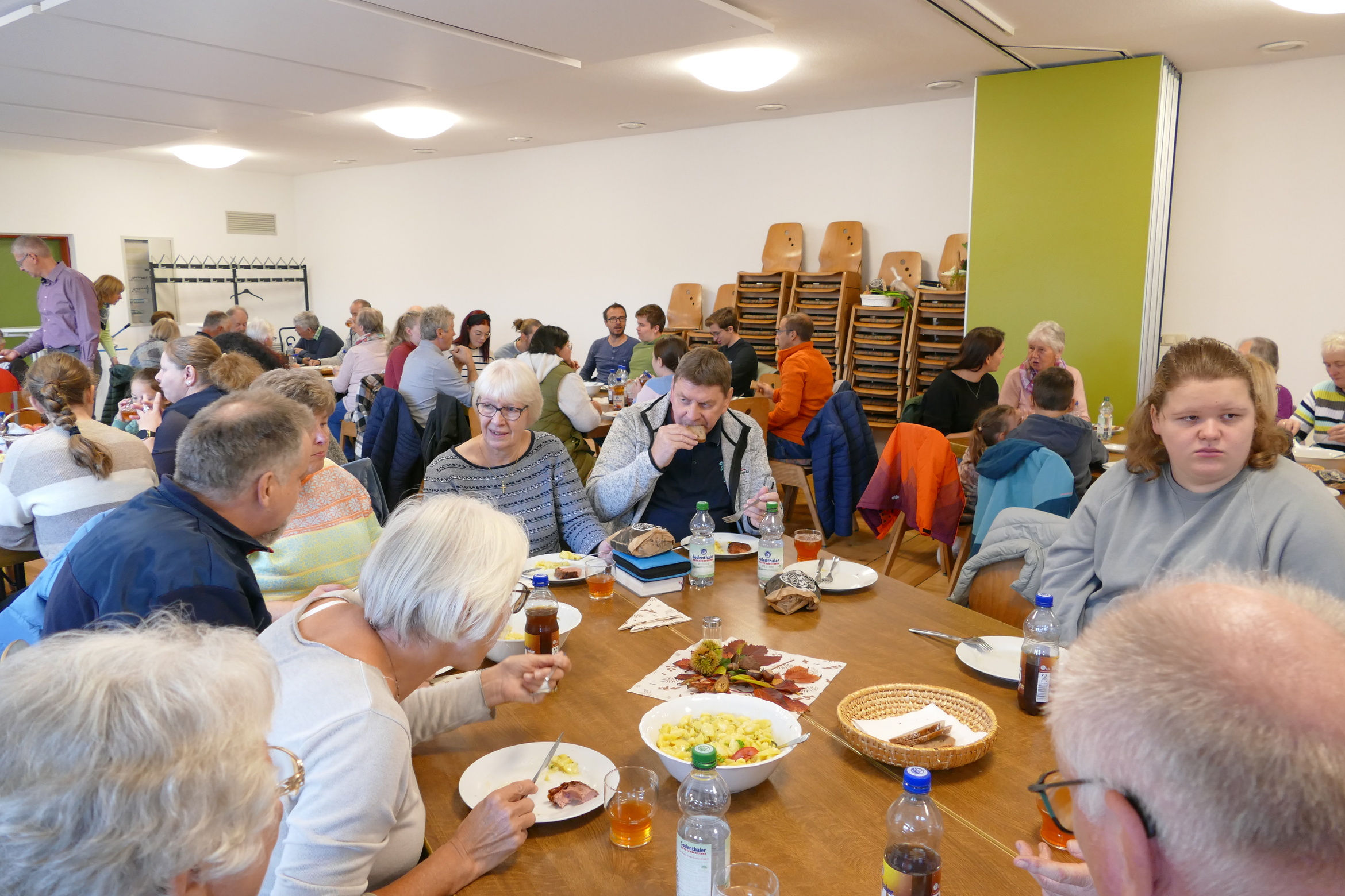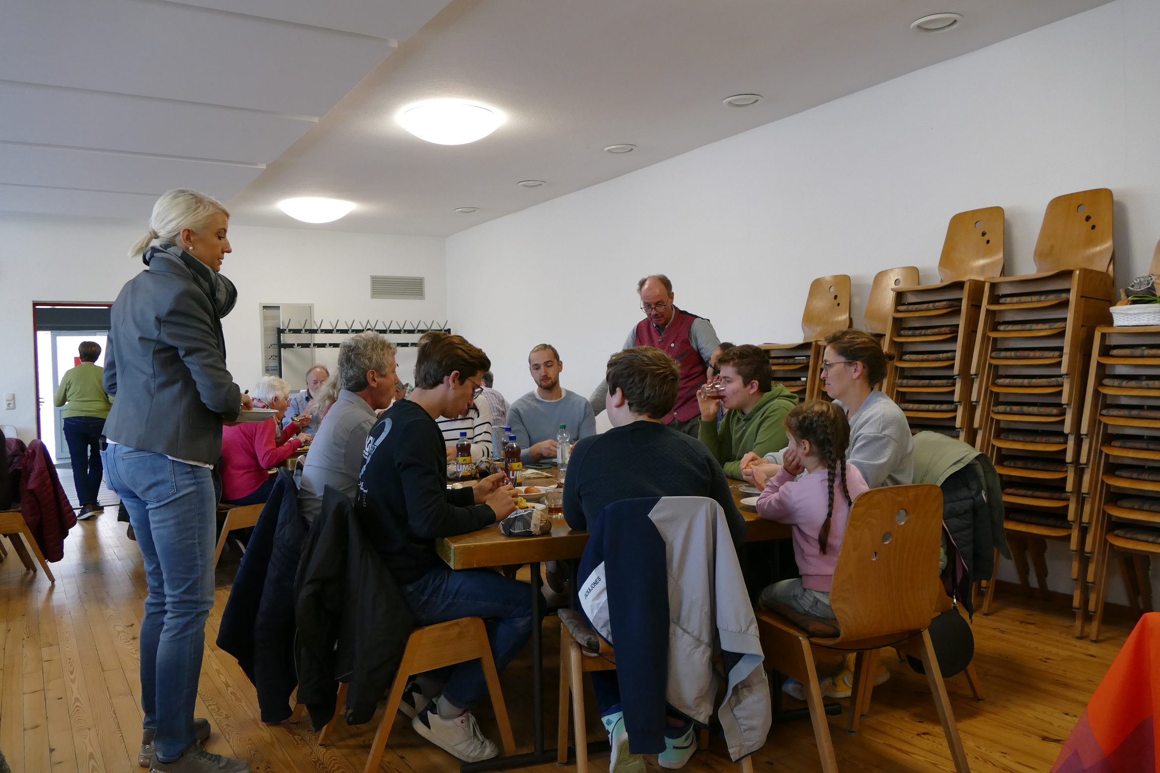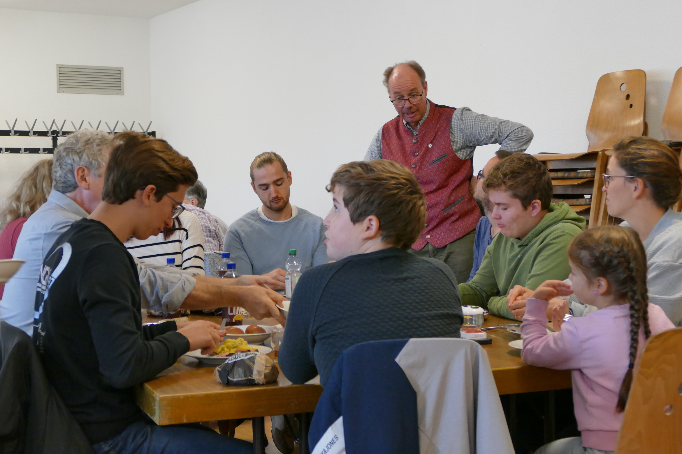 Nach dem Gottesdienst kamen viele Familien mit Kindern mit ins Pfarrheim um bei Kartoffelsalat, Leberkäse, Würstchen und gekochten Eiern noch den Mittag zusammen zu verbringen. Frischer Süßmost aus der Schrahmühle schmeckte nicht nur den Kleinen.