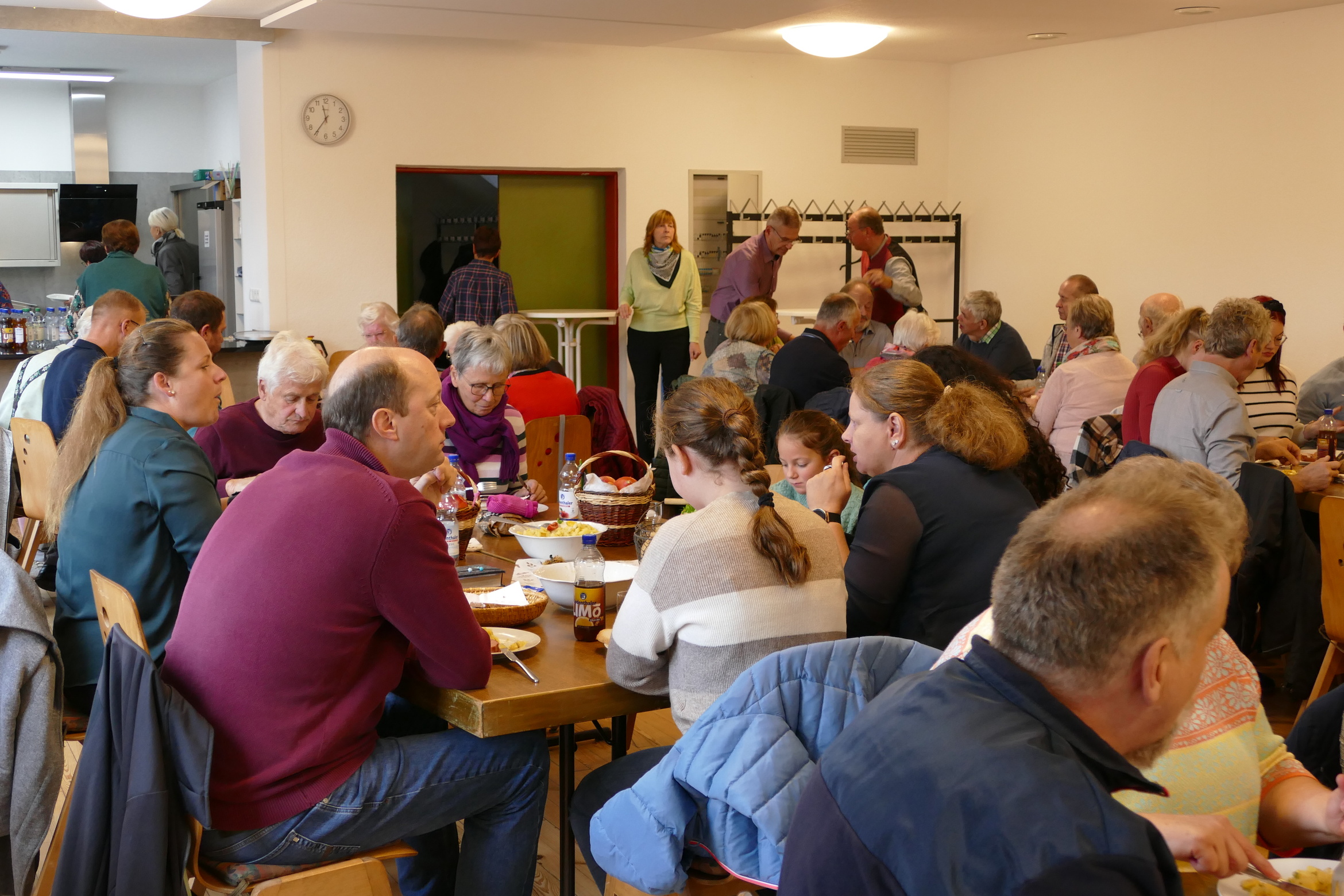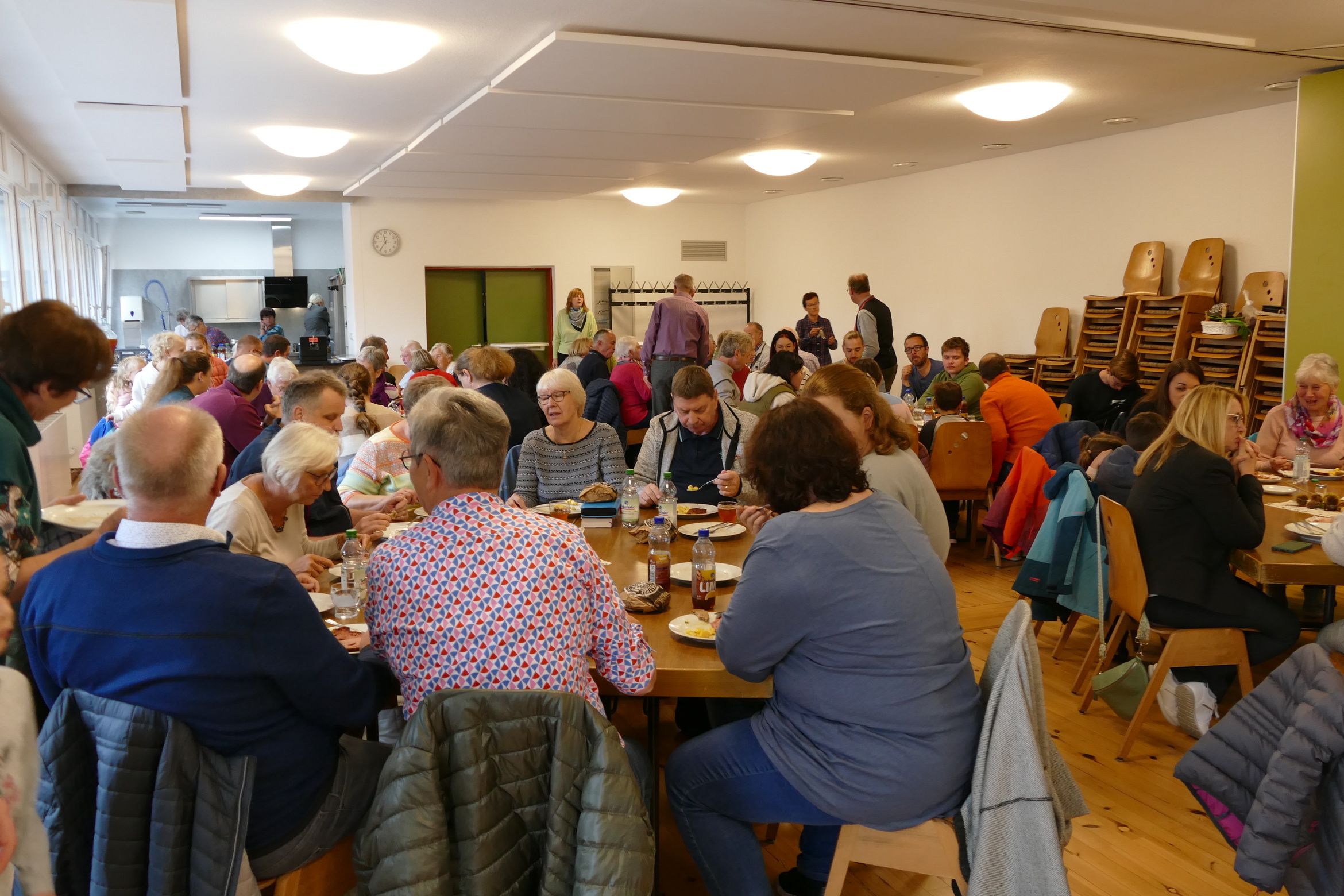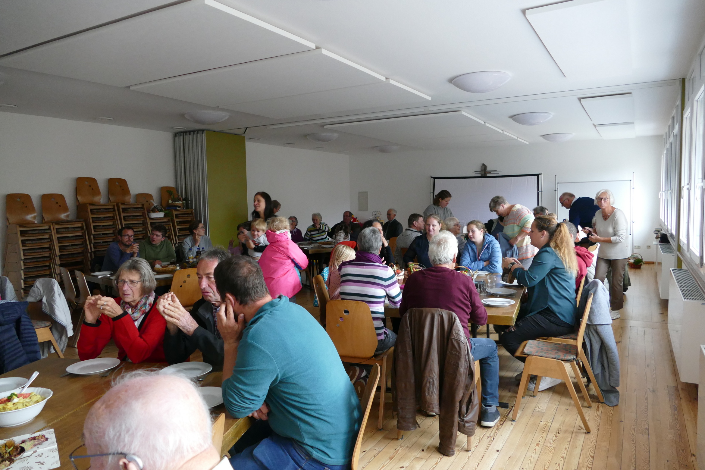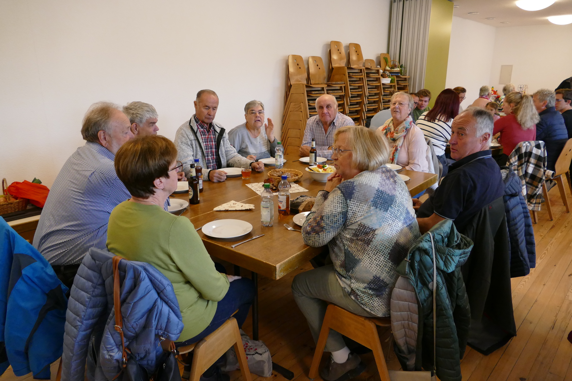 Nach dem Gottesdienst kamen viele Familien mit Kindern mit ins Pfarrheim um bei Kartoffelsalat, Leberkäse, Würstchen und gekochten Eiern noch den Mittag zusammen zu verbringen. Frischer Süßmost aus der Schrahmühle schmeckte nicht nur den Kleinen.