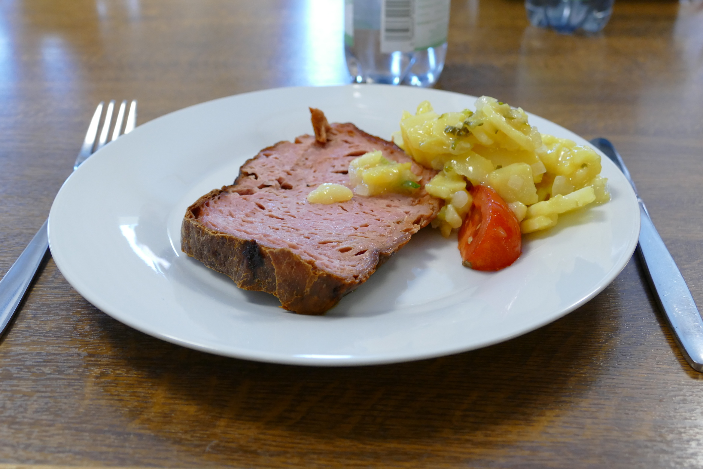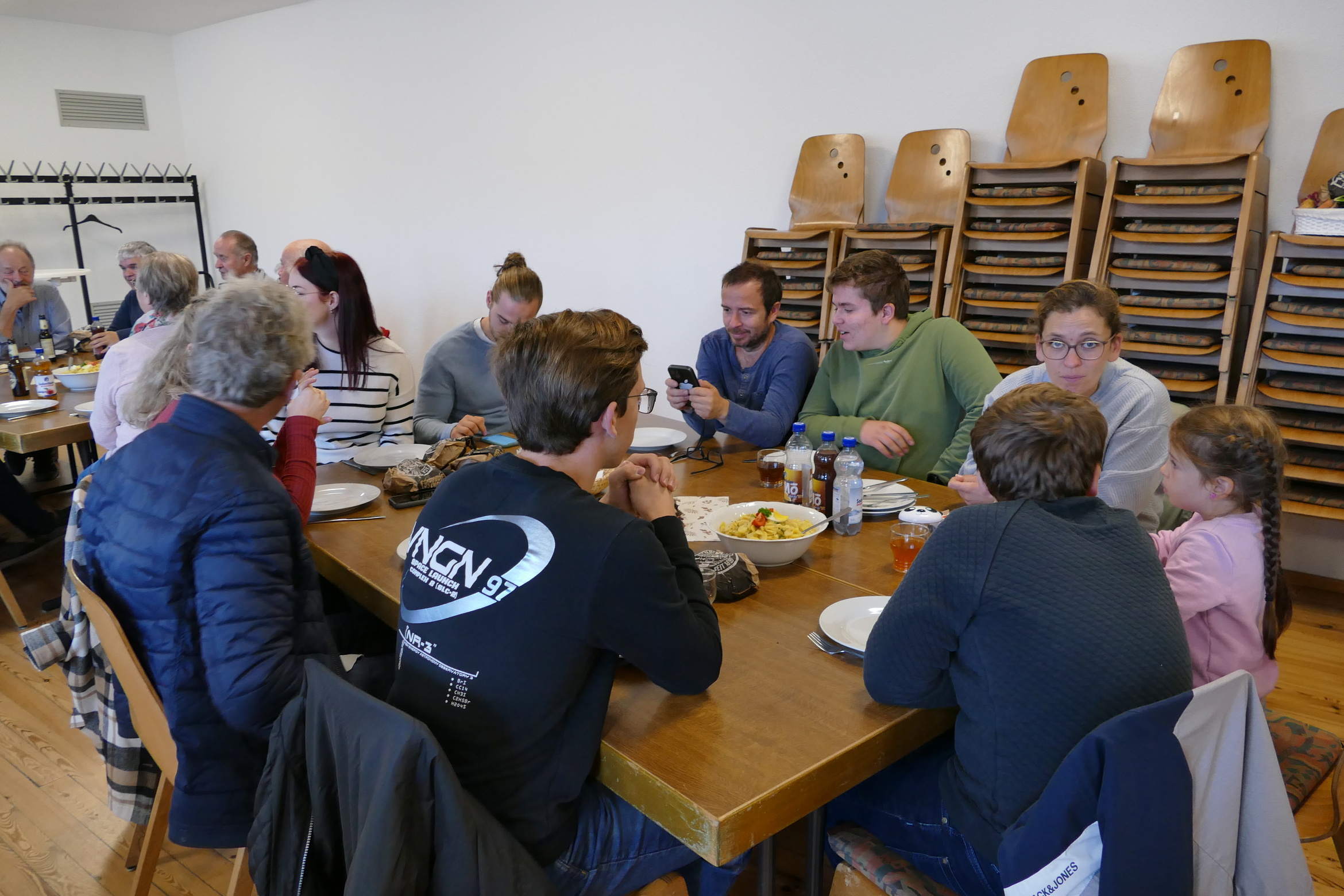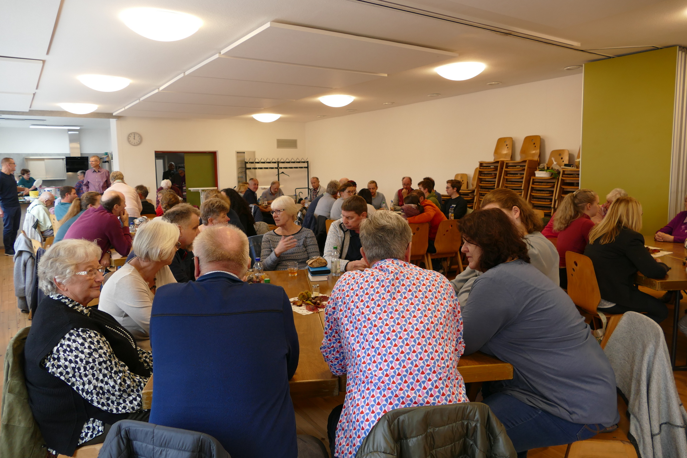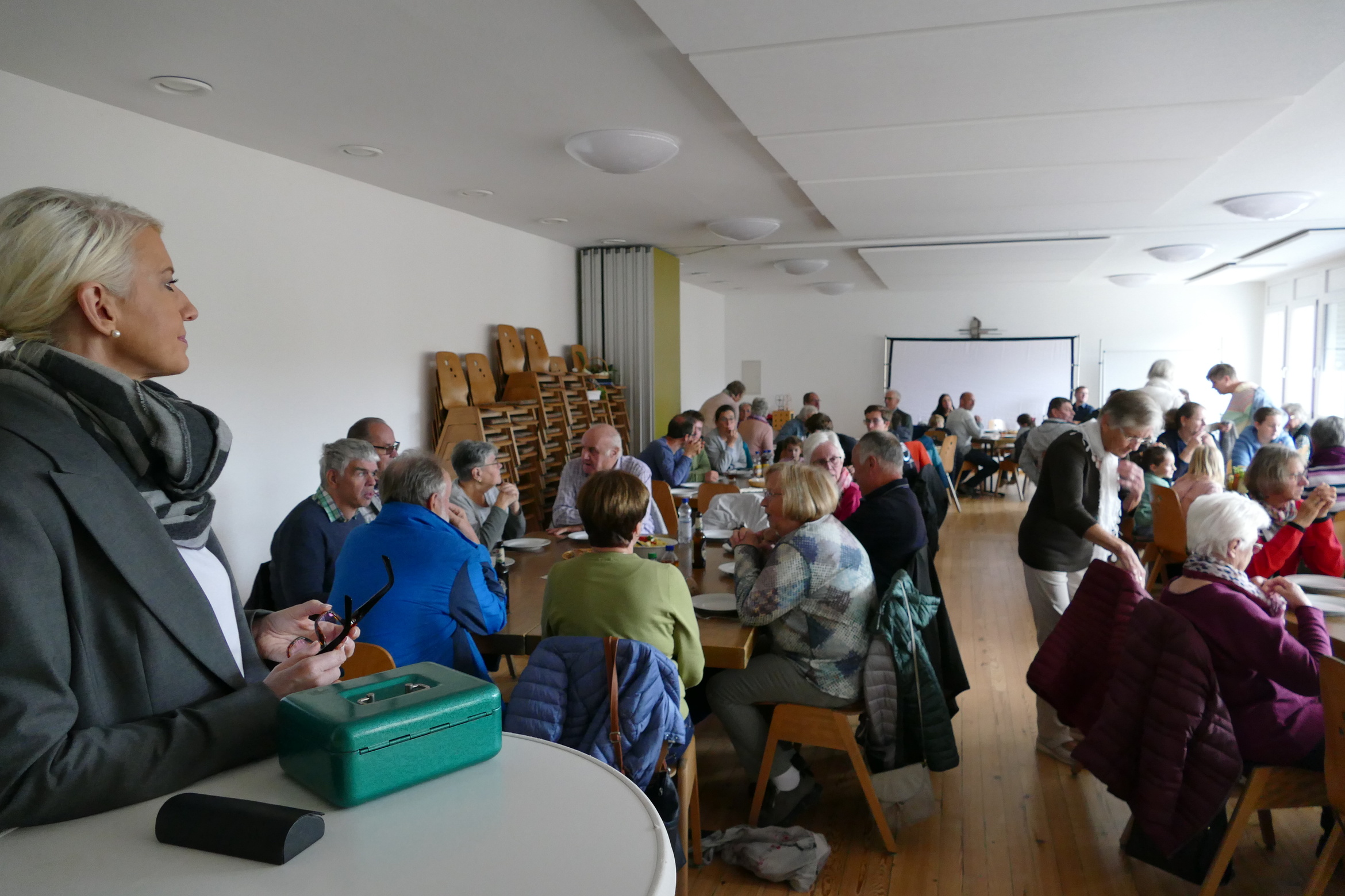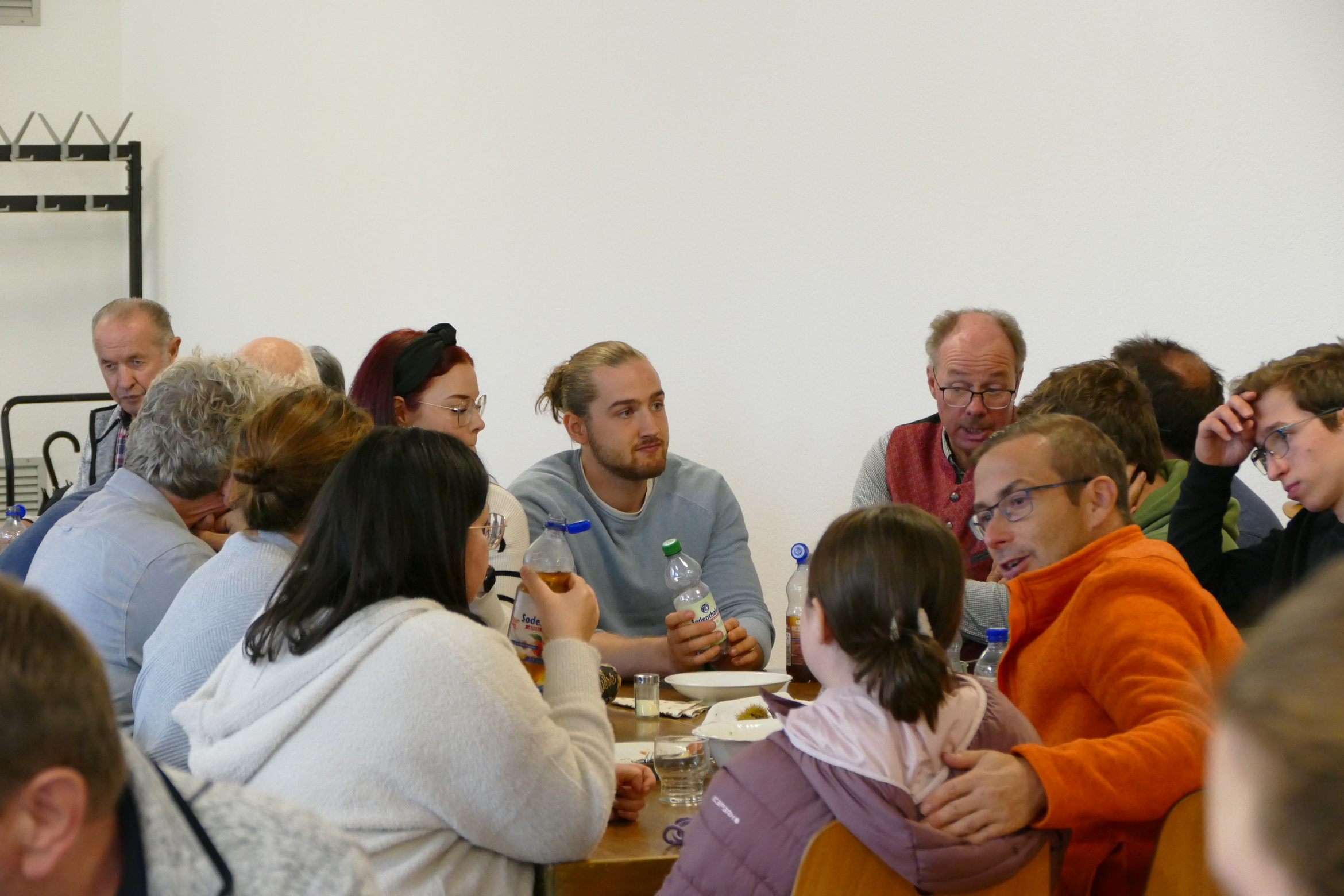 Nach dem Gottesdienst kamen viele Familien mit Kindern mit ins Pfarrheim um bei Kartoffelsalat, Leberkäse, Würstchen und gekochten Eiern noch den Mittag zusammen zu verbringen. Frischer Süßmost aus der Schrahmühle schmeckte nicht nur den Kleinen.