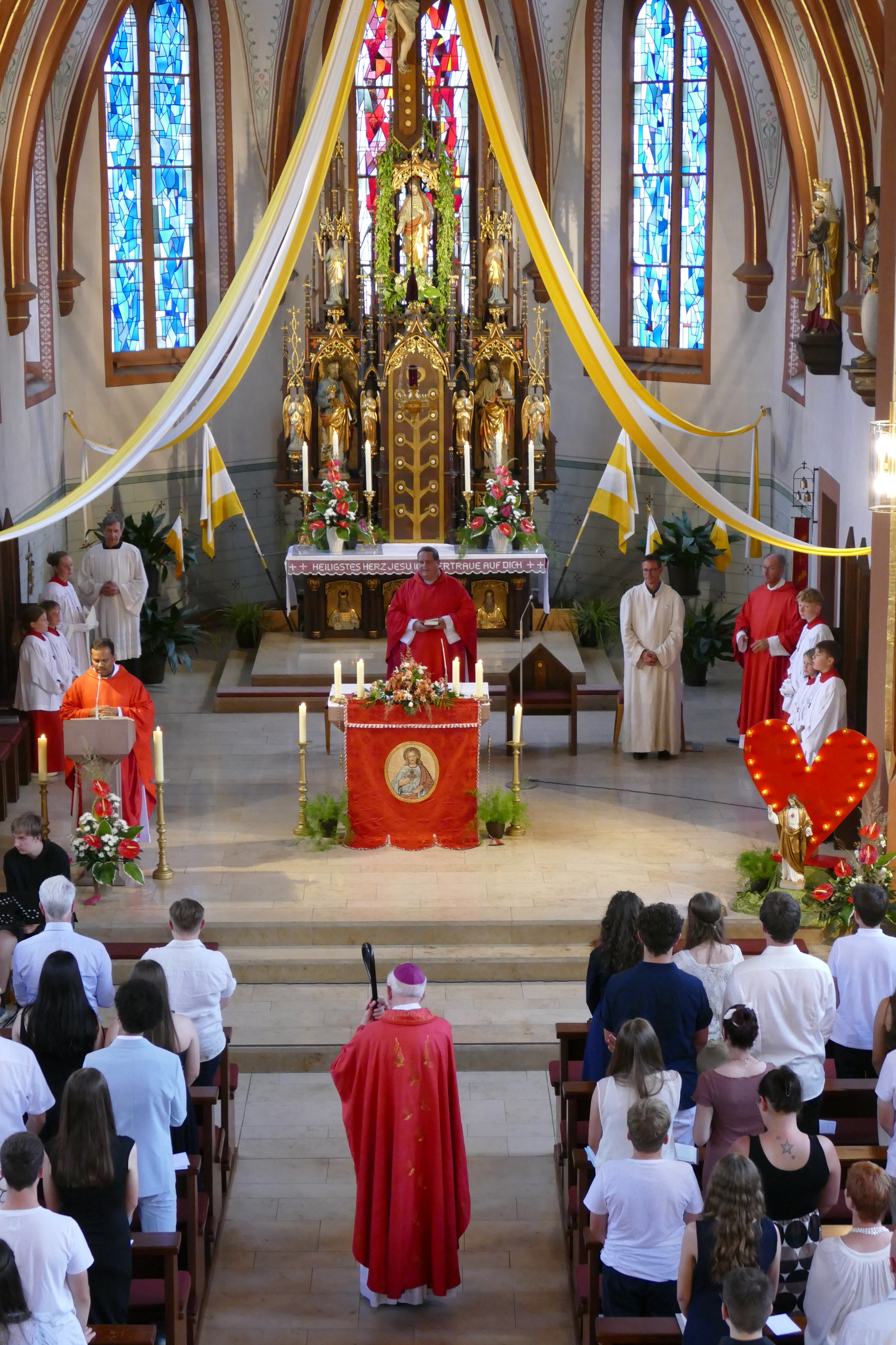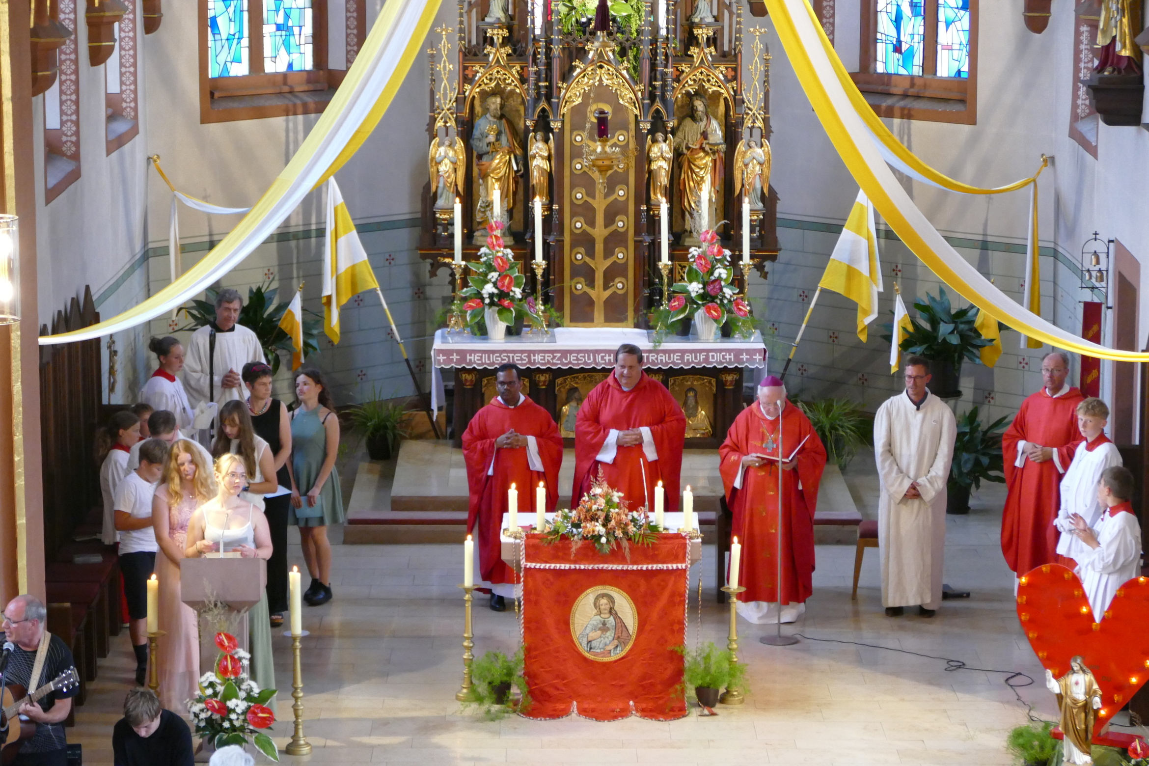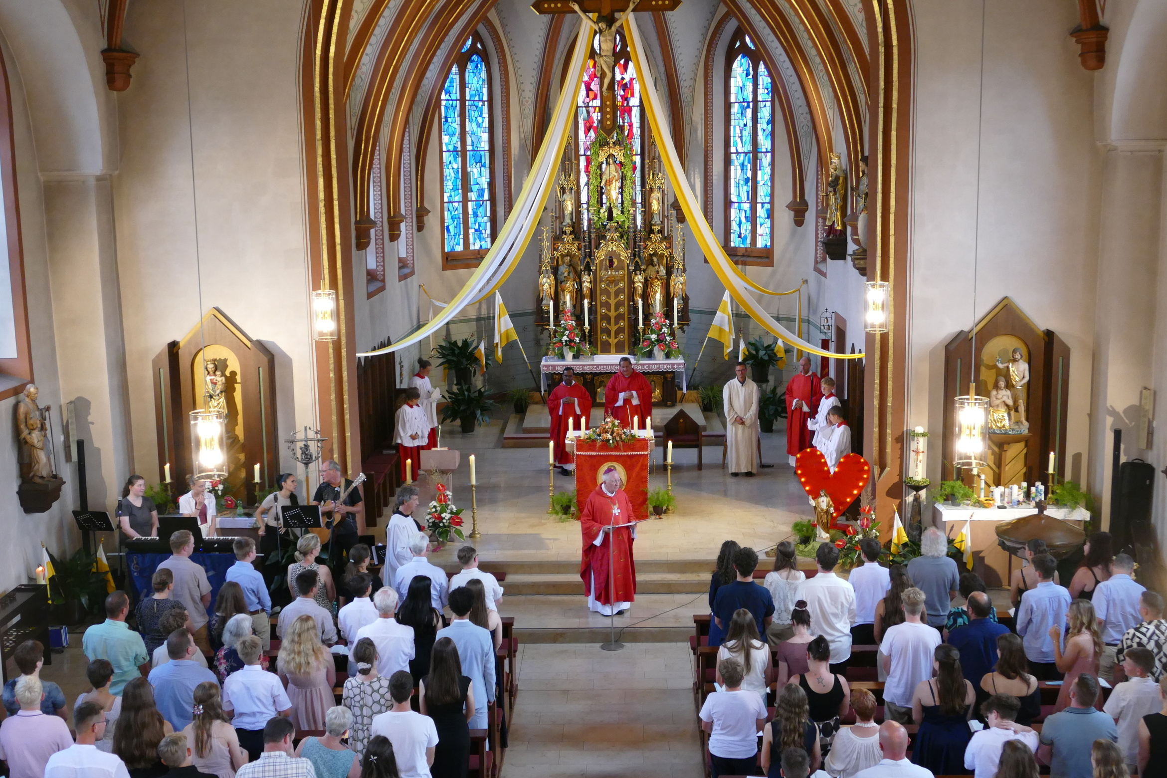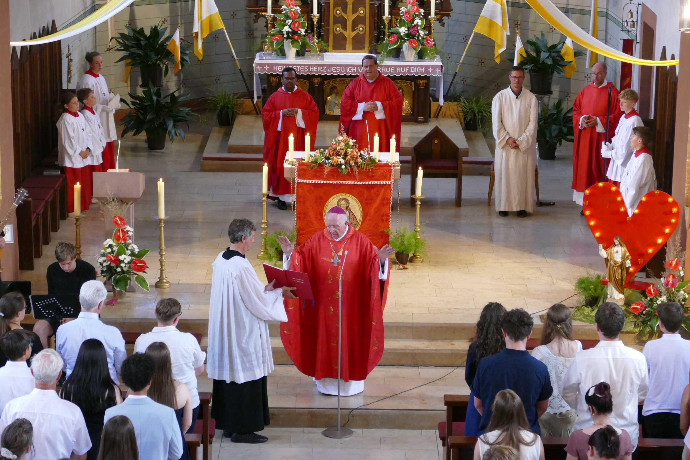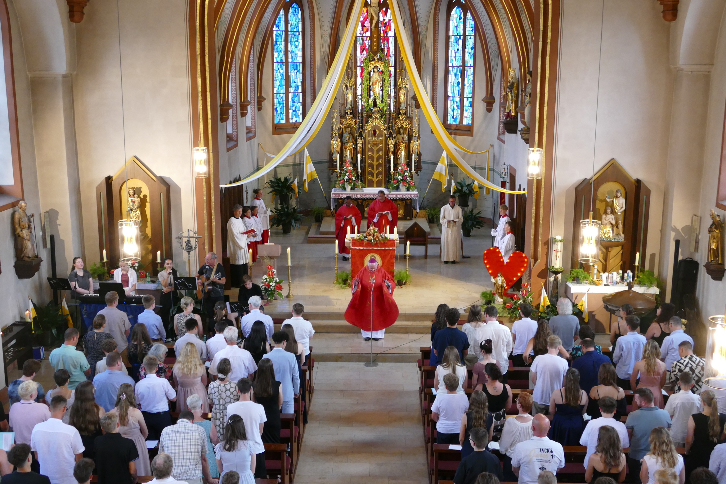 Bei schwül warmen Temperaturen war die Pfarrkirche Kirchzell gut gefüllt, die Band Terikto wie auch Marcel Markert an der Orgel gestalteten den Gottesdienst musikalisch mit. Weihbischof Boom wusste die Jugendlichen in seiner frei gehalteten Predigt direkt und persönlich anzusprechen. Hob das Plus im Glauben hervor, für welches sich zu leben lohnt. Im Blick auf das Herz Jesu wie auch die beiden Apostelfürsten Petrus und Paulus lud er ein, sich immer wieder einzusetzen, Liebe zu schenken und auch bei Zweifel und Wankelmut auf Christus zu blicken.