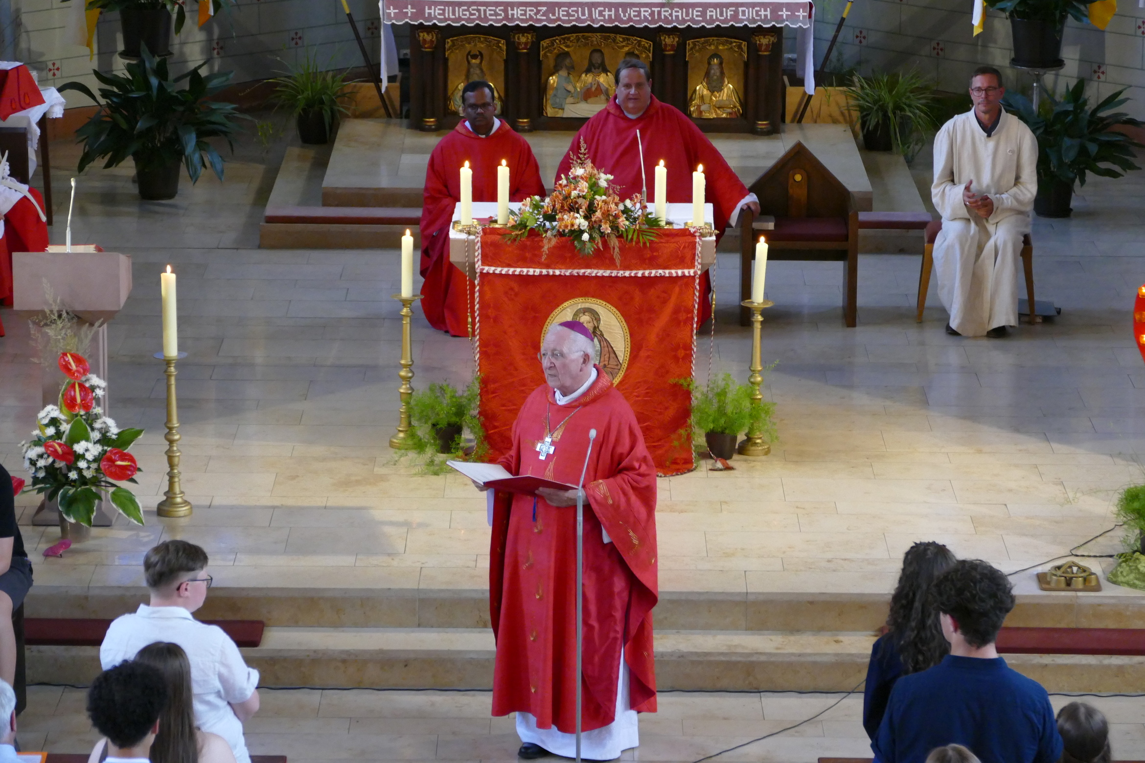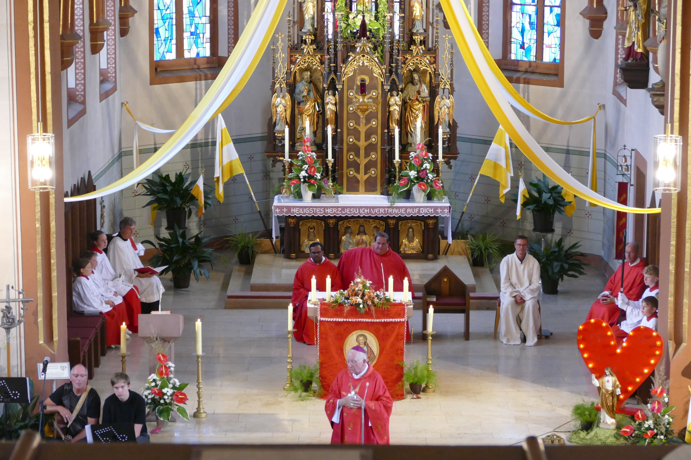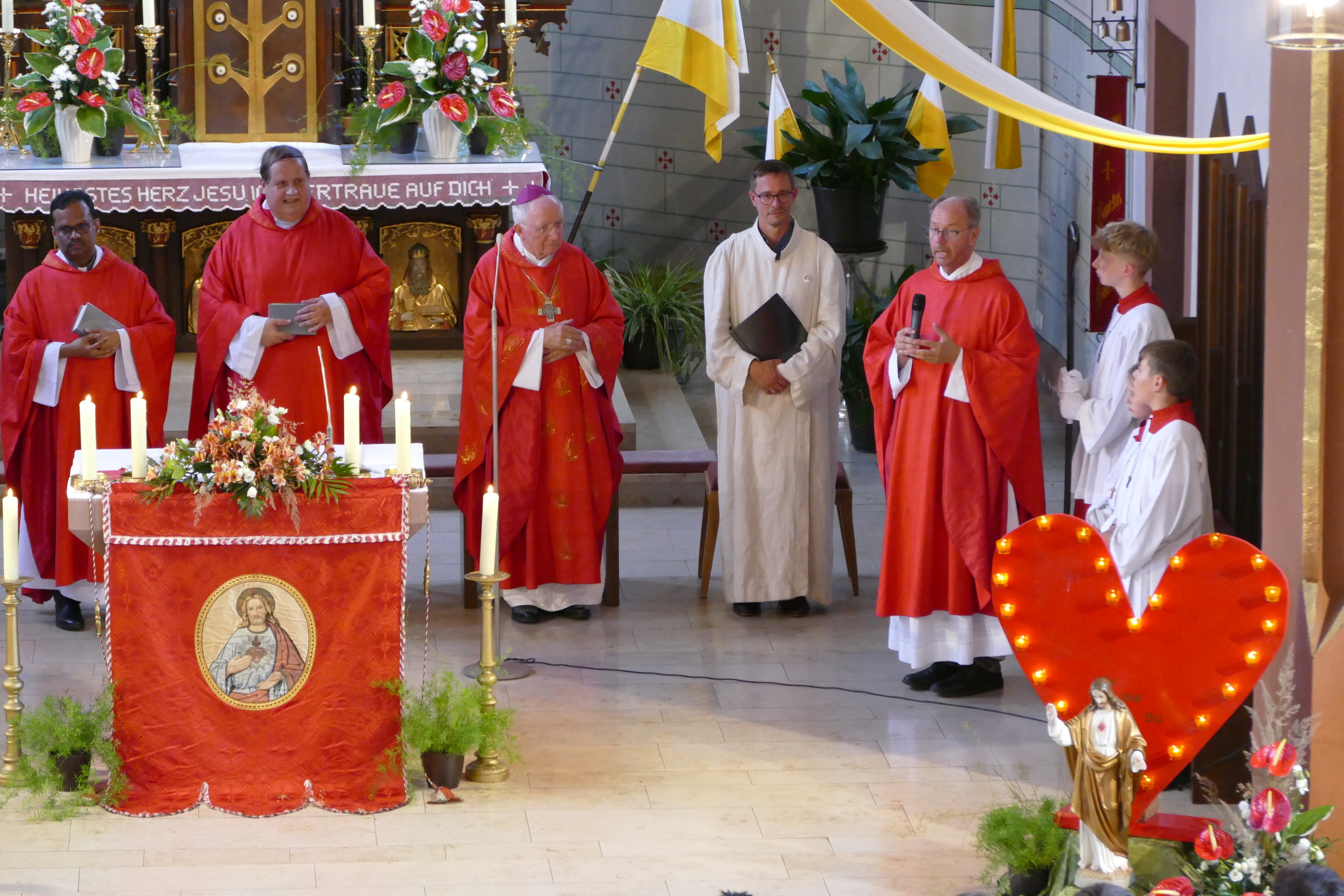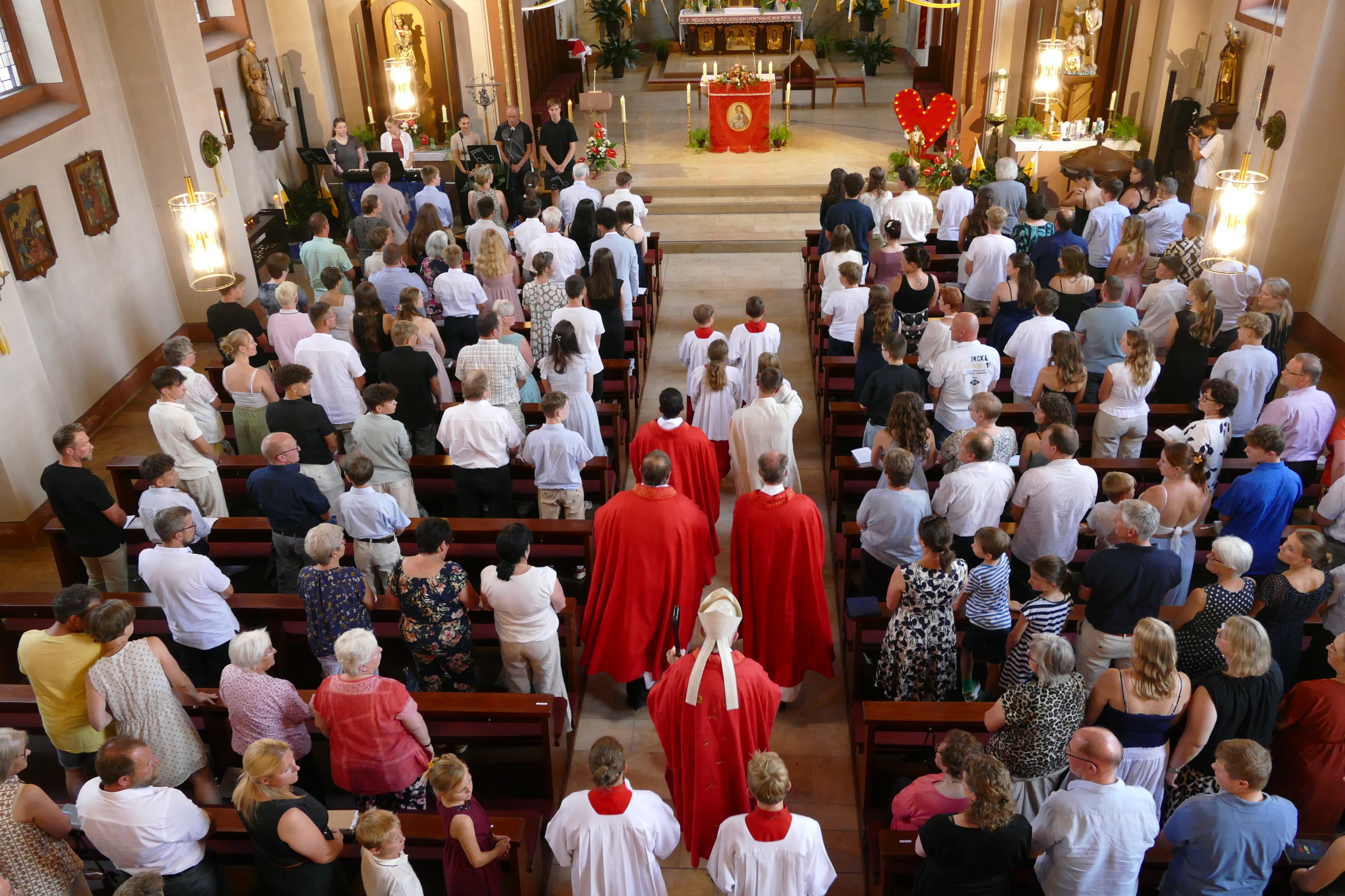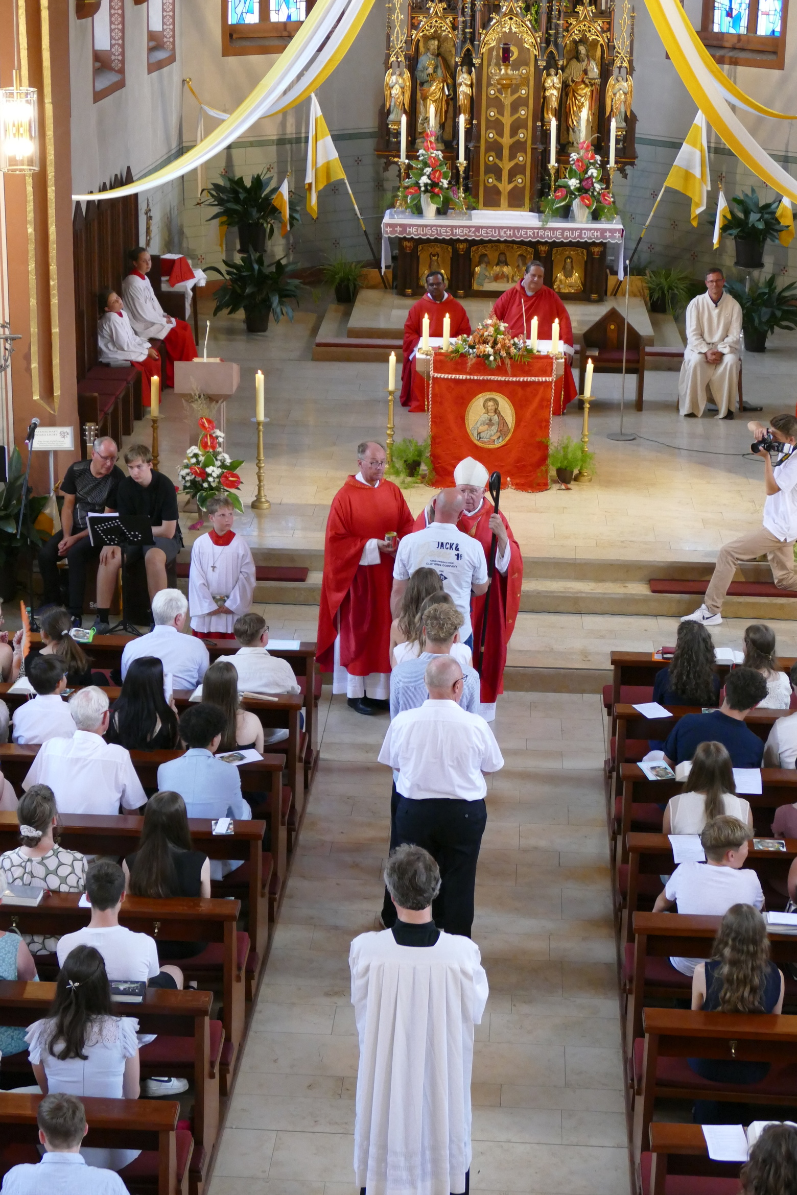 Bei schwül warmen Temperaturen war die Pfarrkirche Kirchzell gut gefüllt, die Band Terikto wie auch Marcel Markert an der Orgel gestalteten den Gottesdienst musikalisch mit. Weihbischof Boom wusste die Jugendlichen in seiner frei gehalteten Predigt direkt und persönlich anzusprechen. Hob das Plus im Glauben hervor, für welches sich zu leben lohnt. Im Blick auf das Herz Jesu wie auch die beiden Apostelfürsten Petrus und Paulus lud er ein, sich immer wieder einzusetzen, Liebe zu schenken und auch bei Zweifel und Wankelmut auf Christus zu blicken.