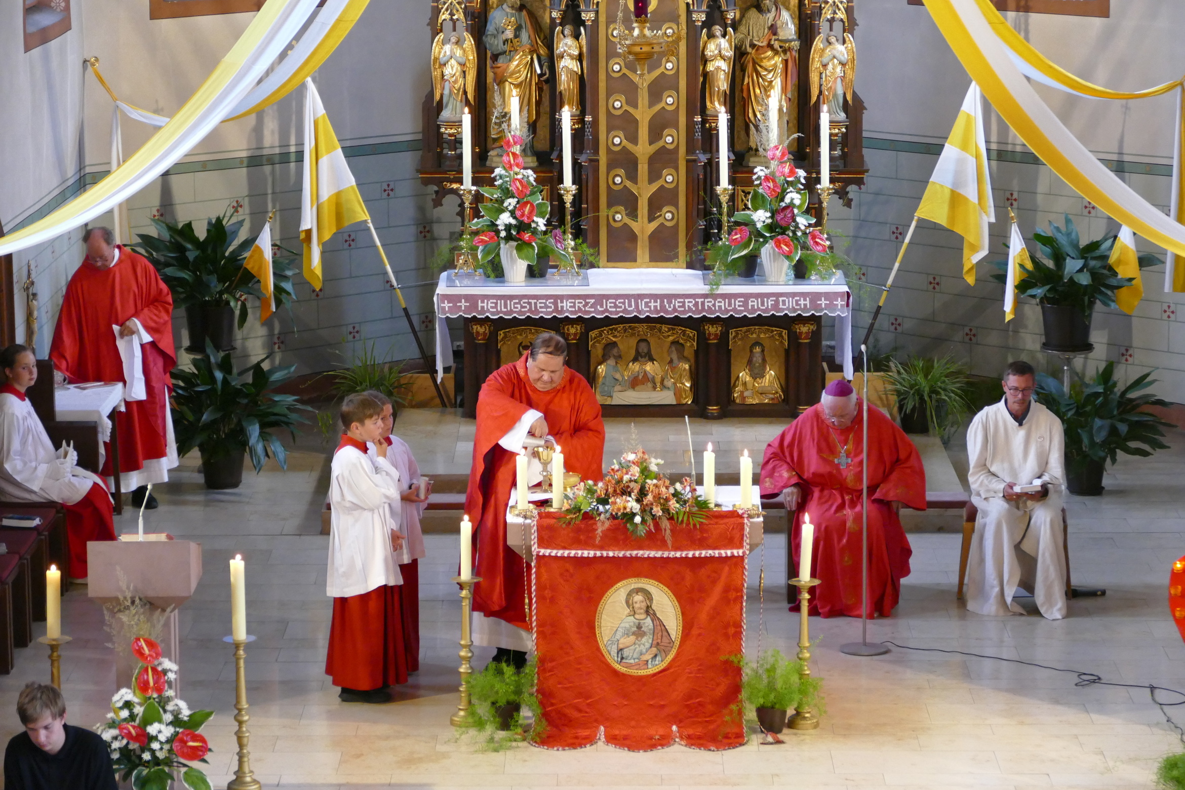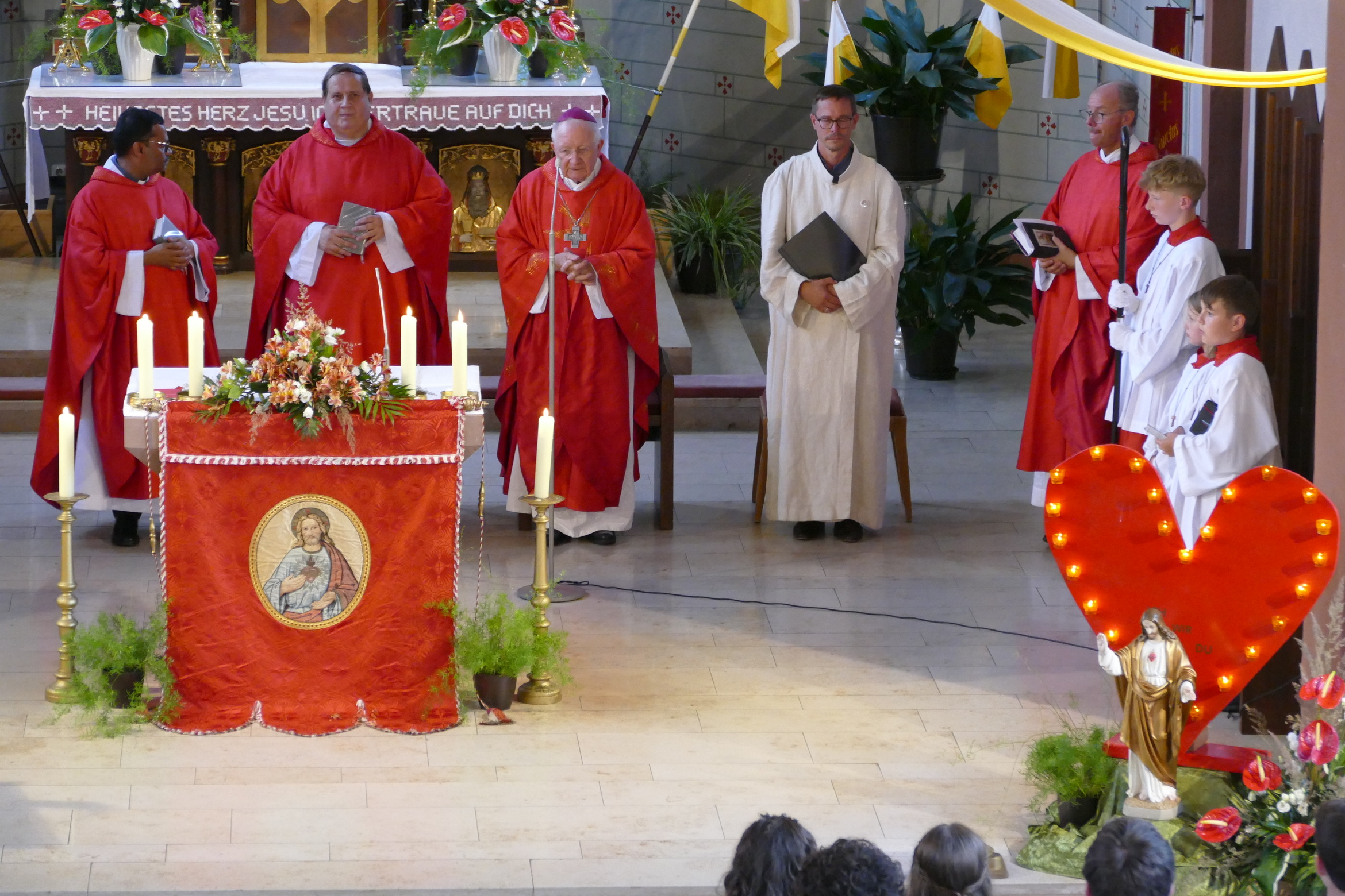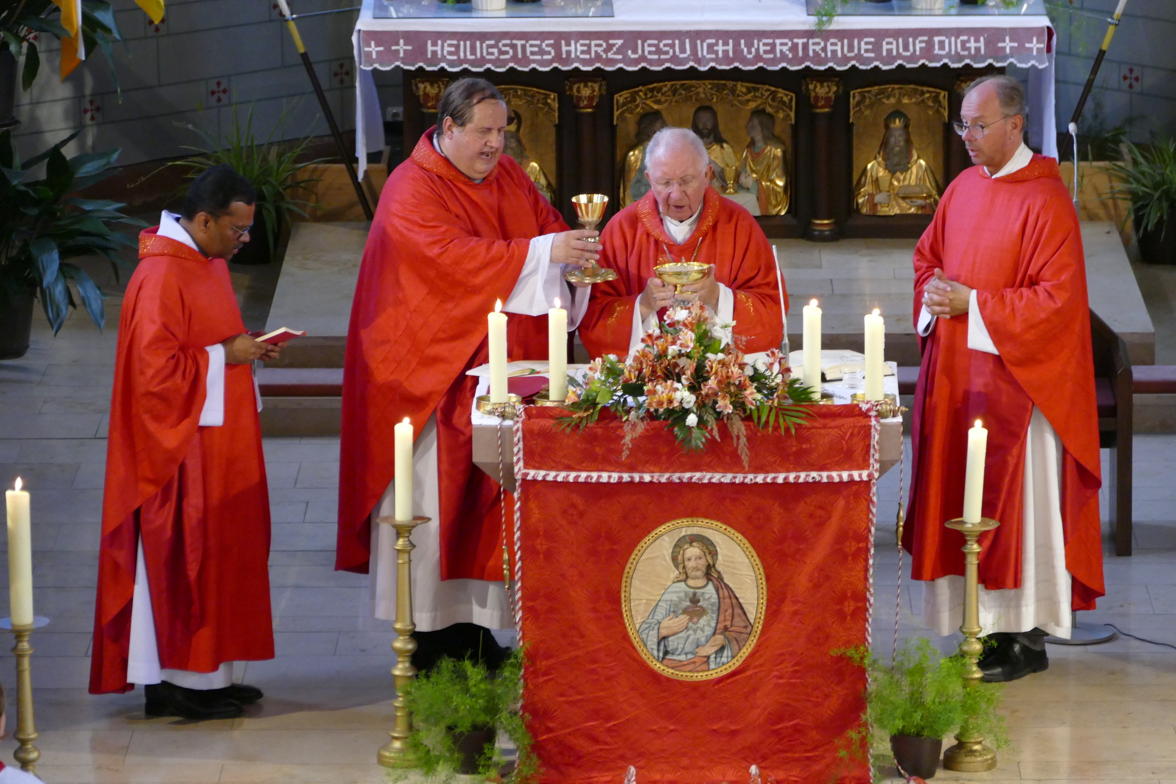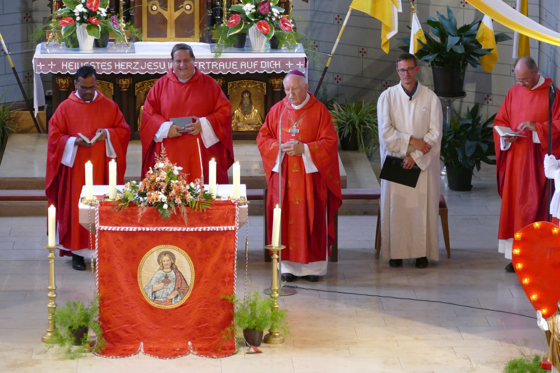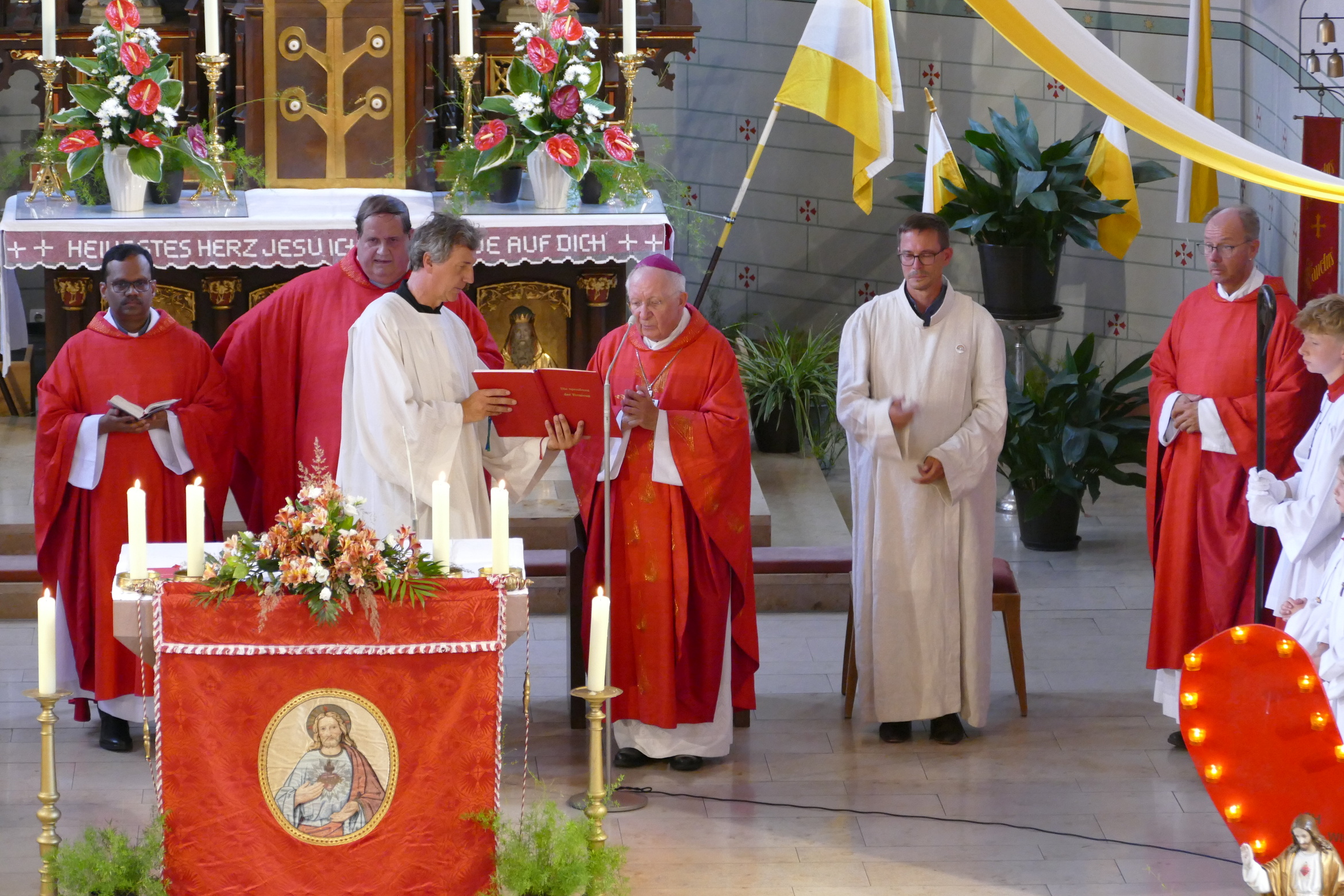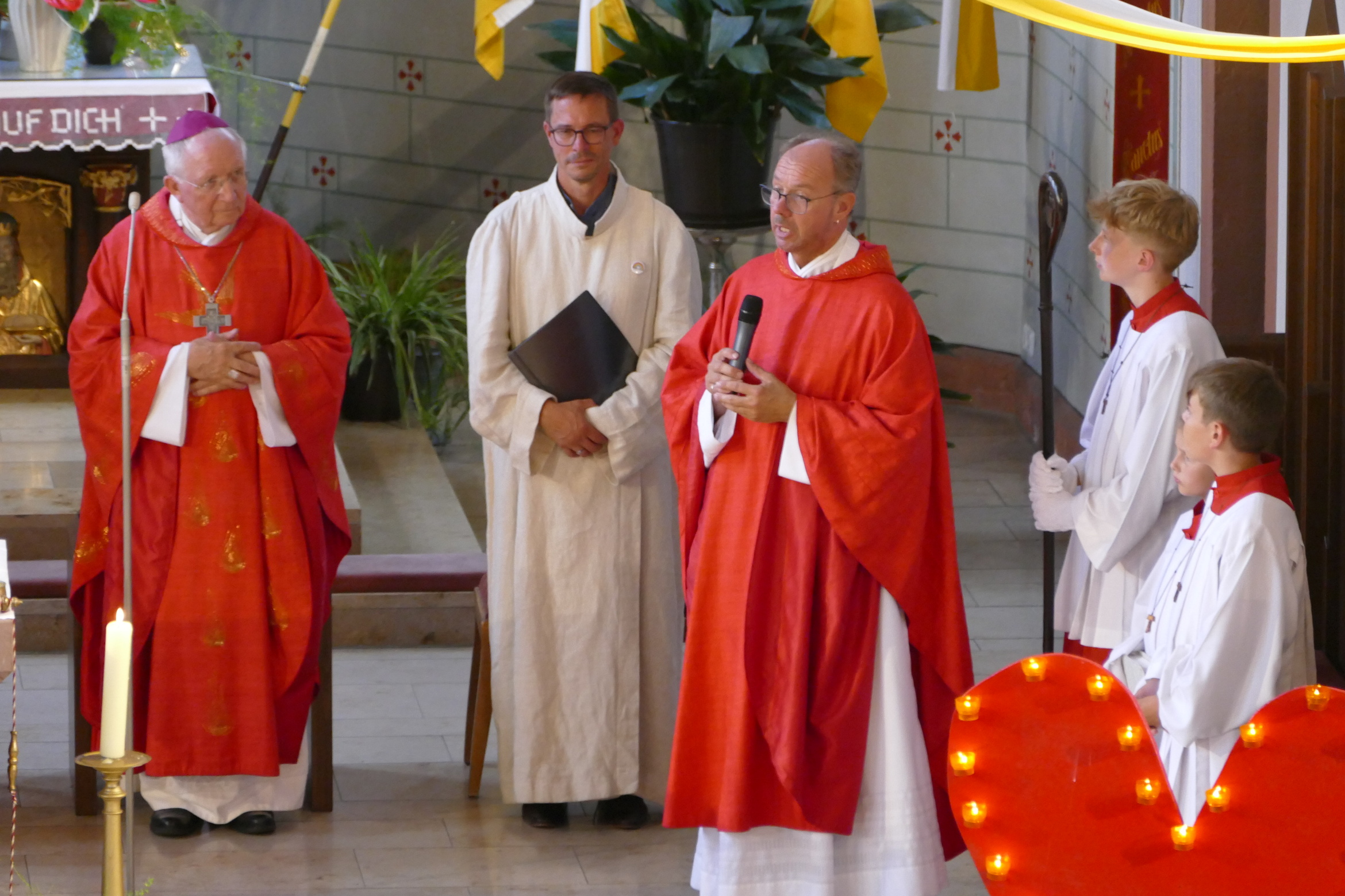 Bei schwül warmen Temperaturen war die Pfarrkirche Kirchzell gut gefüllt, die Band Terikto wie auch Marcel Markert an der Orgel gestalteten den Gottesdienst musikalisch mit. Weihbischof Boom wusste die Jugendlichen in seiner frei gehalteten Predigt direkt und persönlich anzusprechen. Hob das Plus im Glauben hervor, für welches sich zu leben lohnt. Im Blick auf das Herz Jesu wie auch die beiden Apostelfürsten Petrus und Paulus lud er ein, sich immer wieder einzusetzen, Liebe zu schenken und auch bei Zweifel und Wankelmut auf Christus zu blicken.
