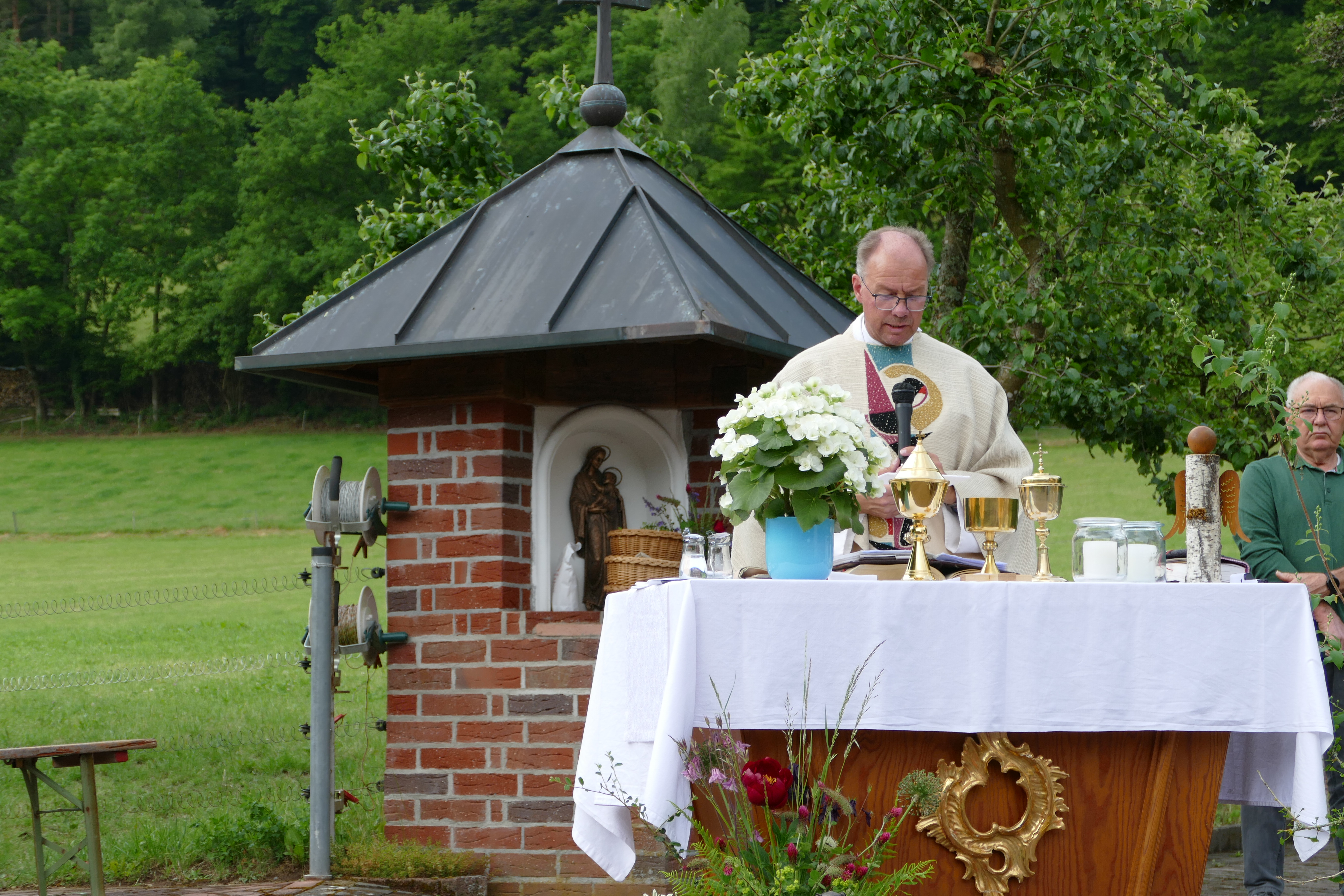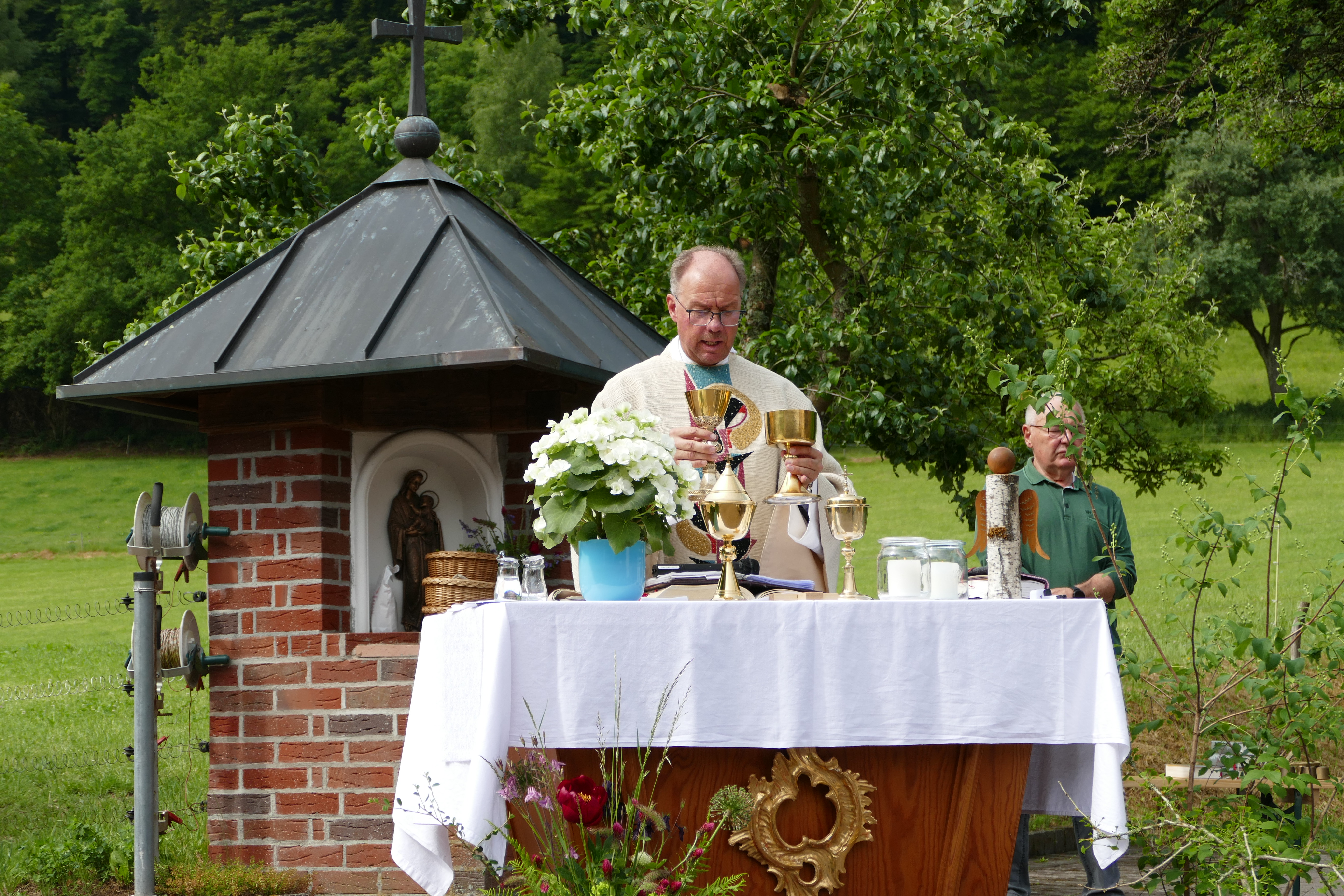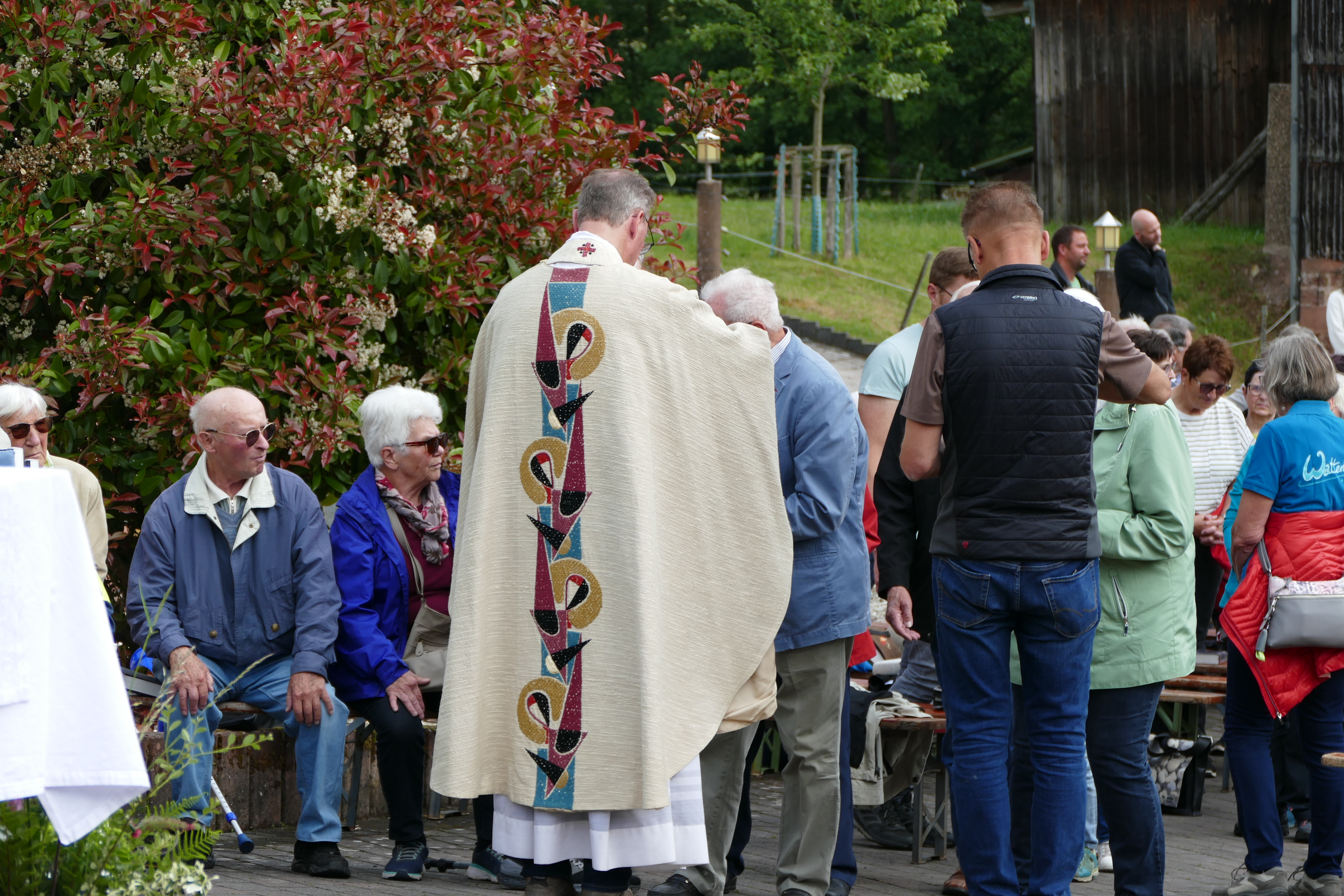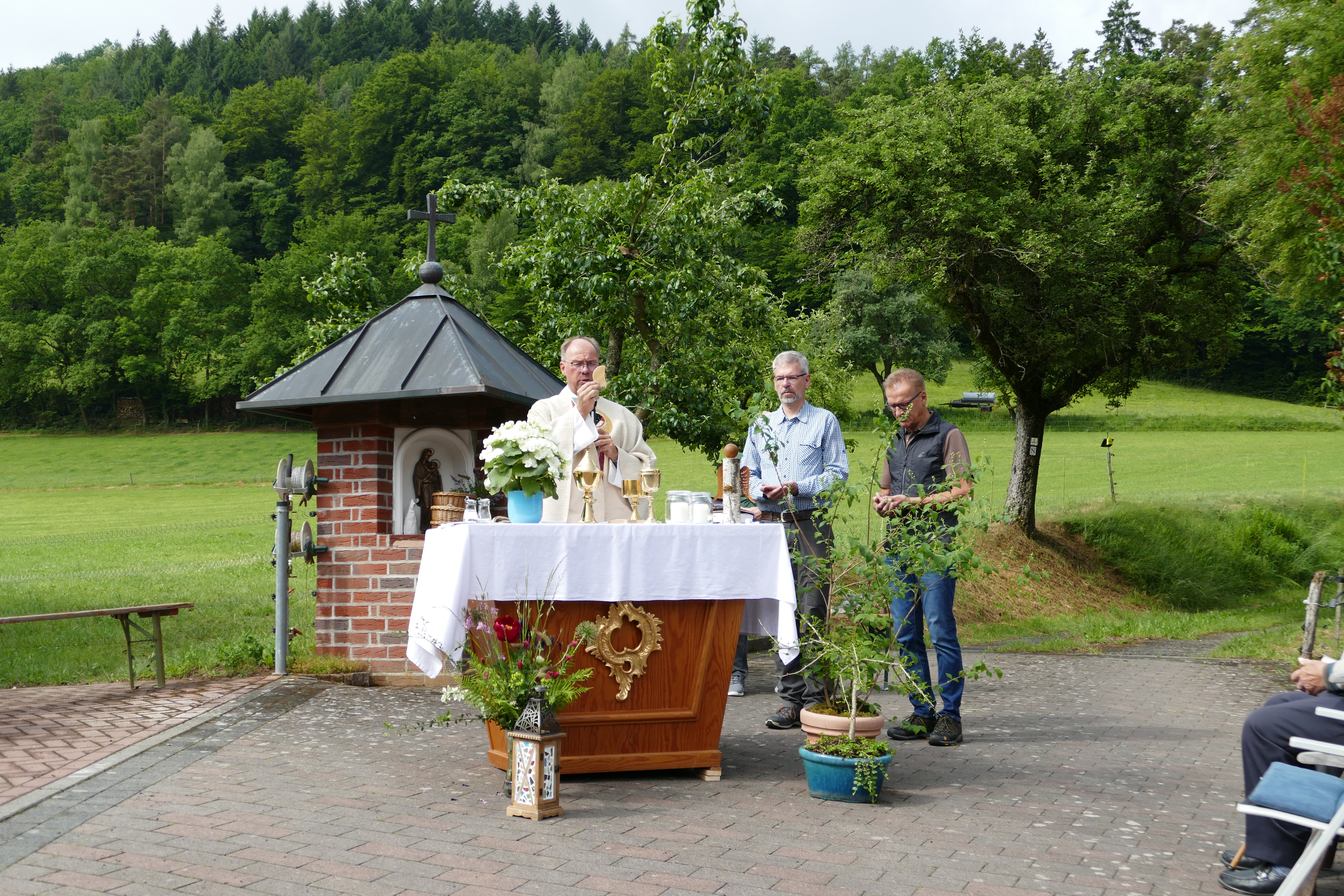 Bei trockenem Wetter, unterstützt und begleitet von einer Bläsergruppe, haben sich viele Beterinnen und Beter an Christi Himmelfahrt auf den Weg gemacht zur idyllischen Hofmühle. In Buch an der Kirche begrüßte Pfarrer Michael Prokschi die Gemeinde und stimmte auf den gemeinsamen Weg ein. Über die Felder ging es betend und singend Richtung Hofmühle, dort, vor dem Bildstock war der Altar aufgebaut und in großer Gemeinde wurde die Eucharistie gefeiert. Mit dem Wettersegen und dem feierlichen Te Deum schloss der Gottesdienst.