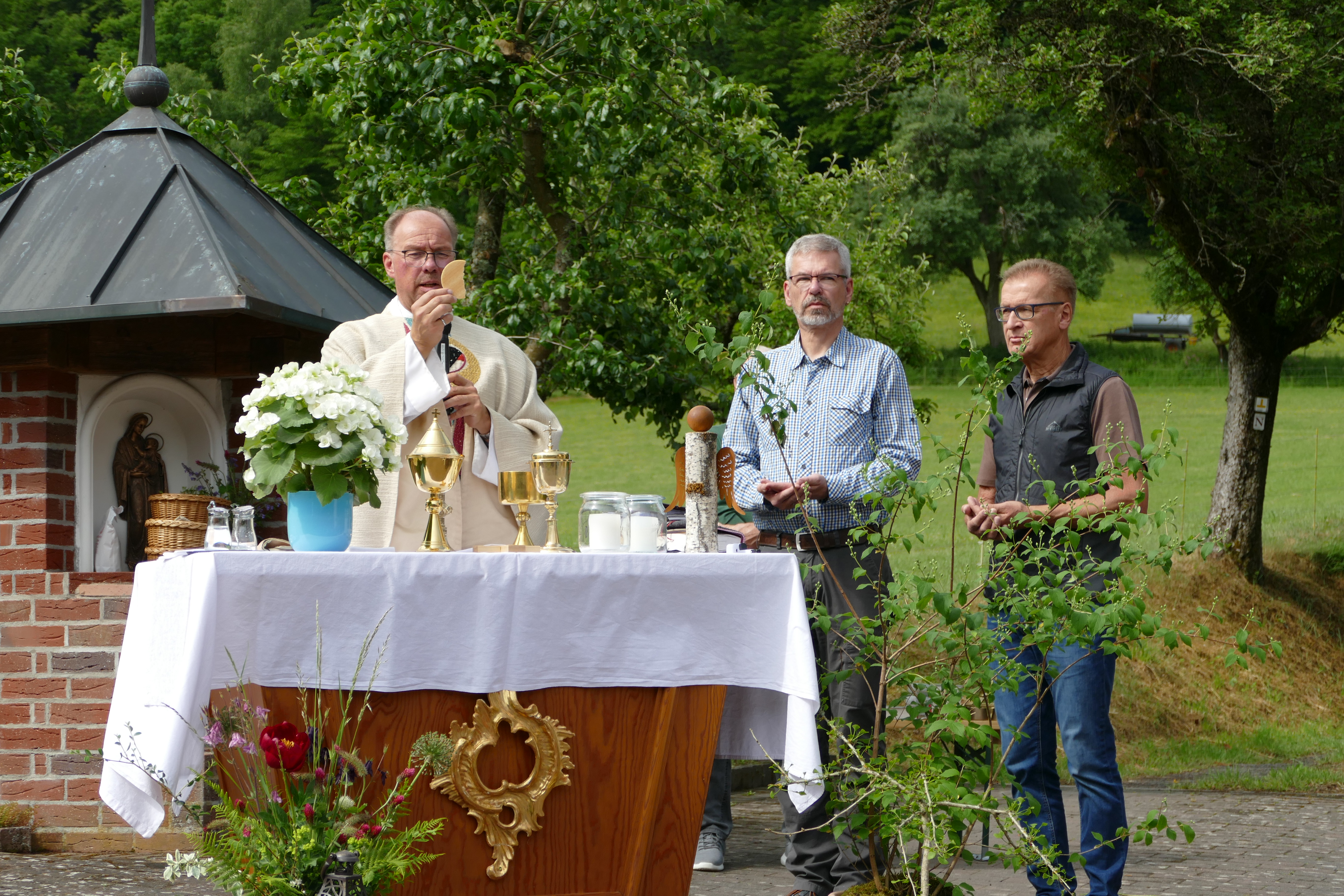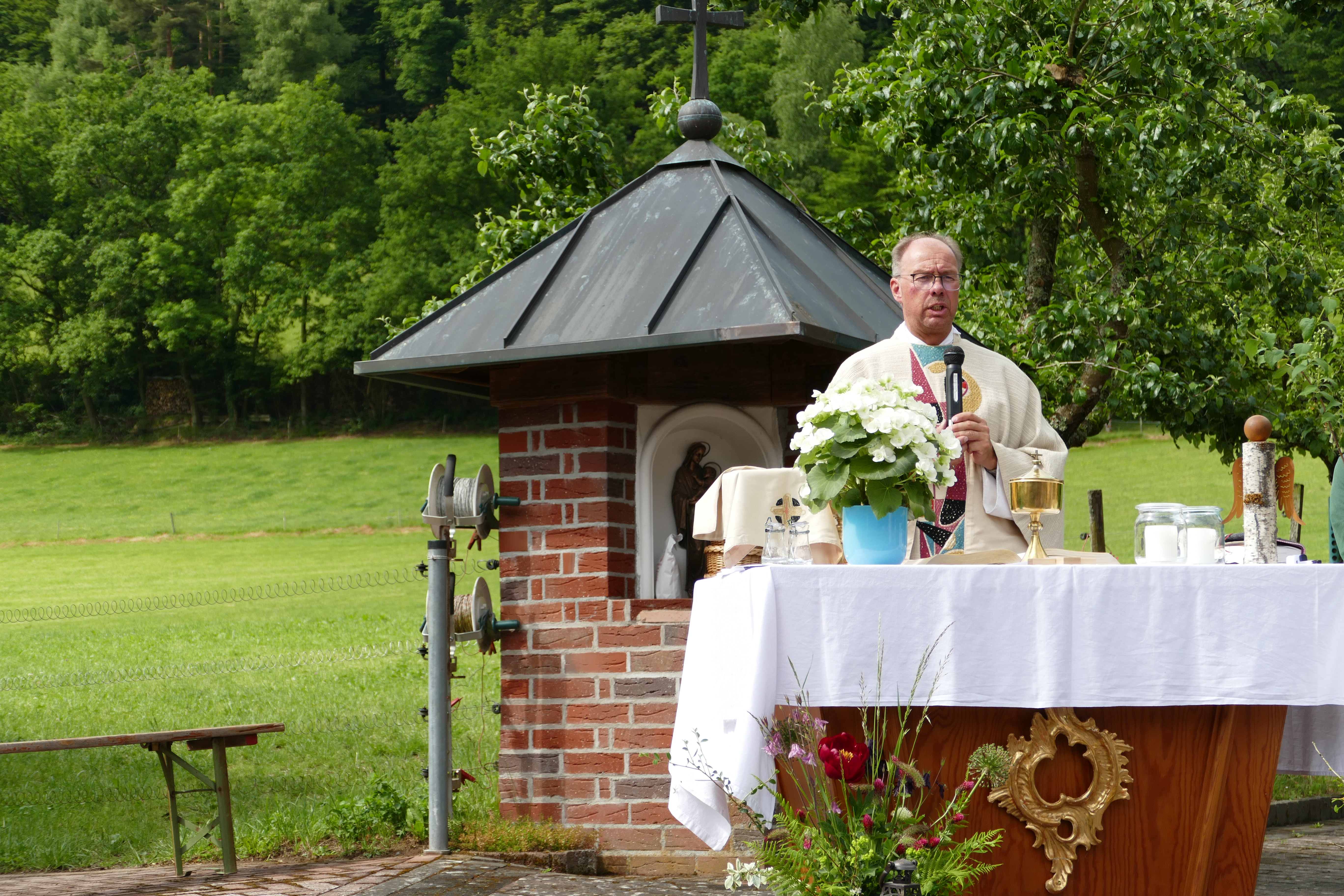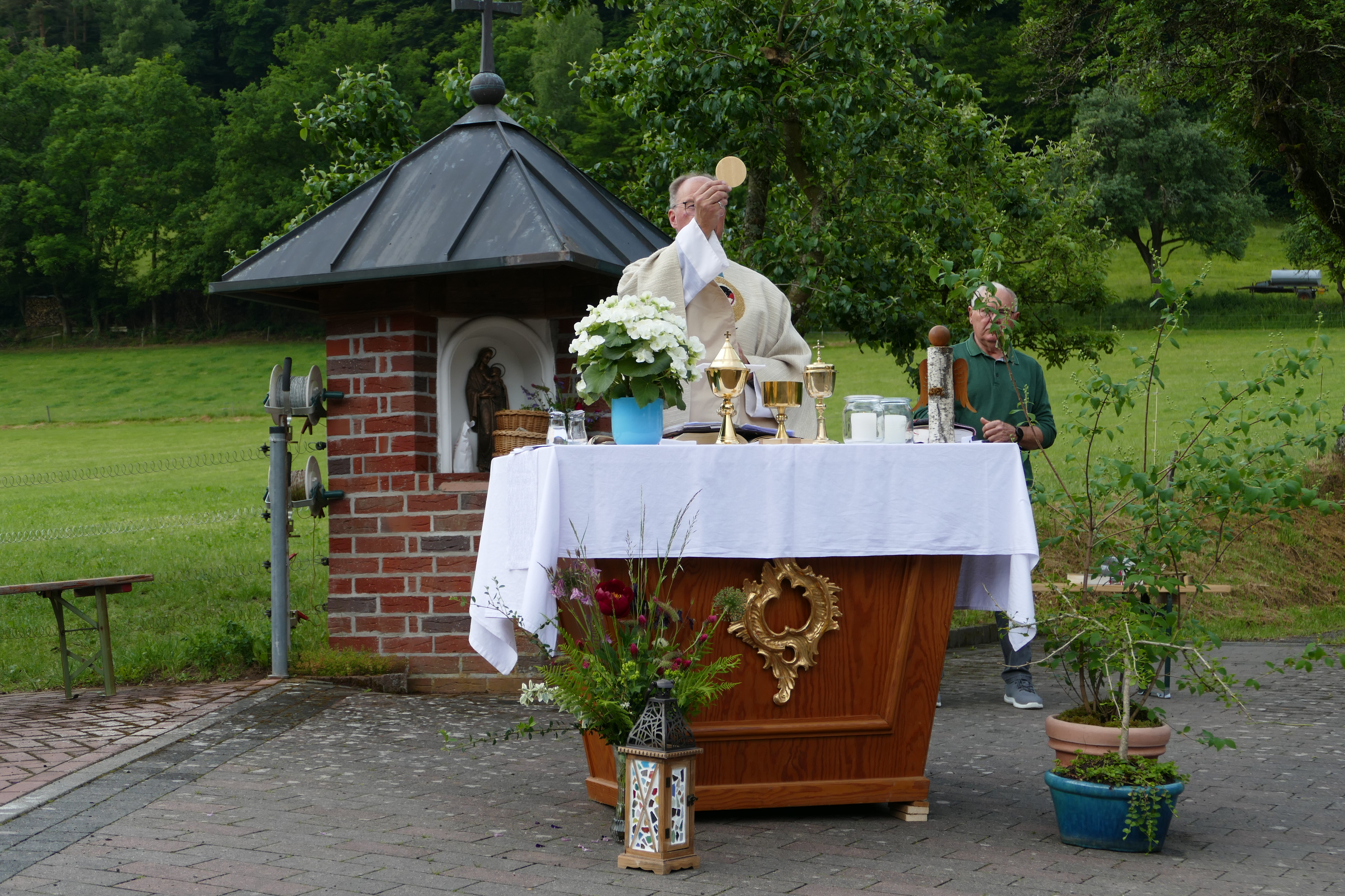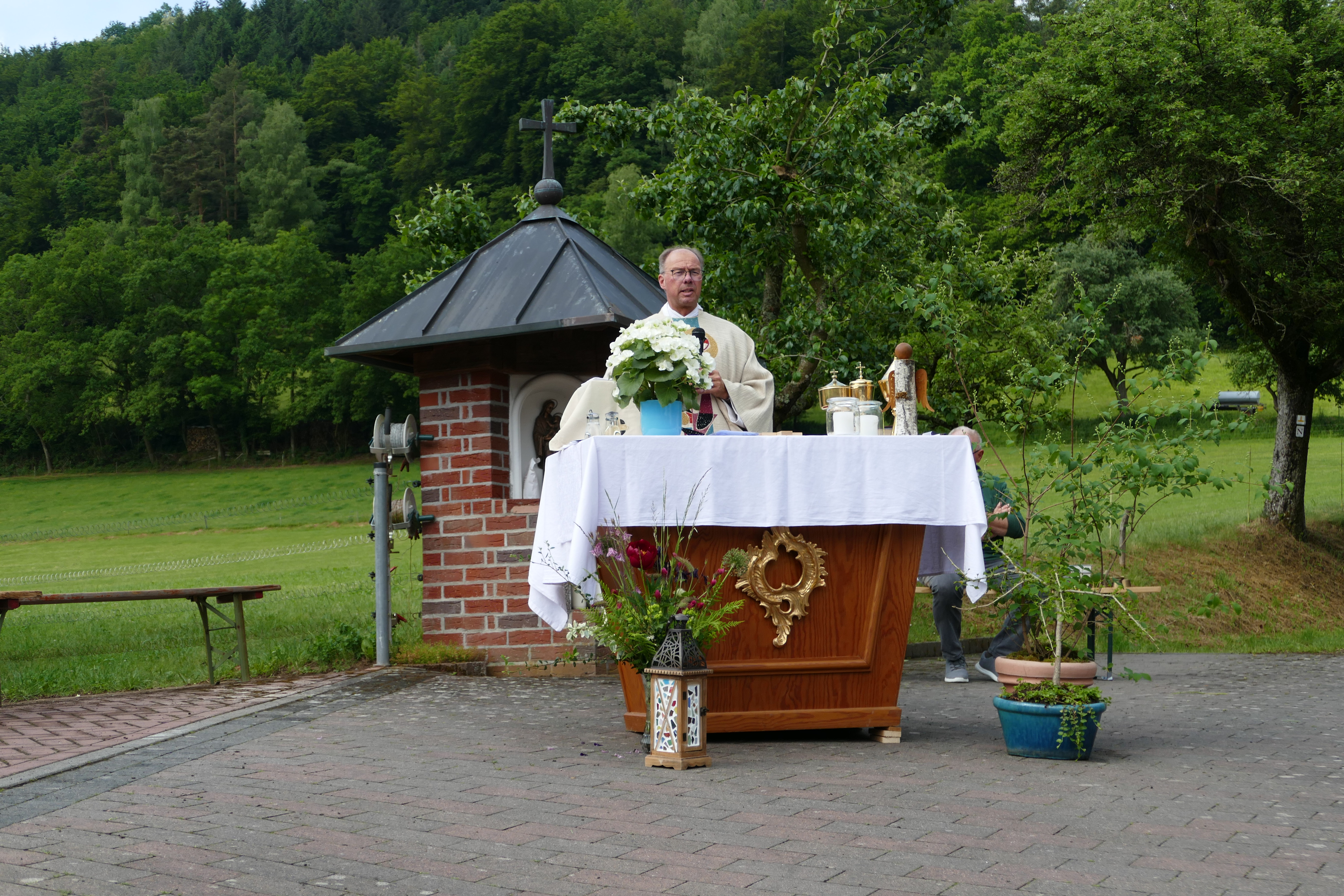 Bei trockenem Wetter, unterstützt und begleitet von einer Bläsergruppe, haben sich viele Beterinnen und Beter an Christi Himmelfahrt auf den Weg gemacht zur idyllischen Hofmühle. In Buch an der Kirche begrüßte Pfarrer Michael Prokschi die Gemeinde und stimmte auf den gemeinsamen Weg ein. Über die Felder ging es betend und singend Richtung Hofmühle, dort, vor dem Bildstock war der Altar aufgebaut und in großer Gemeinde wurde die Eucharistie gefeiert. Mit dem Wettersegen und dem feierlichen Te Deum schloss der Gottesdienst.