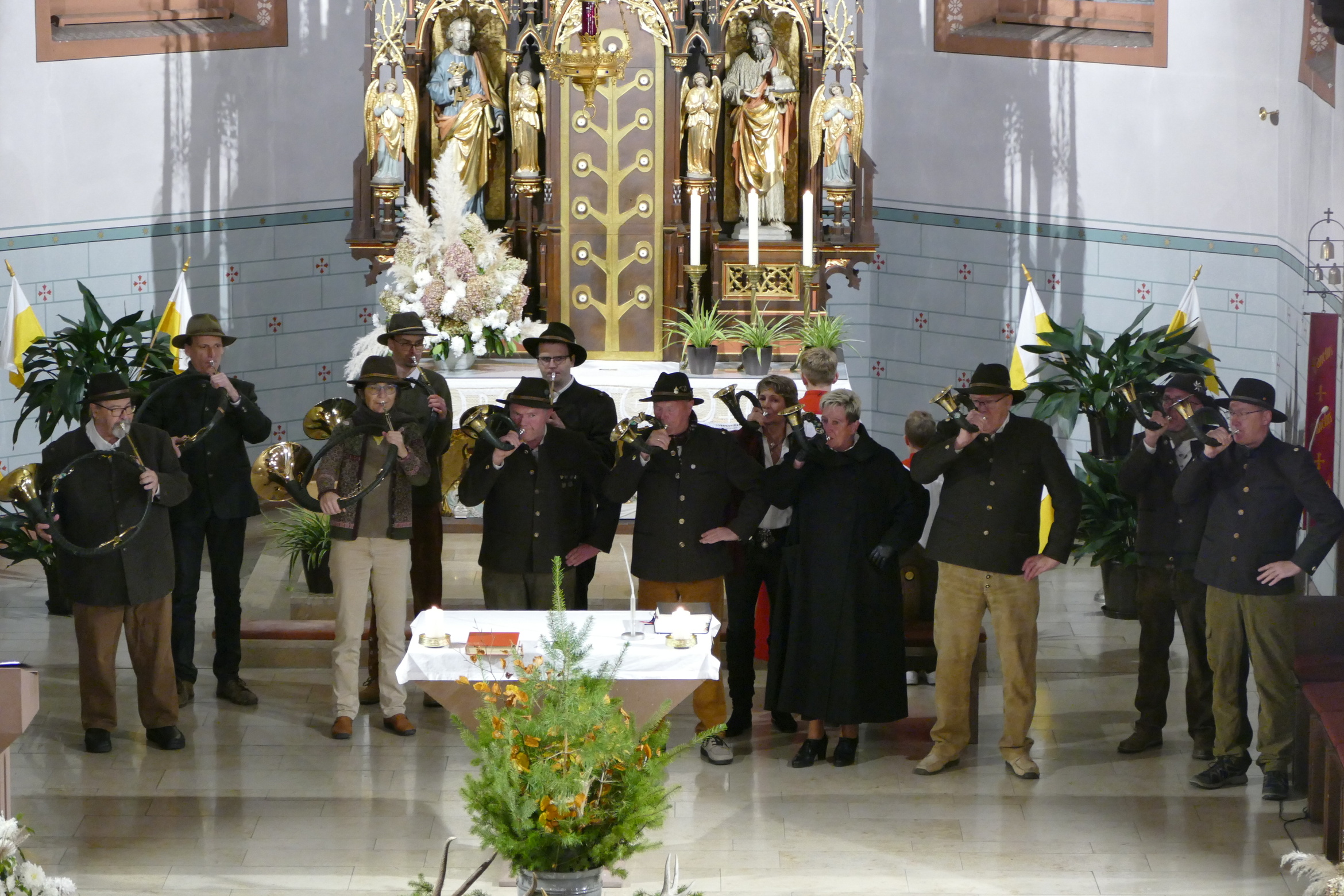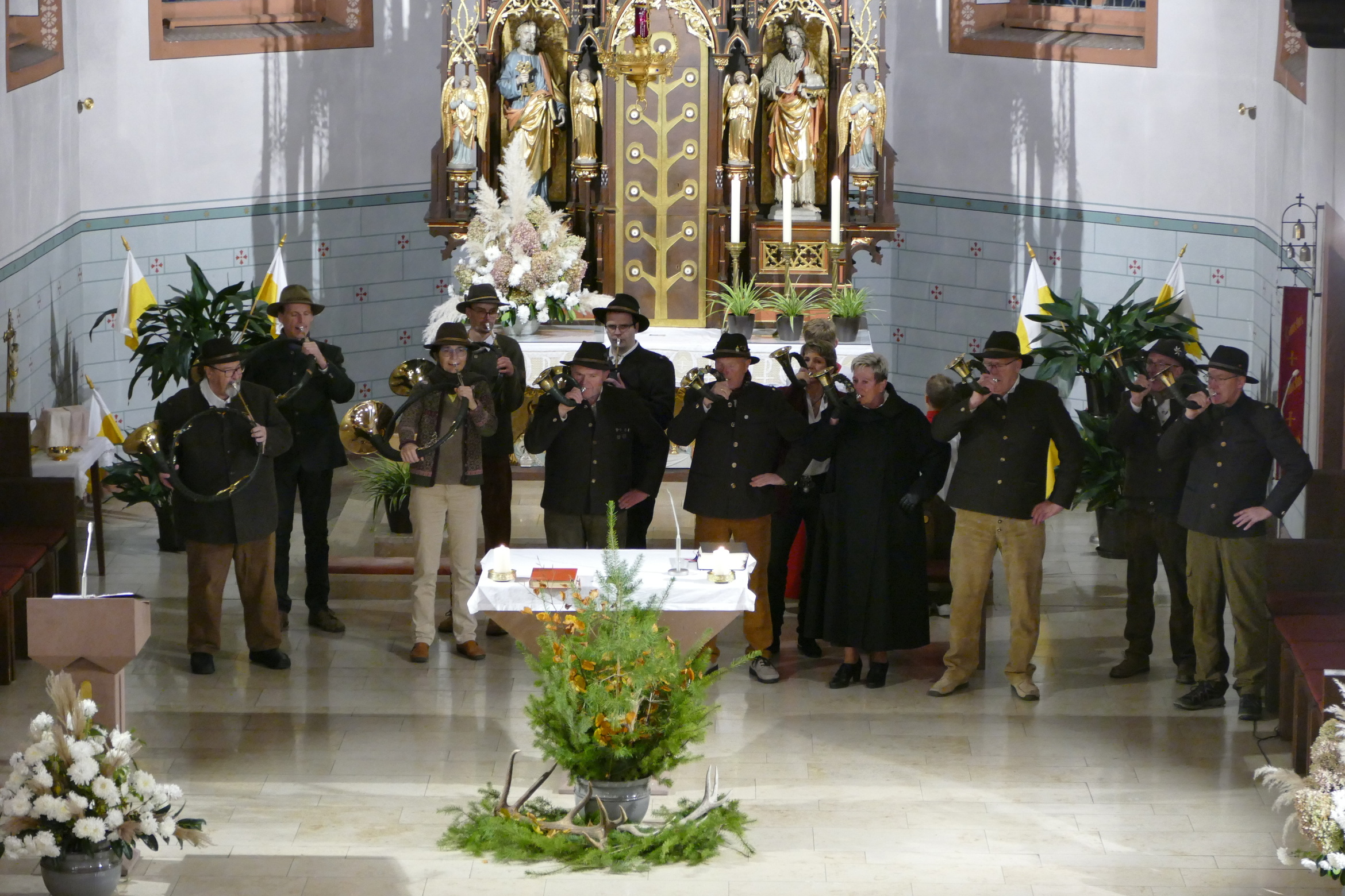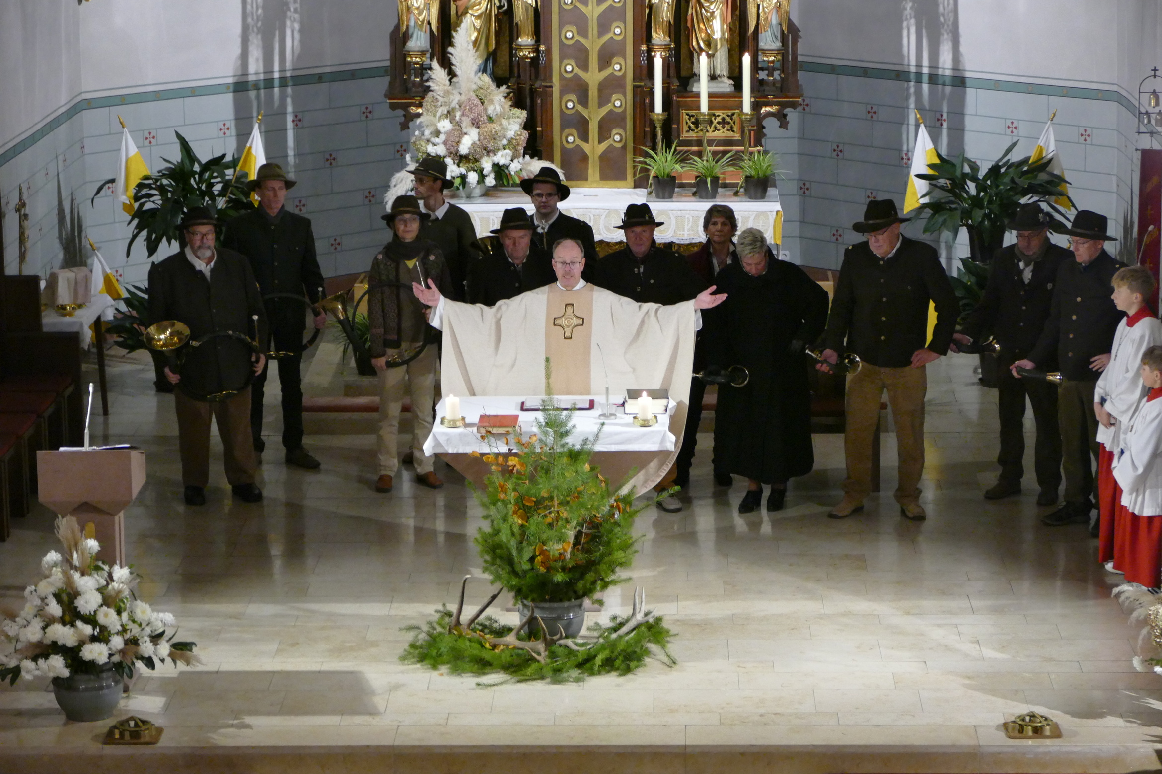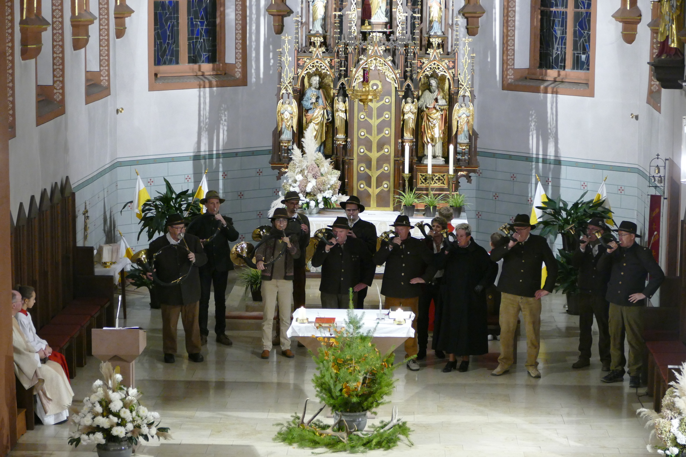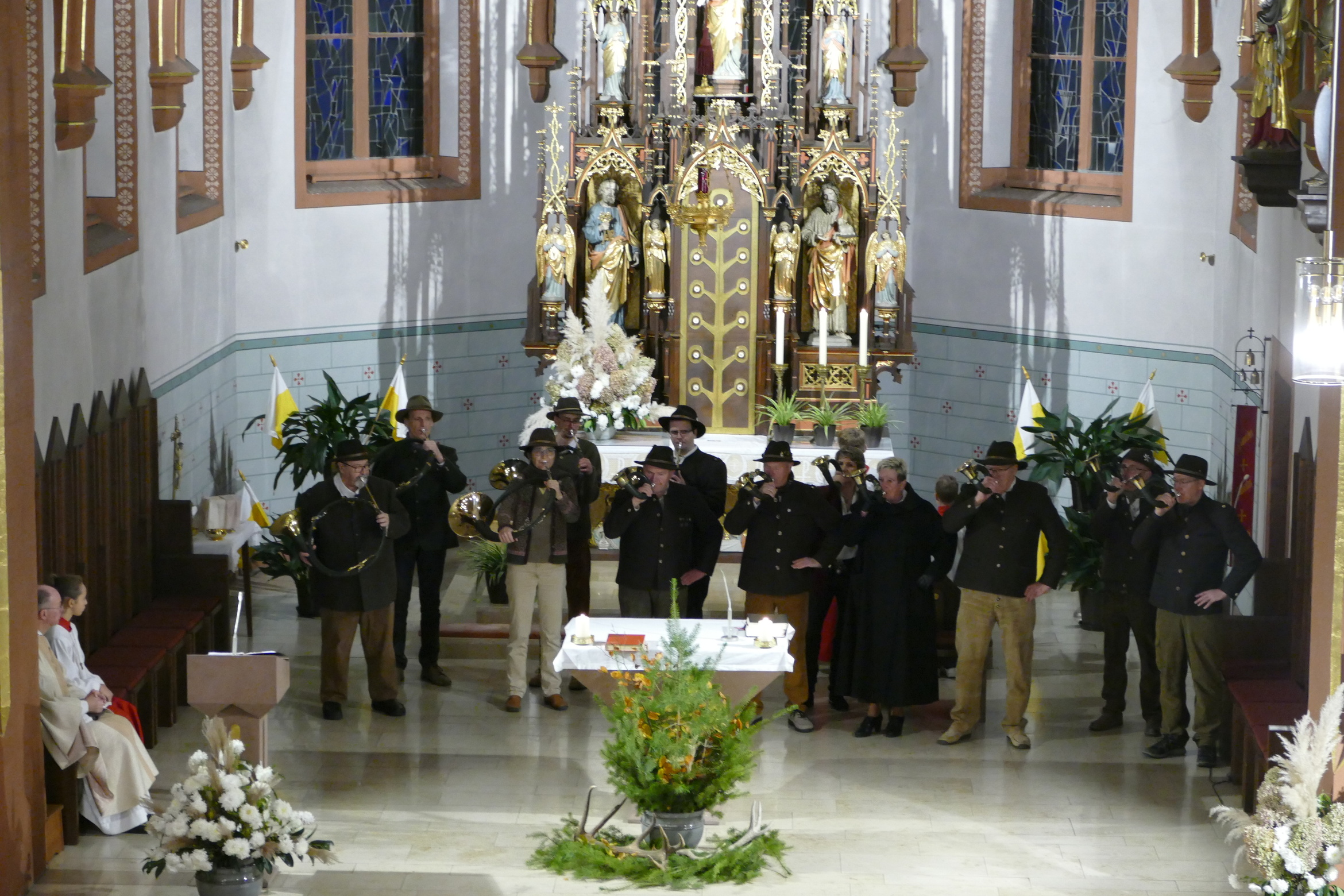 Nicht mit Pauken und Trompeten, vielmehr mit dem festlichen Spiel der Jagdhörner ging in der Pfarrkirche Kirchzell das Kirchenjahr zu Ende. Zum Hochfest Christkönig kamen die Jagdhornbläser aus Miltenberg und gestalteten den Gottesdienst mit. Schon zum Einzug zeigte sich die Klangfülle der 14 Spielerinnen und Spielern, verstärkt durch die wunderbare Akustik der Kirche. Die Begegnung zwischen Jesus und Pilatus, verbunden mit der Frage, was heute einen König ausmacht stand im Mittelpunkt der Predigt von Pfarrer Michael Prokschi. Zur Gabenbereitung, zur Kommunion und auch am Ende der Messfeier brachten die Musiker ihre Stücke zu Gehör, erfreuten so die zahlreichen Gottesdienstbesucher.