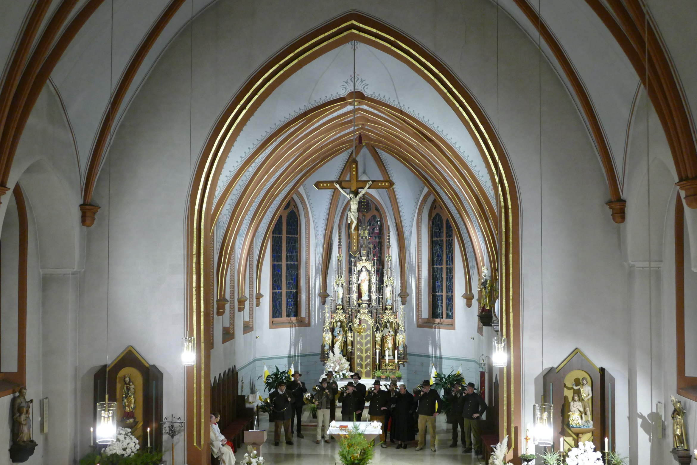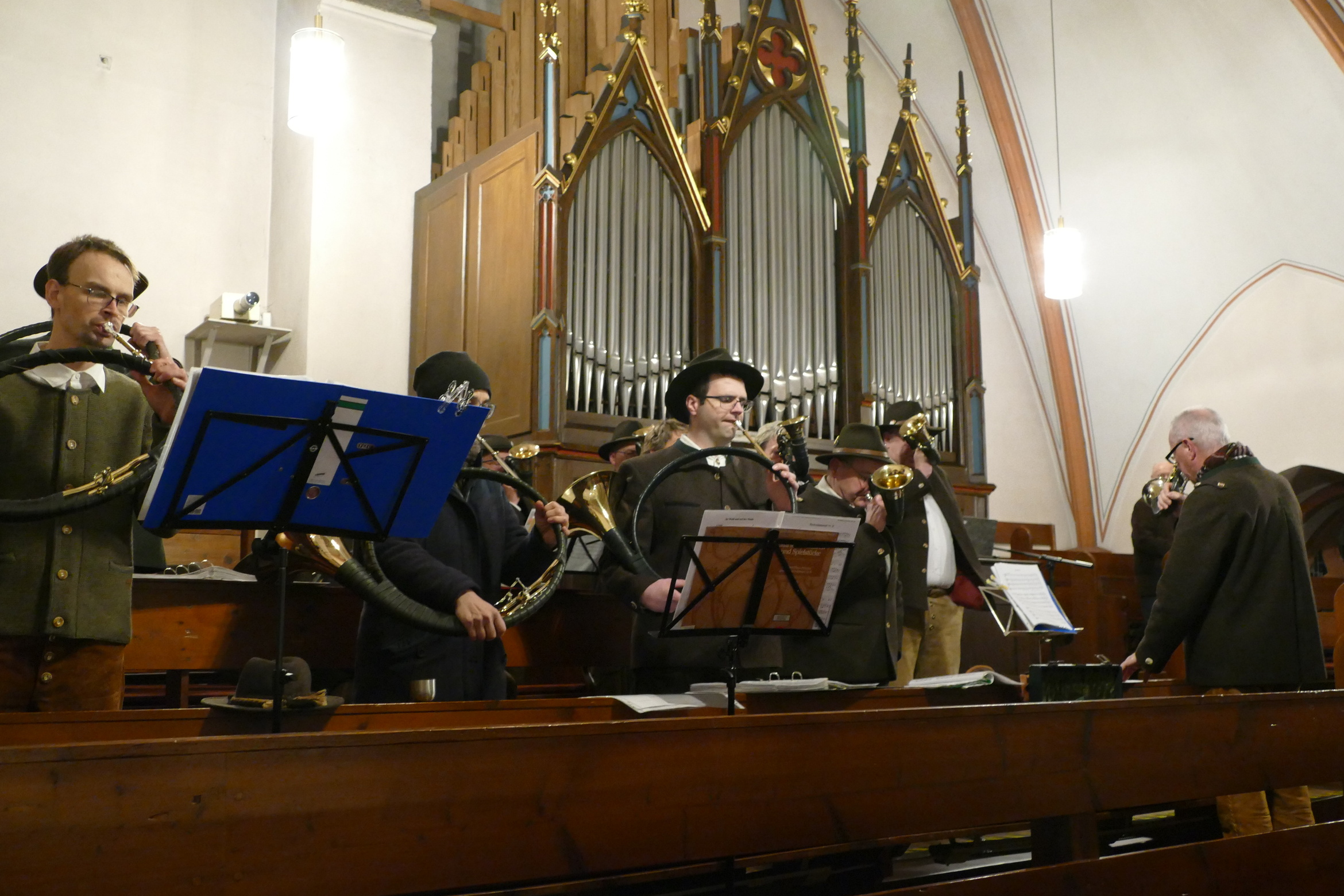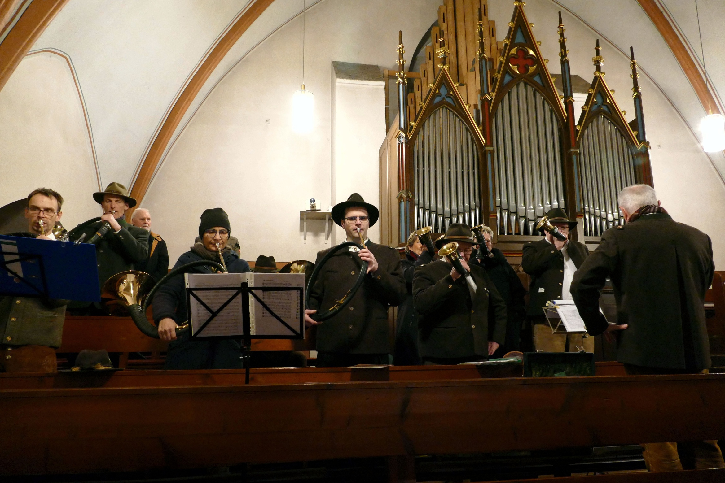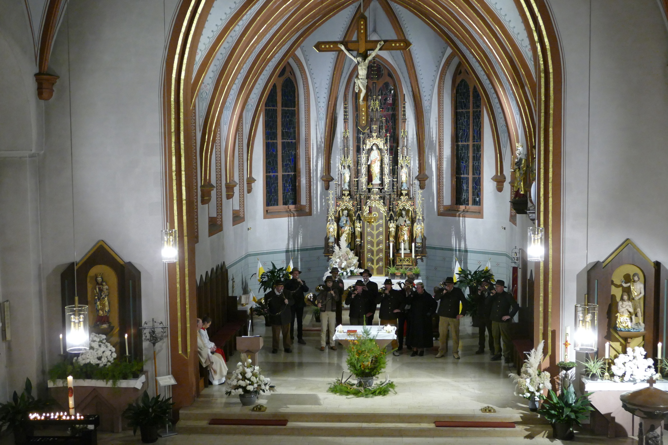Nicht mit Pauken und Trompeten, vielmehr mit dem festlichen Spiel der Jagdhörner ging in der Pfarrkirche Kirchzell das Kirchenjahr zu Ende. Zum Hochfest Christkönig kamen die Jagdhornbläser aus Miltenberg und gestalteten den Gottesdienst mit. Schon zum Einzug zeigte sich die Klangfülle der 14 Spielerinnen und Spielern, verstärkt durch die wunderbare Akustik der Kirche. Die Begegnung zwischen Jesus und Pilatus, verbunden mit der Frage, was heute einen König ausmacht stand im Mittelpunkt der Predigt von Pfarrer Michael Prokschi. Zur Gabenbereitung, zur Kommunion und auch am Ende der Messfeier brachten die Musiker ihre Stücke zu Gehör, erfreuten so die zahlreichen Gottesdienstbesucher.