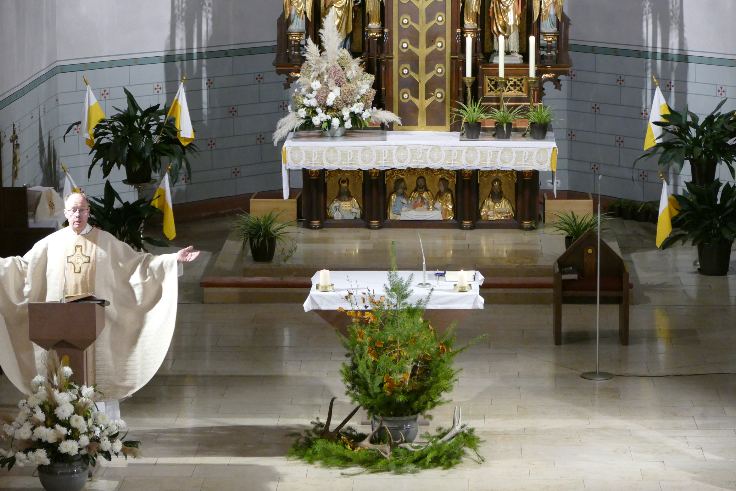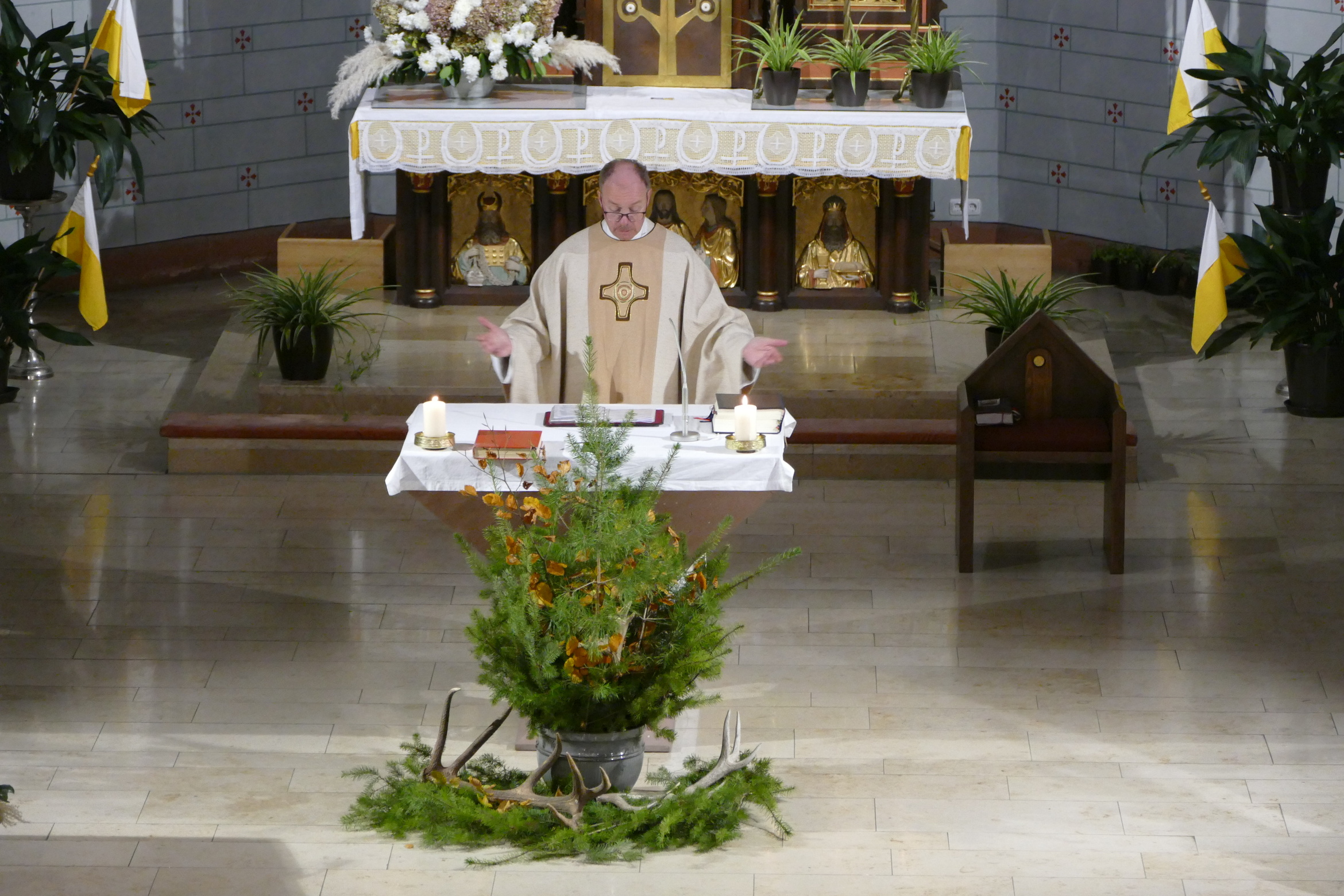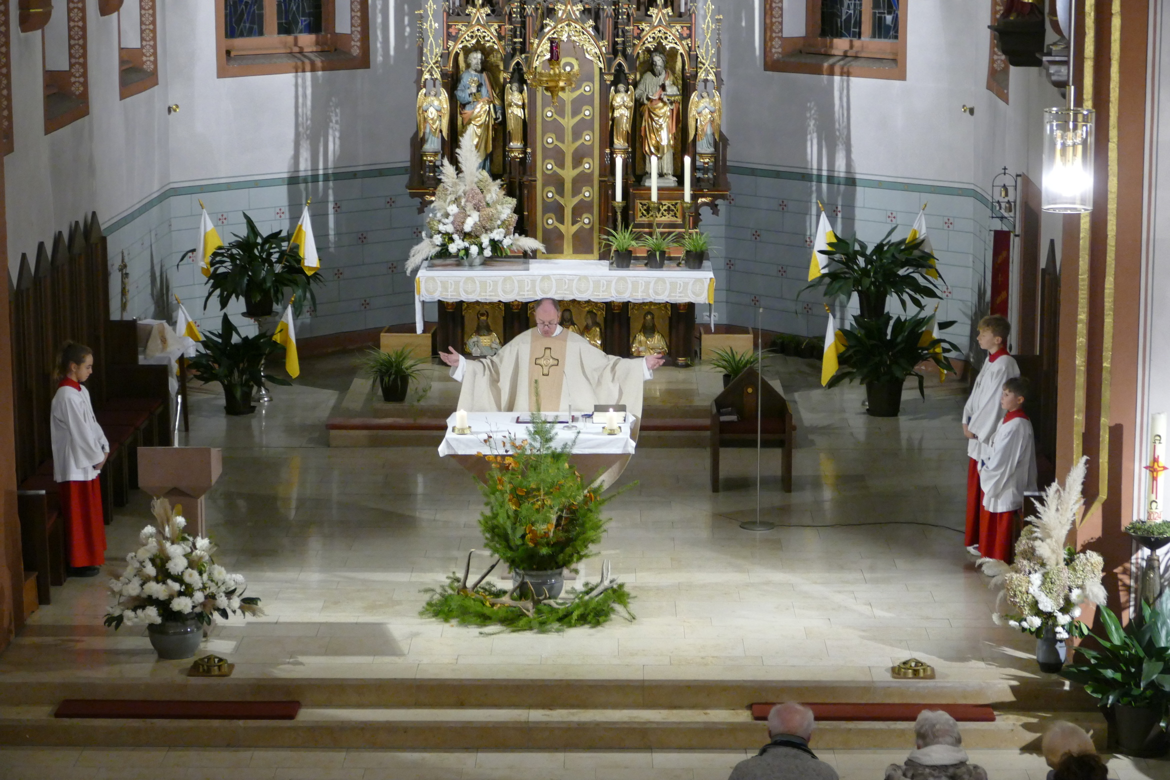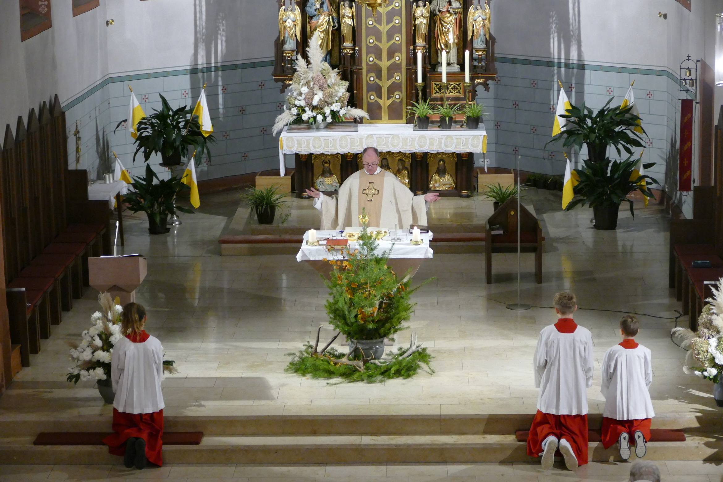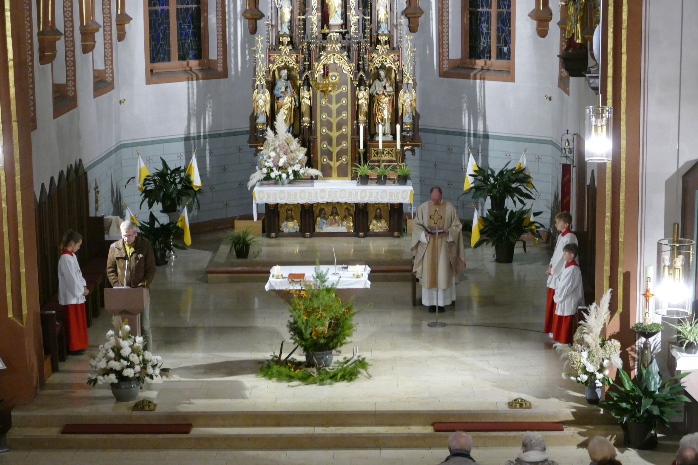 Nicht mit Pauken und Trompeten, vielmehr mit dem festlichen Spiel der Jagdhörner ging in der Pfarrkirche Kirchzell das Kirchenjahr zu Ende. Zum Hochfest Christkönig kamen die Jagdhornbläser aus Miltenberg und gestalteten den Gottesdienst mit. Schon zum Einzug zeigte sich die Klangfülle der 14 Spielerinnen und Spielern, verstärkt durch die wunderbare Akustik der Kirche. Die Begegnung zwischen Jesus und Pilatus, verbunden mit der Frage, was heute einen König ausmacht stand im Mittelpunkt der Predigt von Pfarrer Michael Prokschi. Zur Gabenbereitung, zur Kommunion und auch am Ende der Messfeier brachten die Musiker ihre Stücke zu Gehör, erfreuten so die zahlreichen Gottesdienstbesucher.