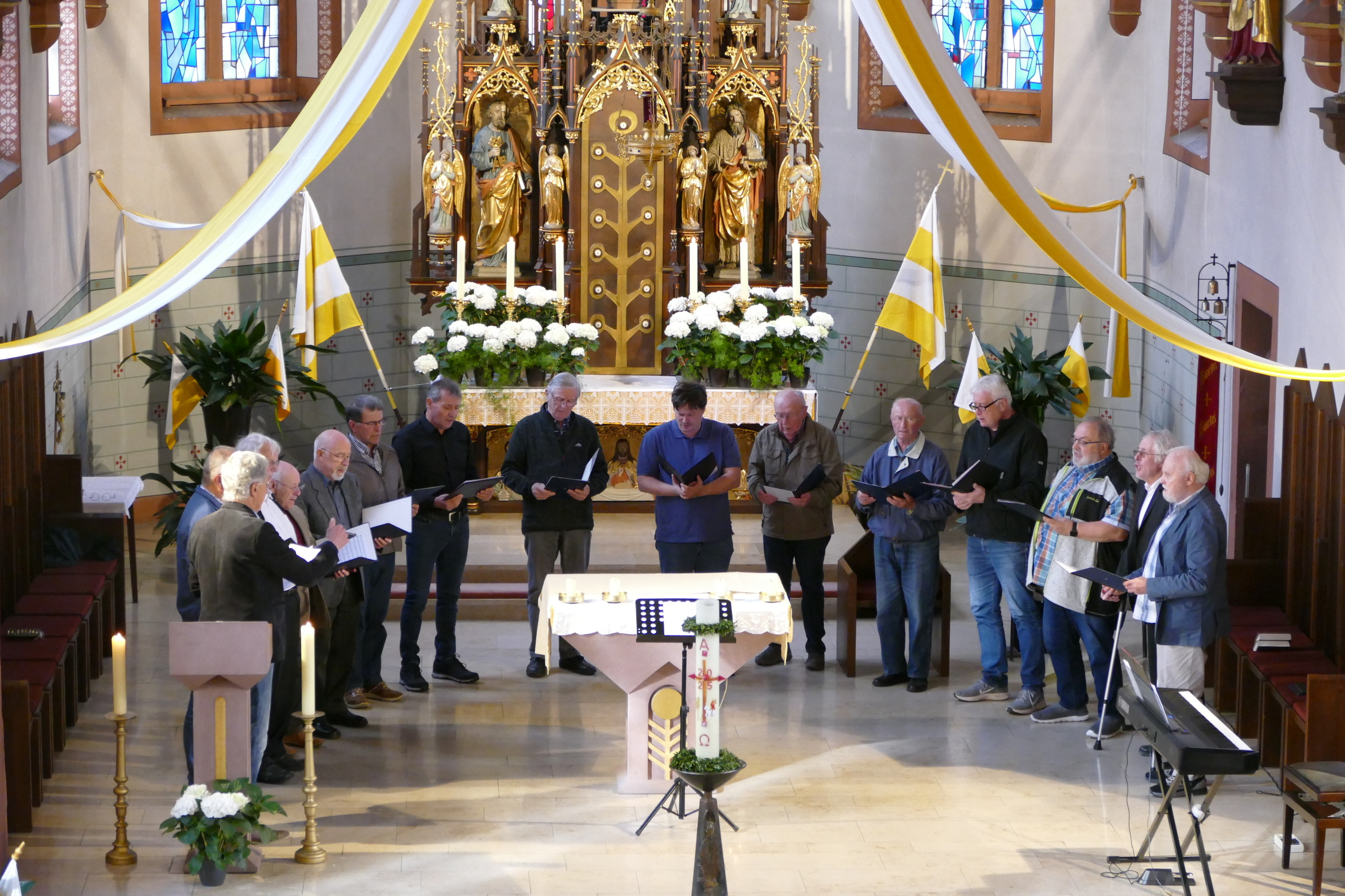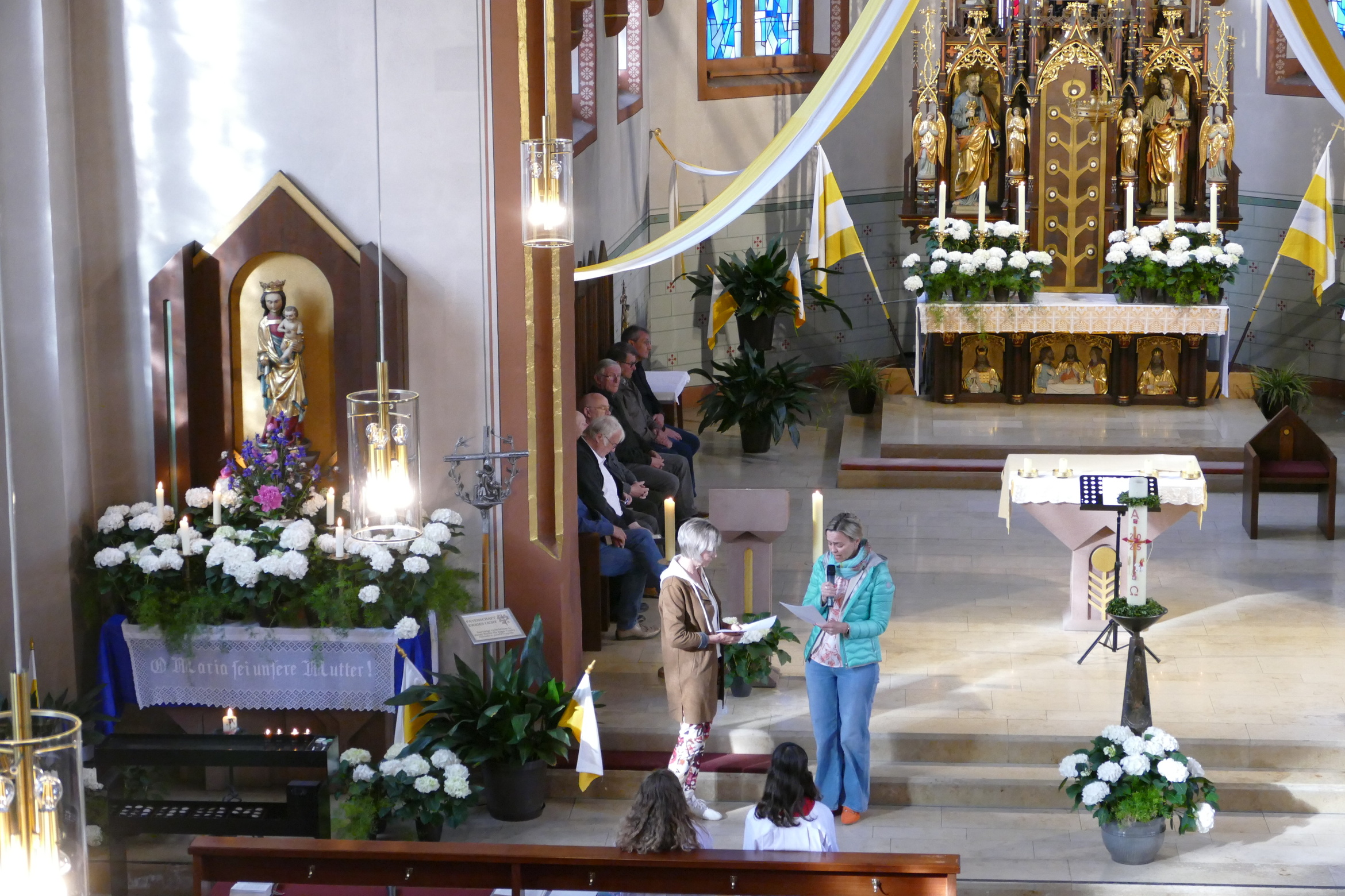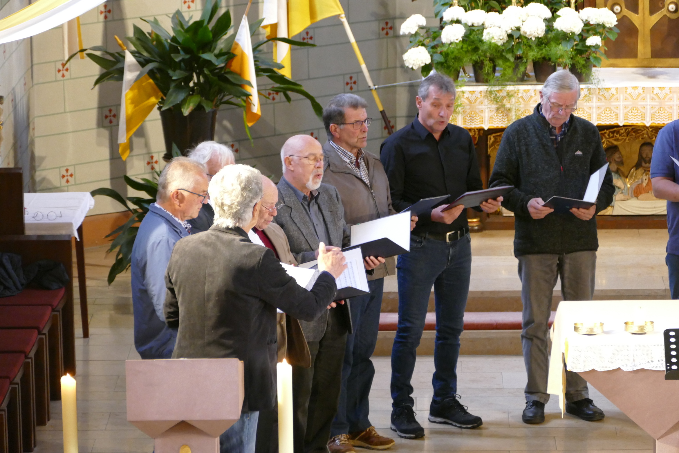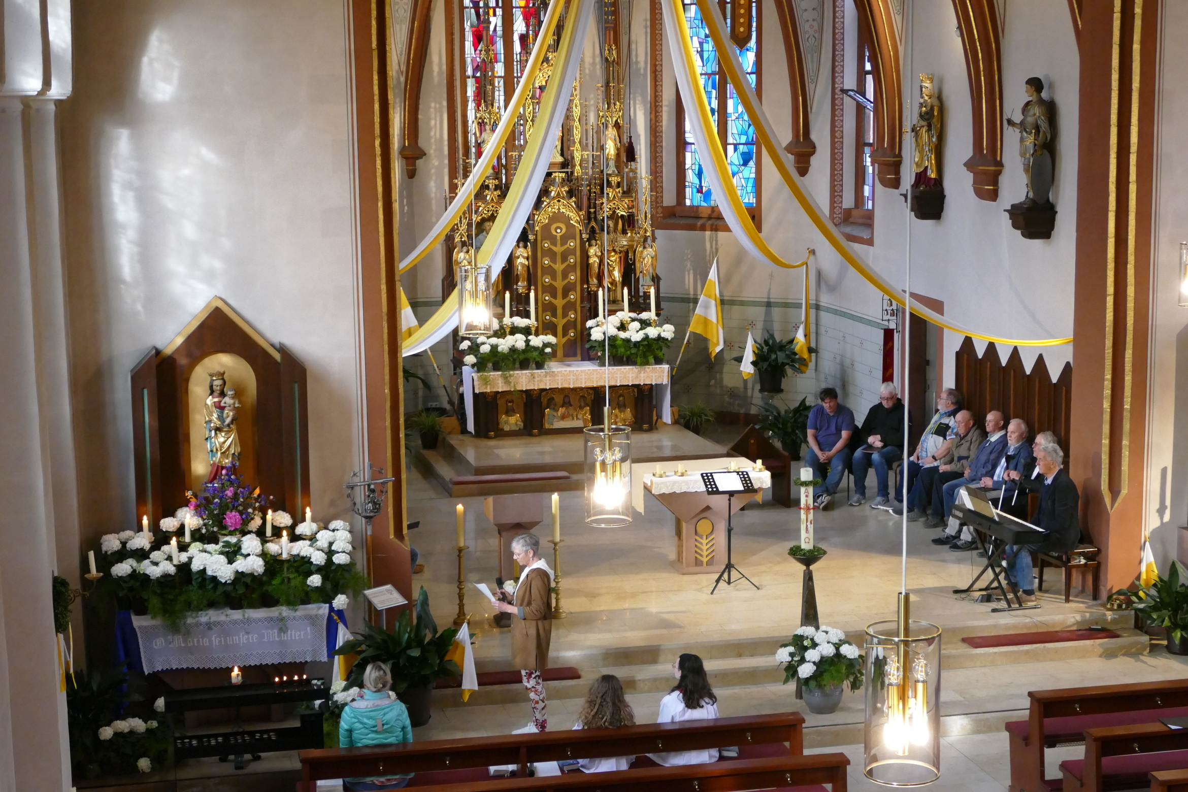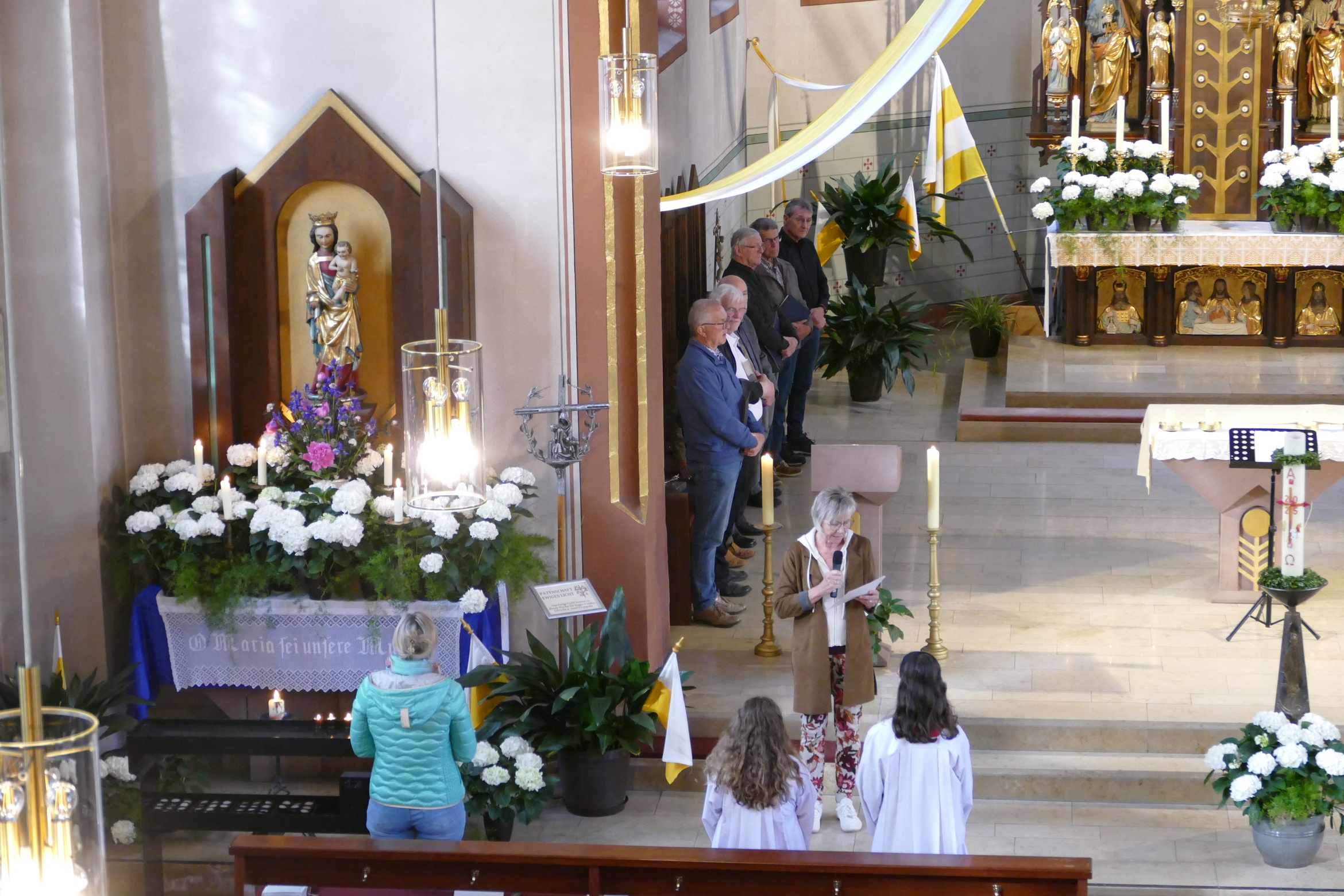 Die Begegnung zwischen Maria und Elisabeth stand im Mittelpunkt der Maiandacht, welche vom Gesangverein Frohsinn mitgestaltet wurde. Unter der Leitung von Hermann Trunk sang der Männerchor wie auch der Chor Vocapella verschiedene Marienlieder. Birgit Frank und Anke Wörner sprachen die Texte und Gebete, schlüpften bei einem Dialog in die Rolle der beiden Frauen Frauen Maria und Elisabeth. Erzählten von ihrer Hoffnung und dem Vertrauen in Gottes Hilfe.
