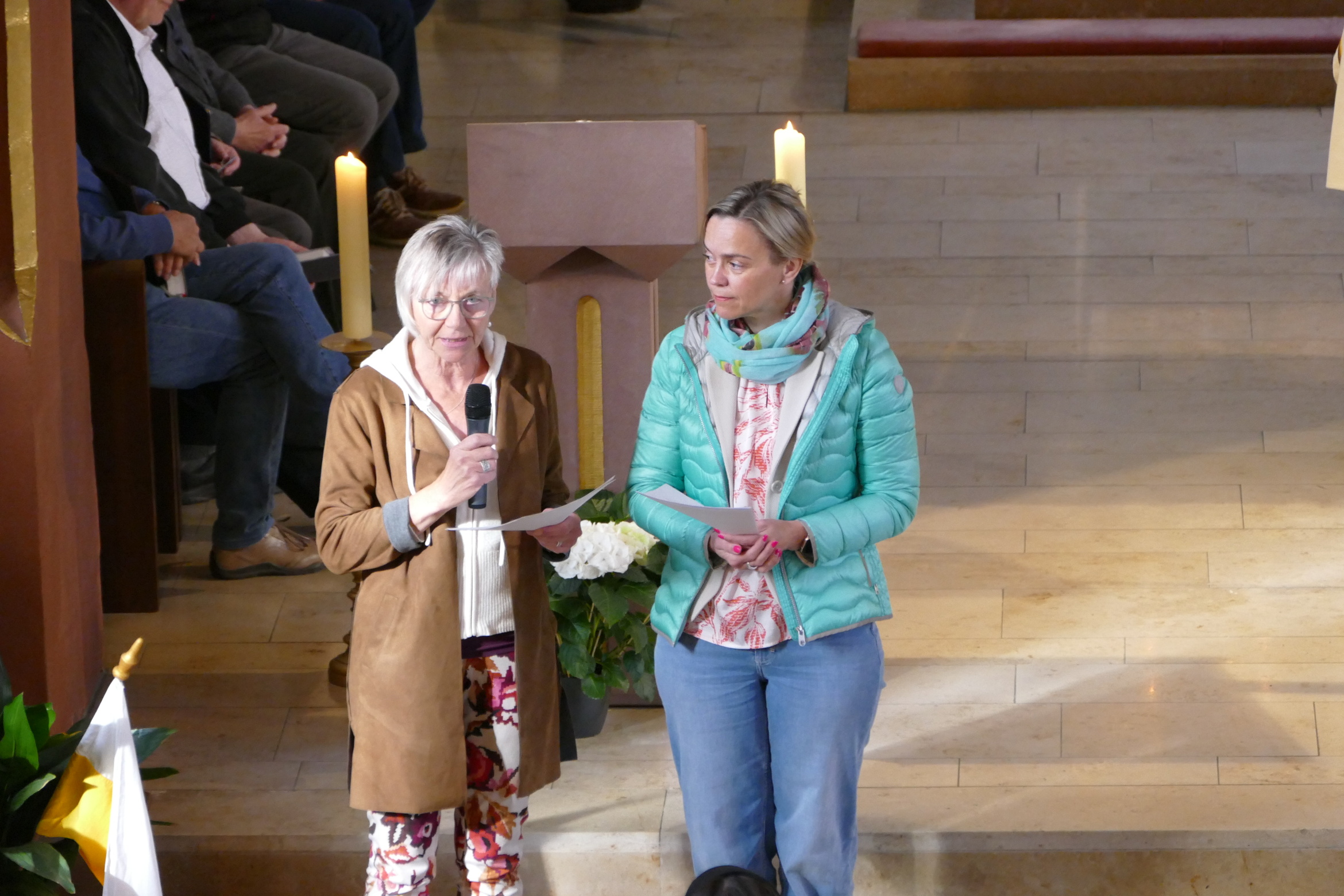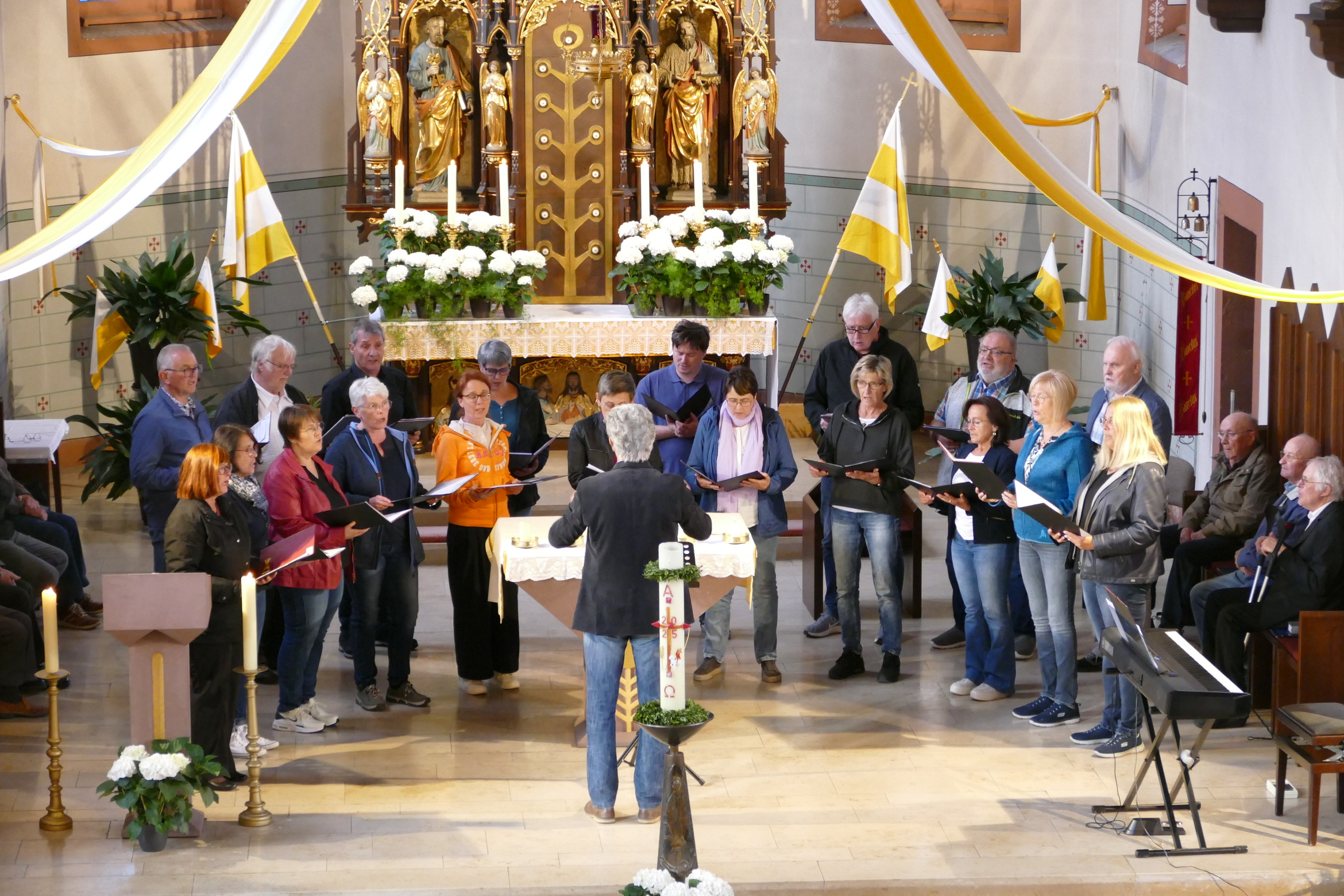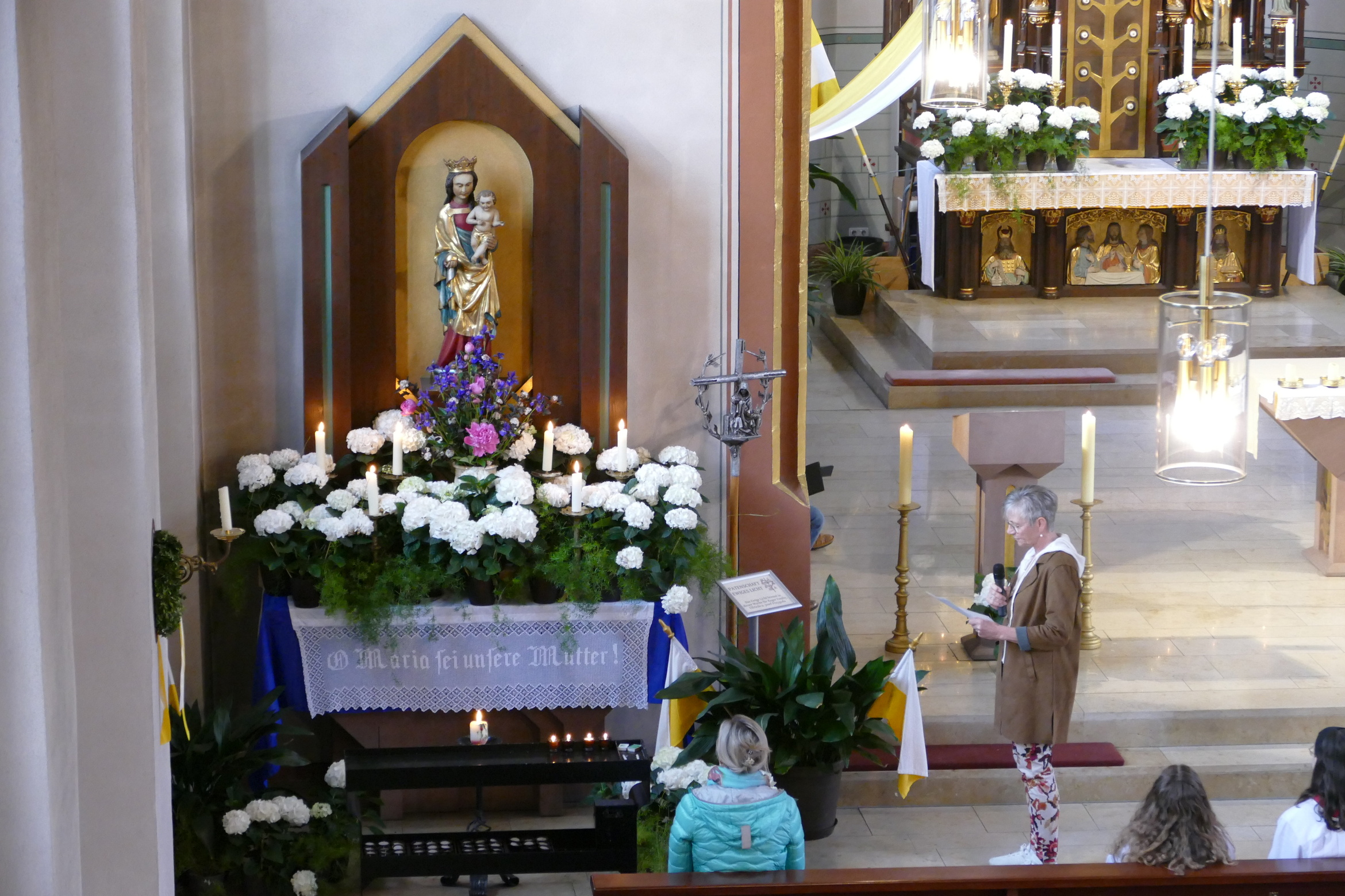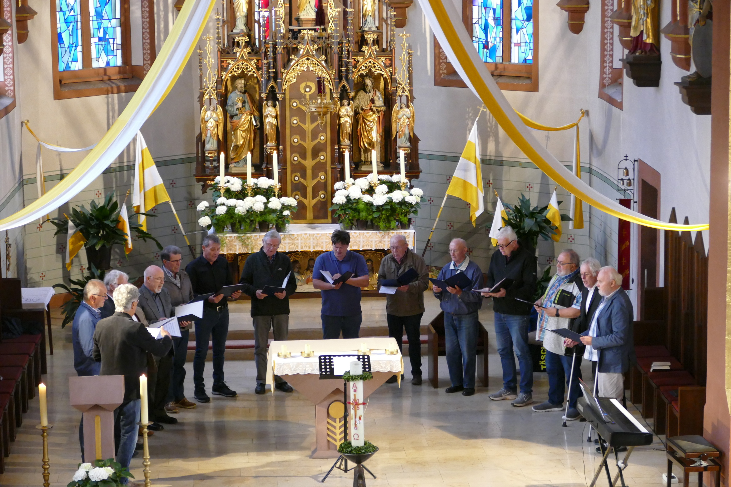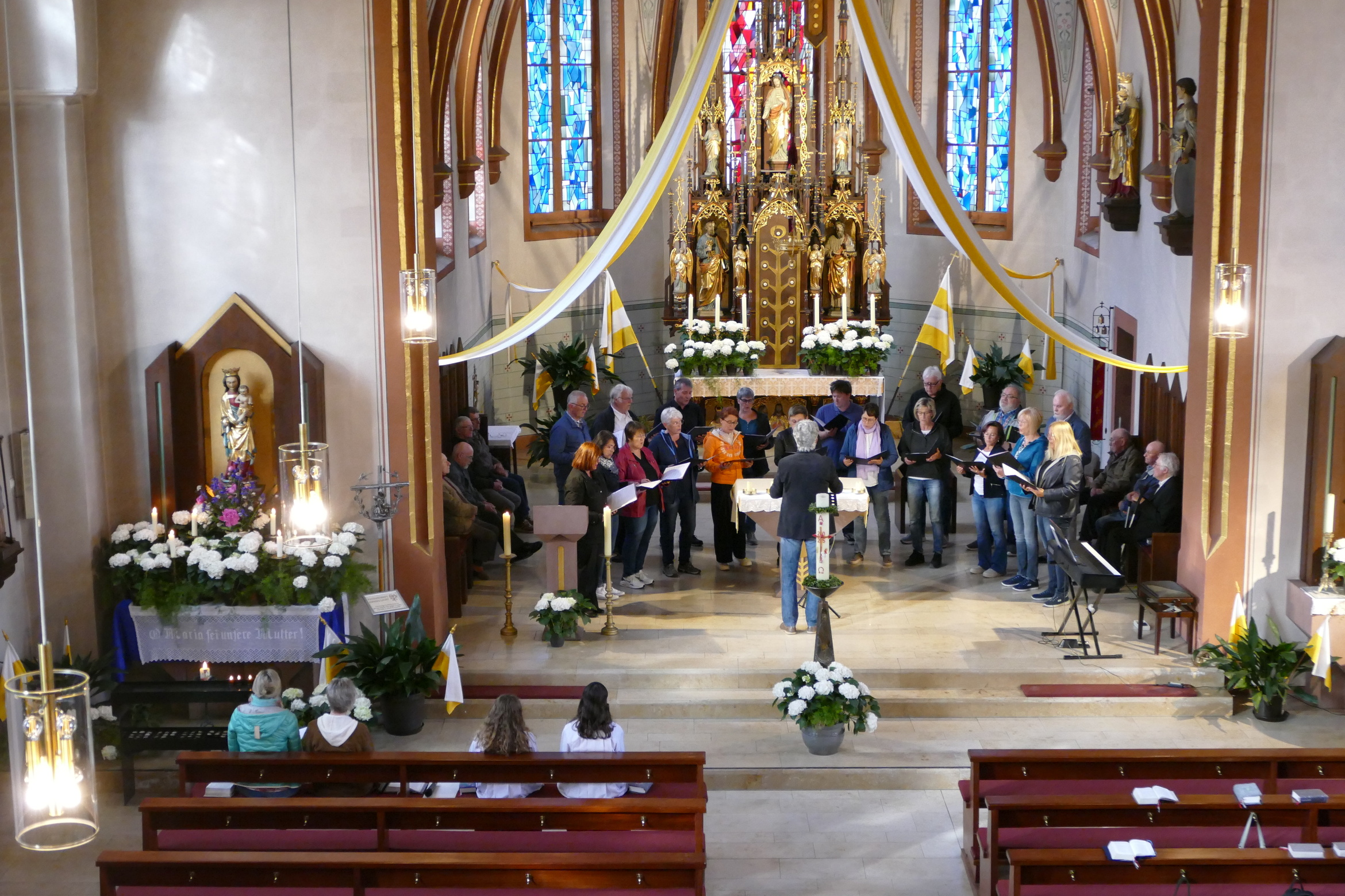 Die Begegnung zwischen Maria und Elisabeth stand im Mittelpunkt der Maiandacht, welche vom Gesangverein Frohsinn mitgestaltet wurde. Unter der Leitung von Hermann Trunk sang der Männerchor wie auch der Chor Vocapella verschiedene Marienlieder. Birgit Frank und Anke Wörner sprachen die Texte und Gebete, schlüpften bei einem Dialog in die Rolle der beiden Frauen Frauen Maria und Elisabeth. Erzählten von ihrer Hoffnung und dem Vertrauen in Gottes Hilfe.