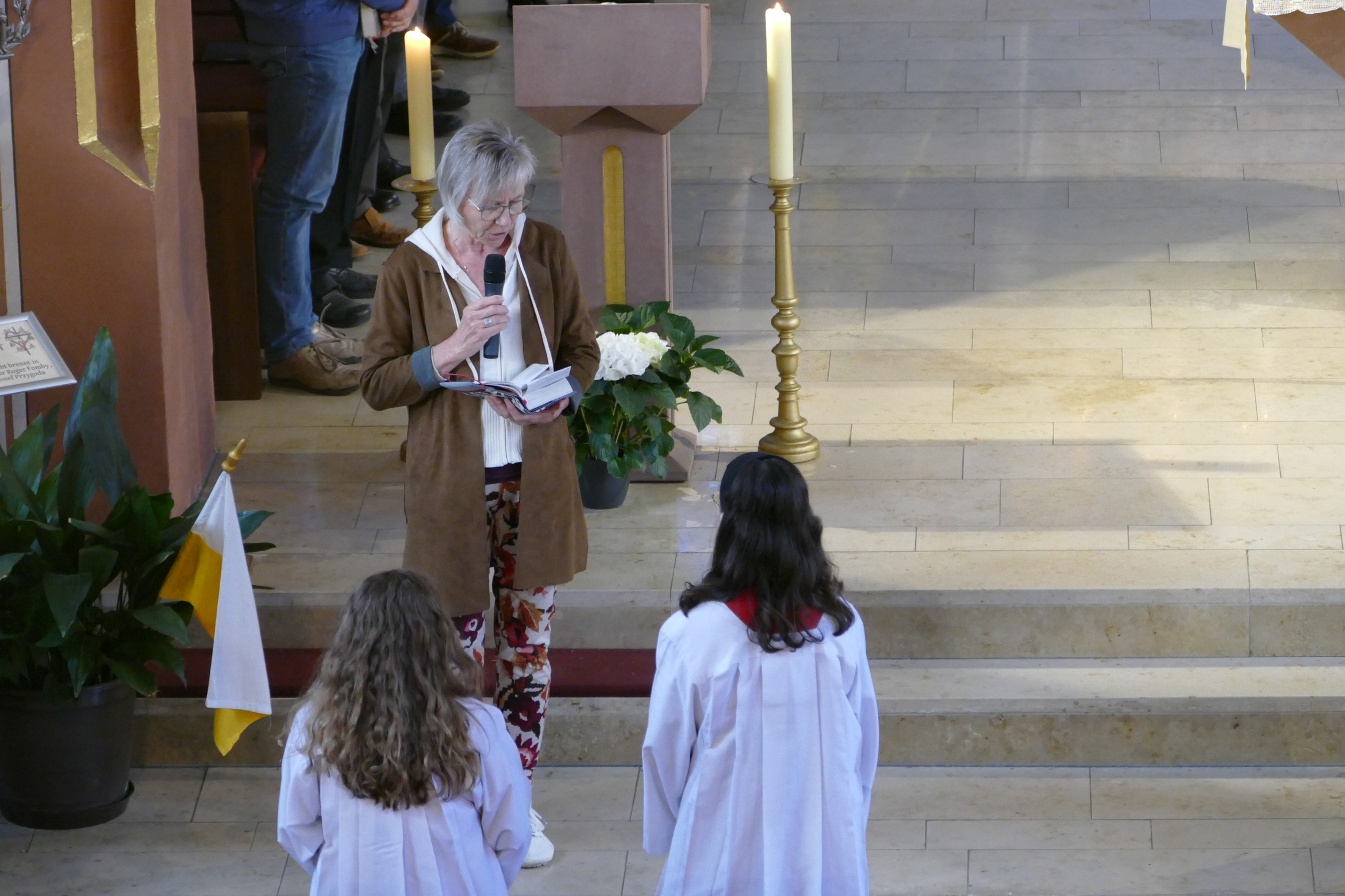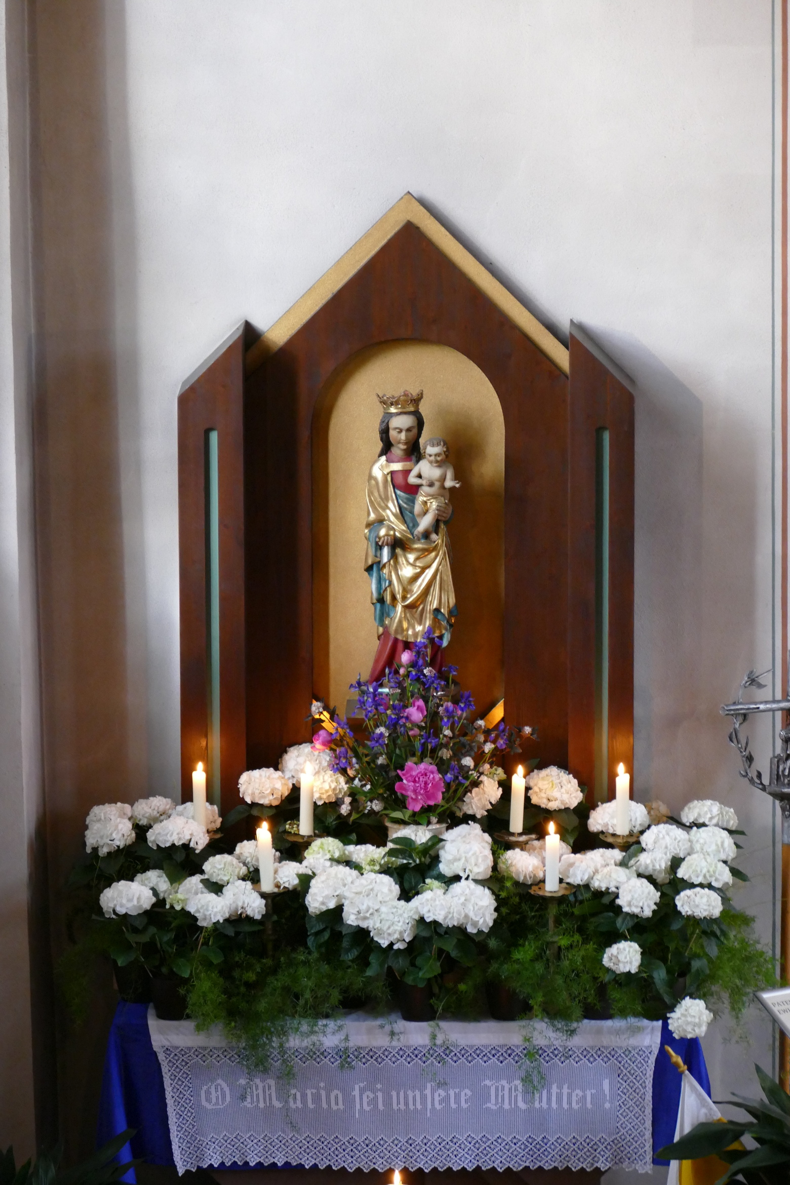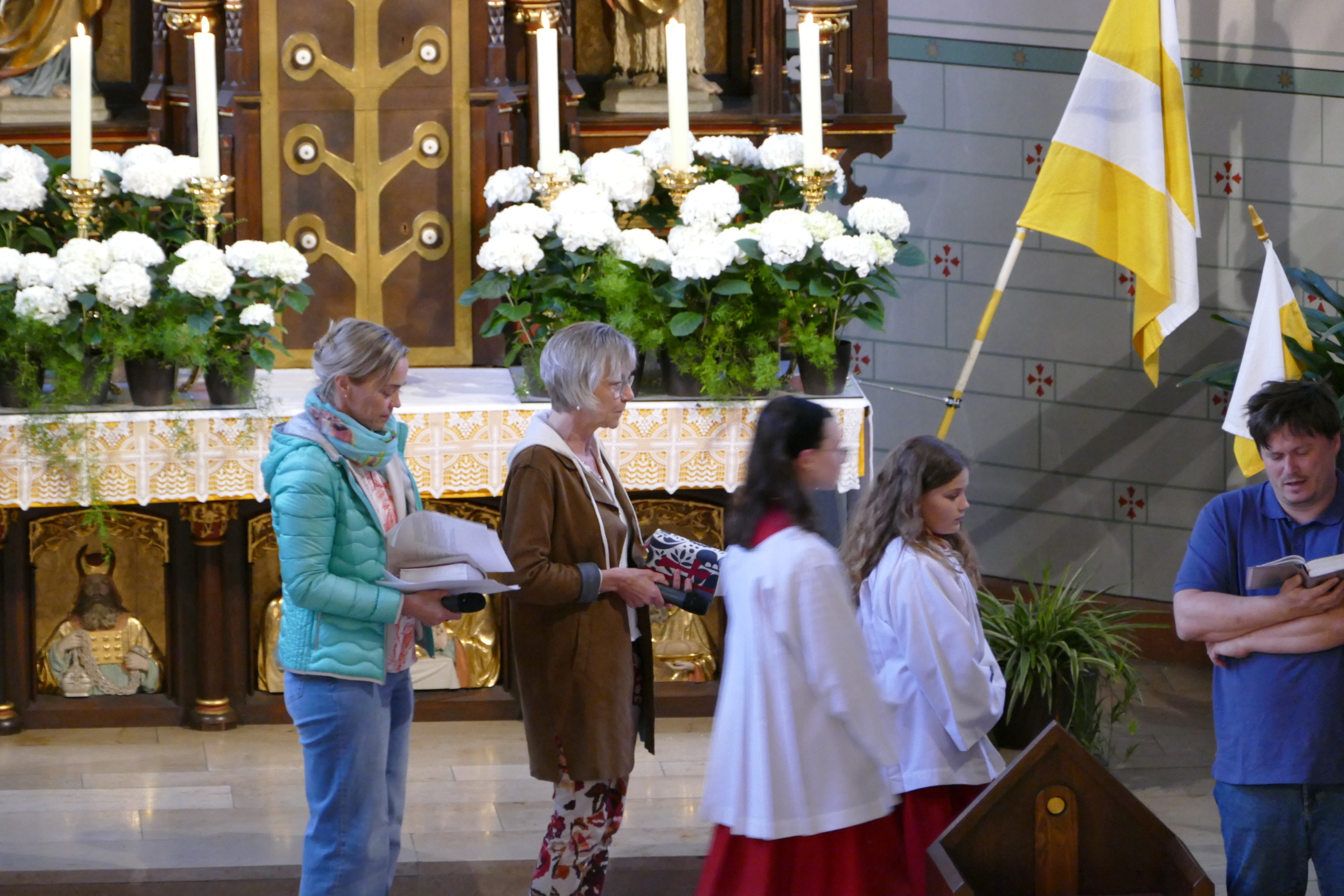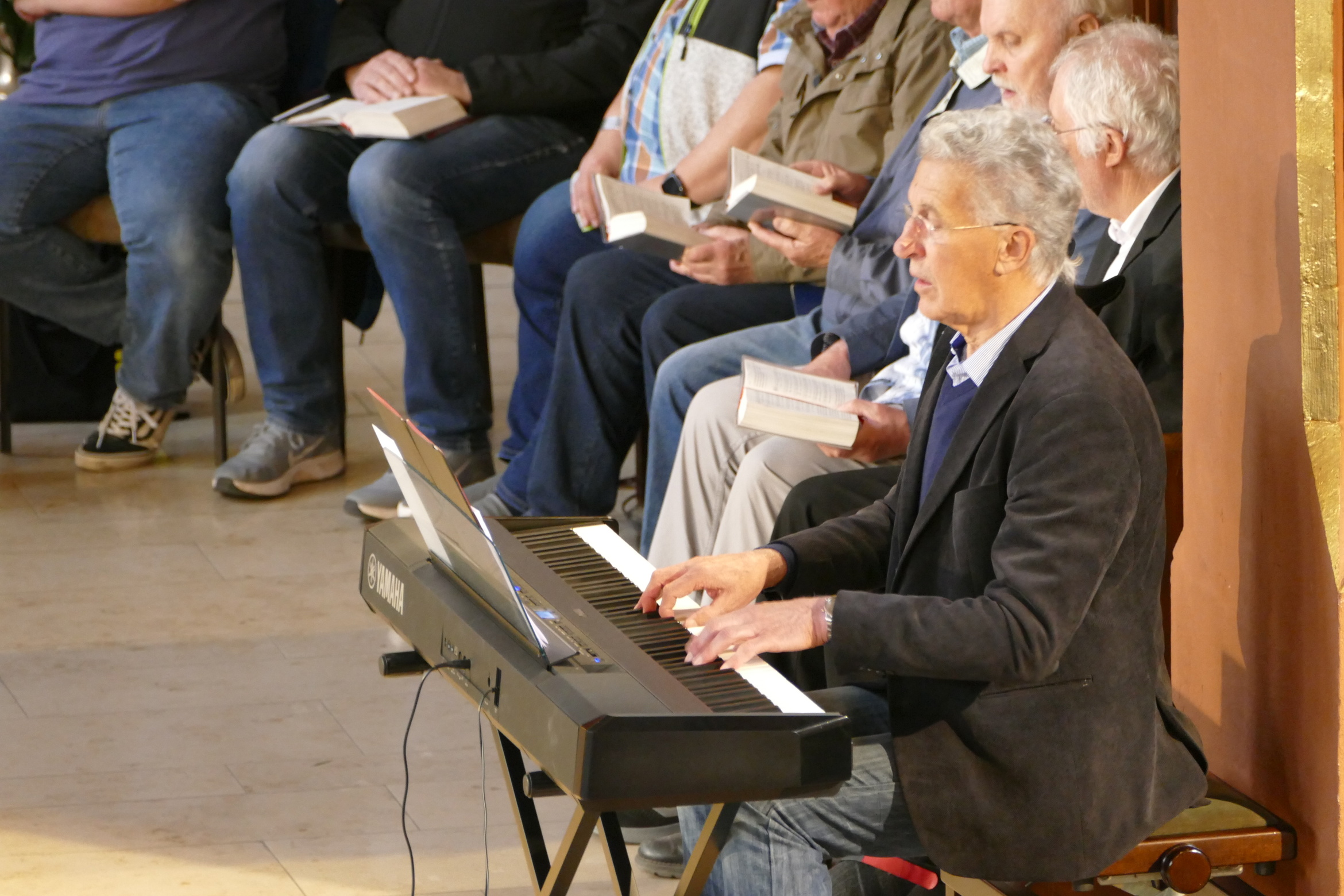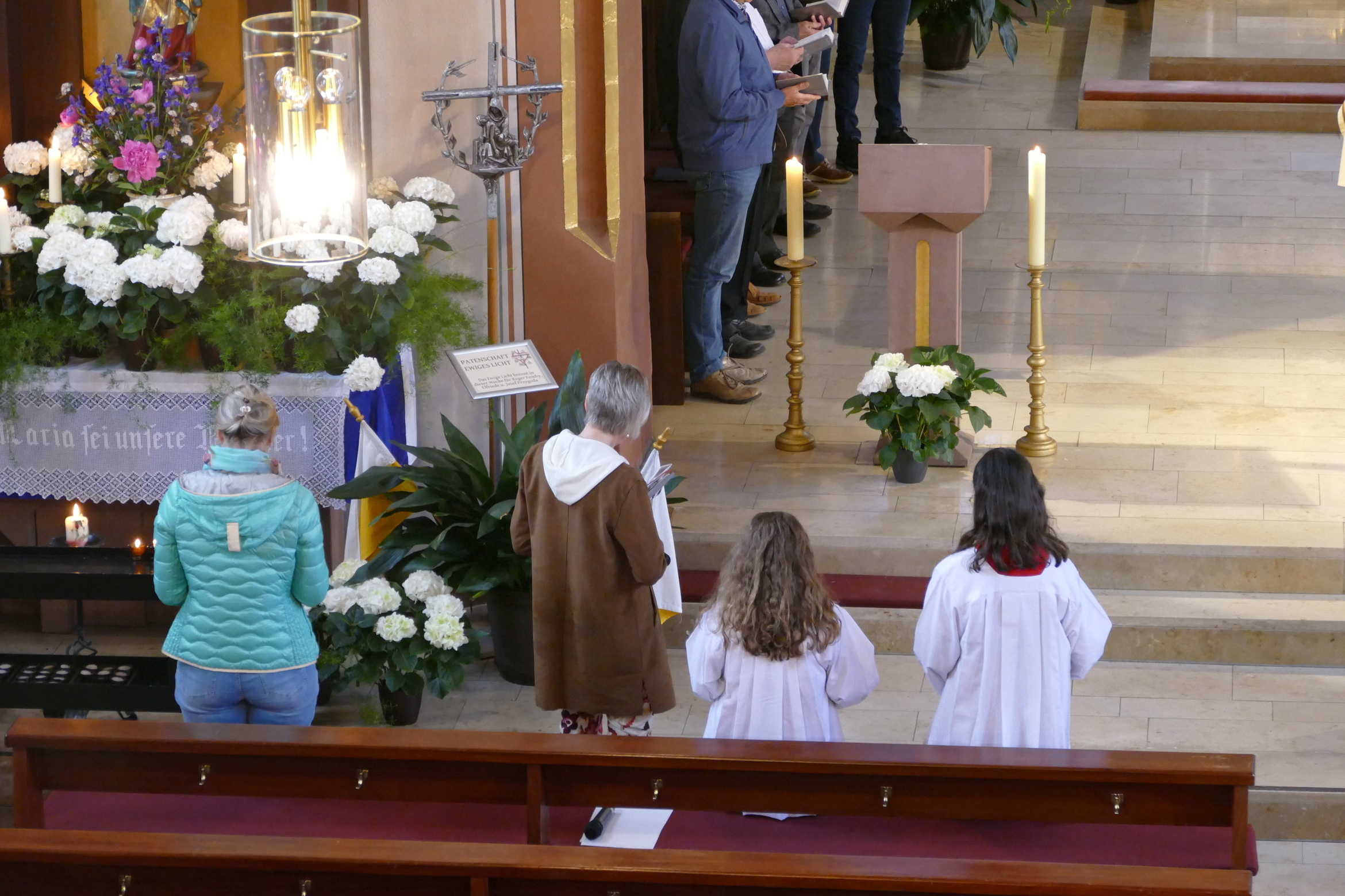 Die Begegnung zwischen Maria und Elisabeth stand im Mittelpunkt der Maiandacht, welche vom Gesangverein Frohsinn mitgestaltet wurde. Unter der Leitung von Hermann Trunk sang der Männerchor wie auch der Chor Vocapella verschiedene Marienlieder. Birgit Frank und Anke Wörner sprachen die Texte und Gebete, schlüpften bei einem Dialog in die Rolle der beiden Frauen Frauen Maria und Elisabeth. Erzählten von ihrer Hoffnung und dem Vertrauen in Gottes Hilfe.