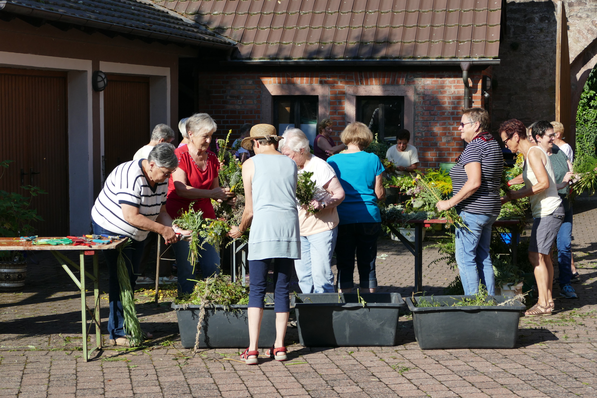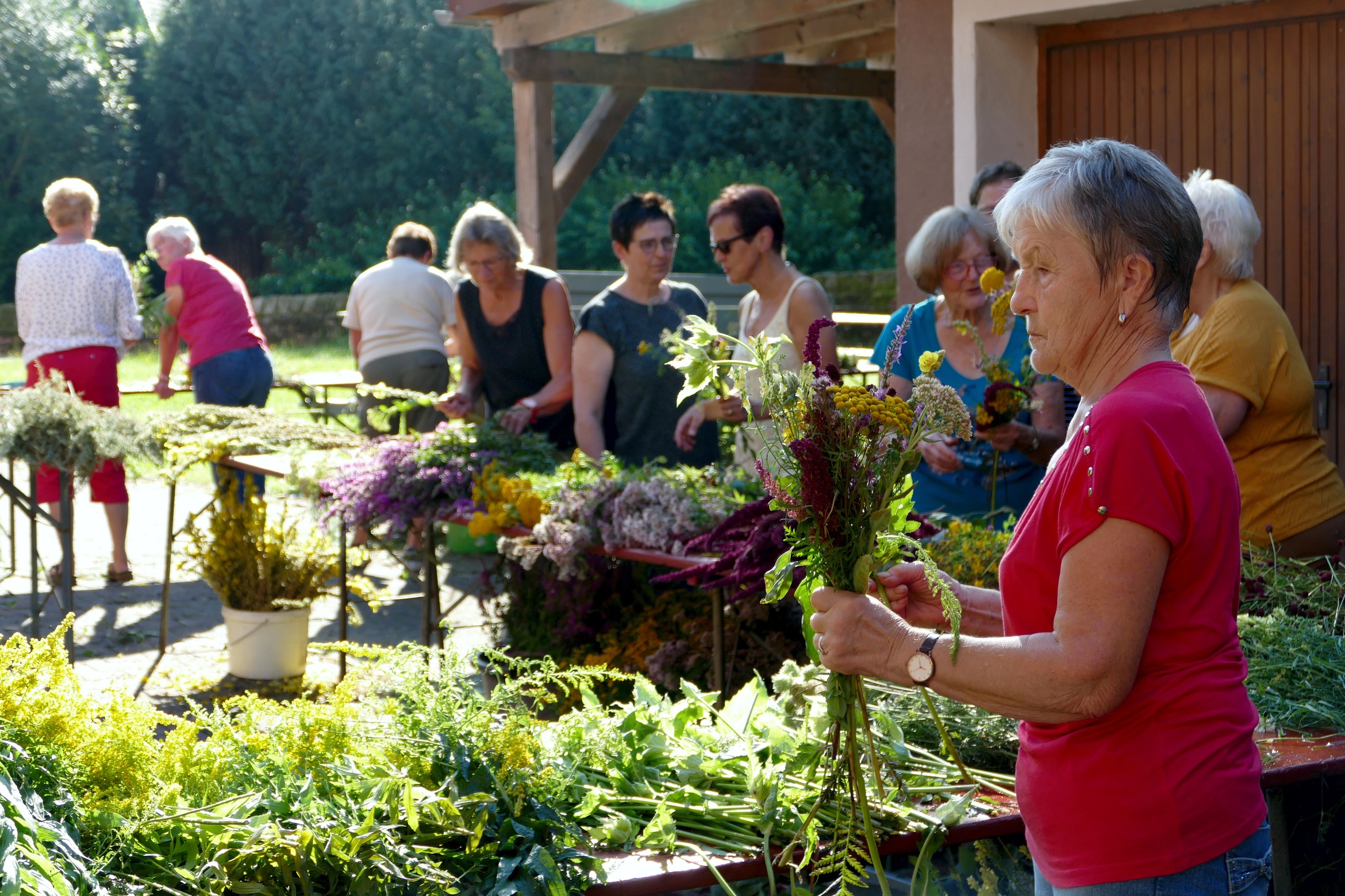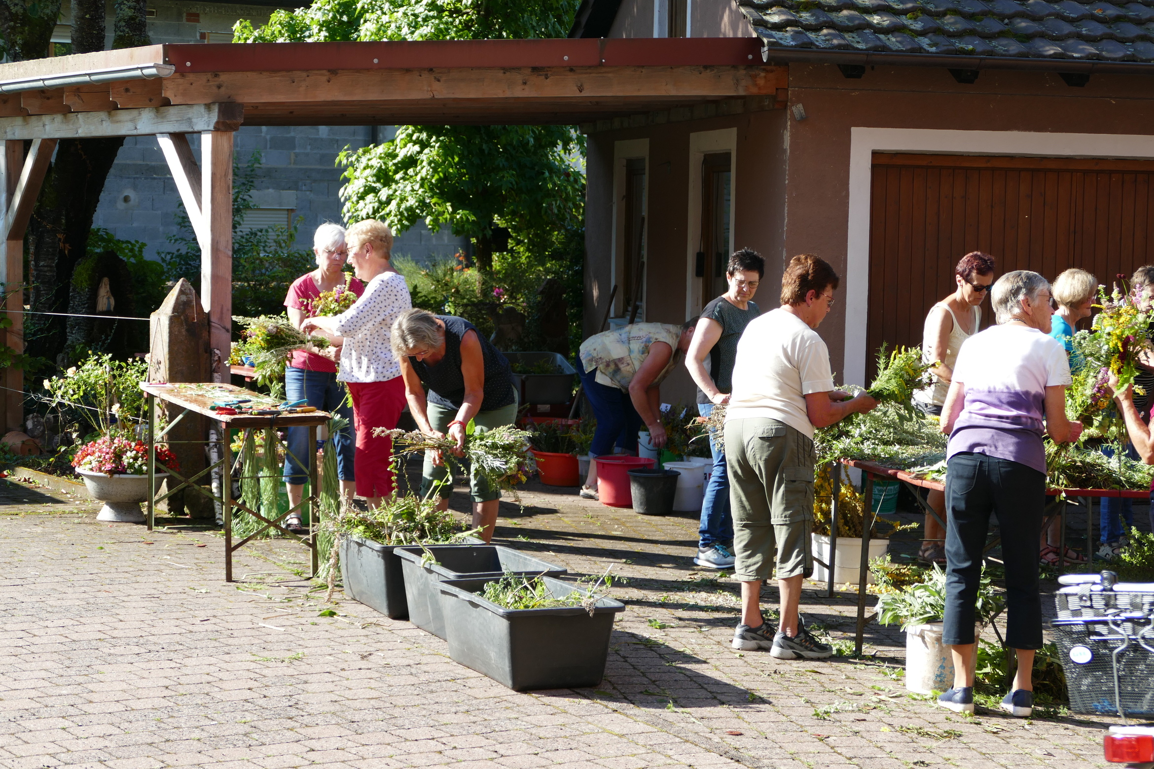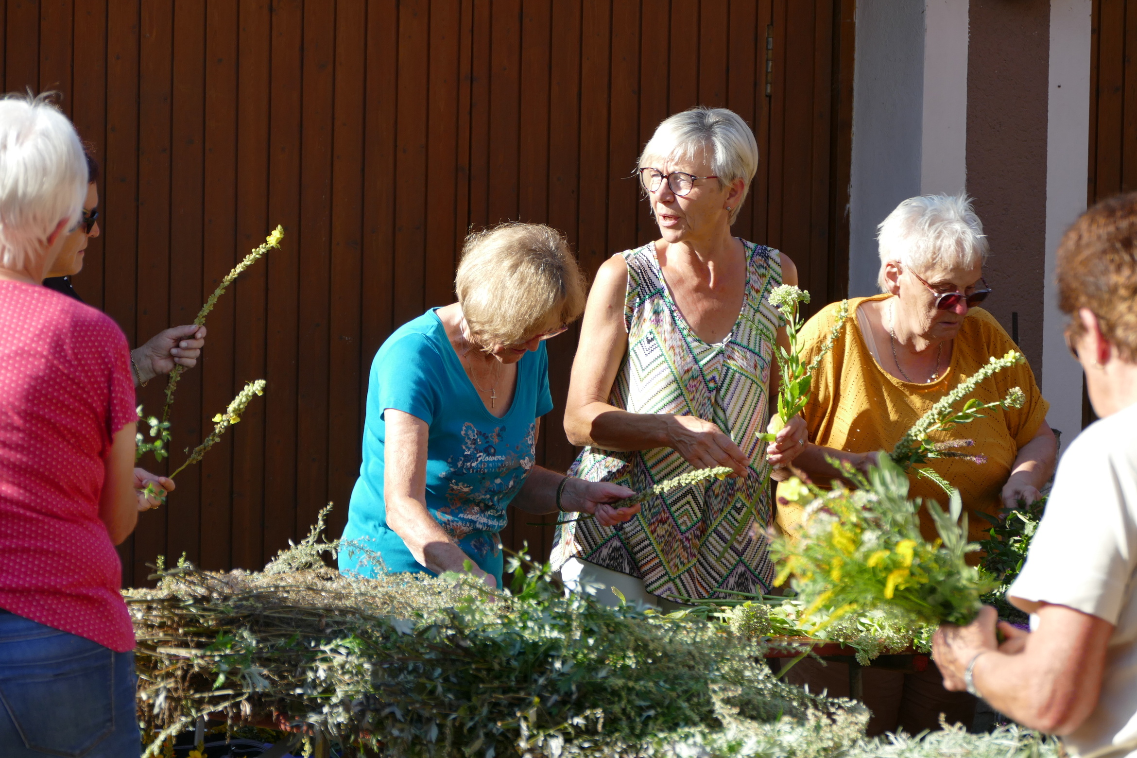 Viele fleißige Hände haben aus duftenden Blumen und Kräutern mehr als 200 Kräuterbüschel gebunden für das Fest Maria Himmelfahrt. Allerlei Heilkräuter aus den Gärten, Blumen und Pflanzen von den Wegrändern. Alles wurde mitverwendet.