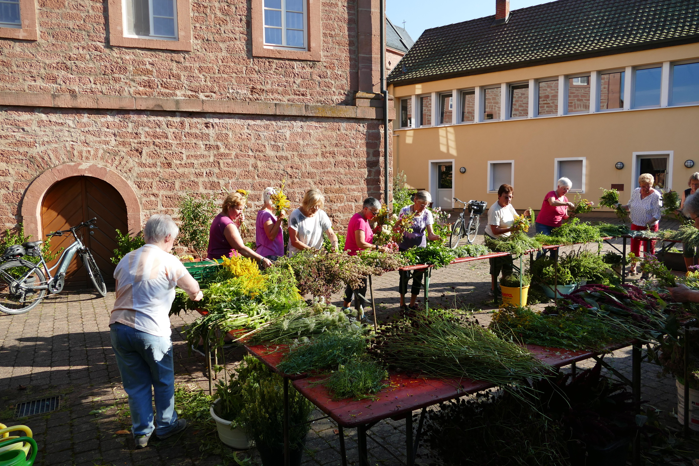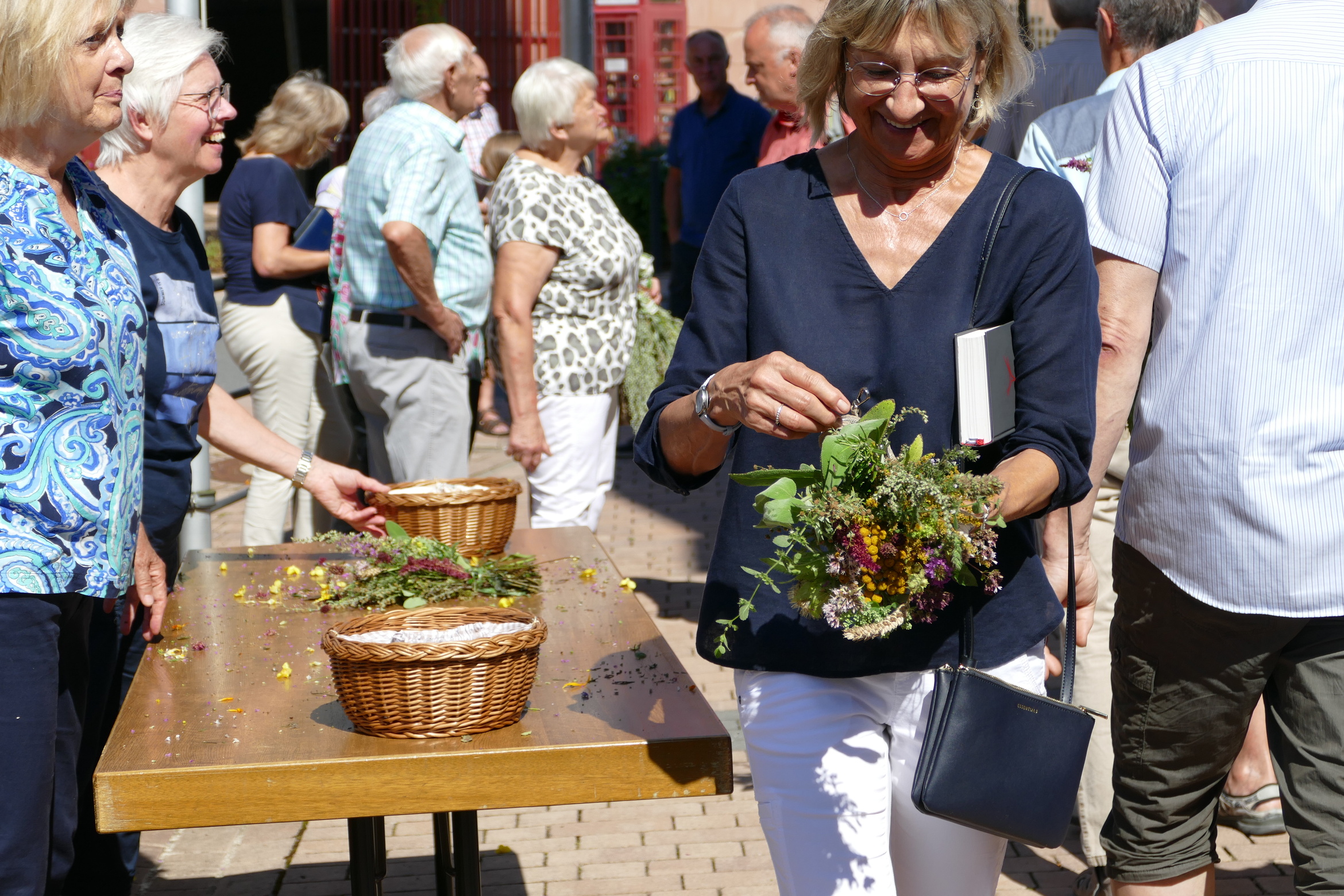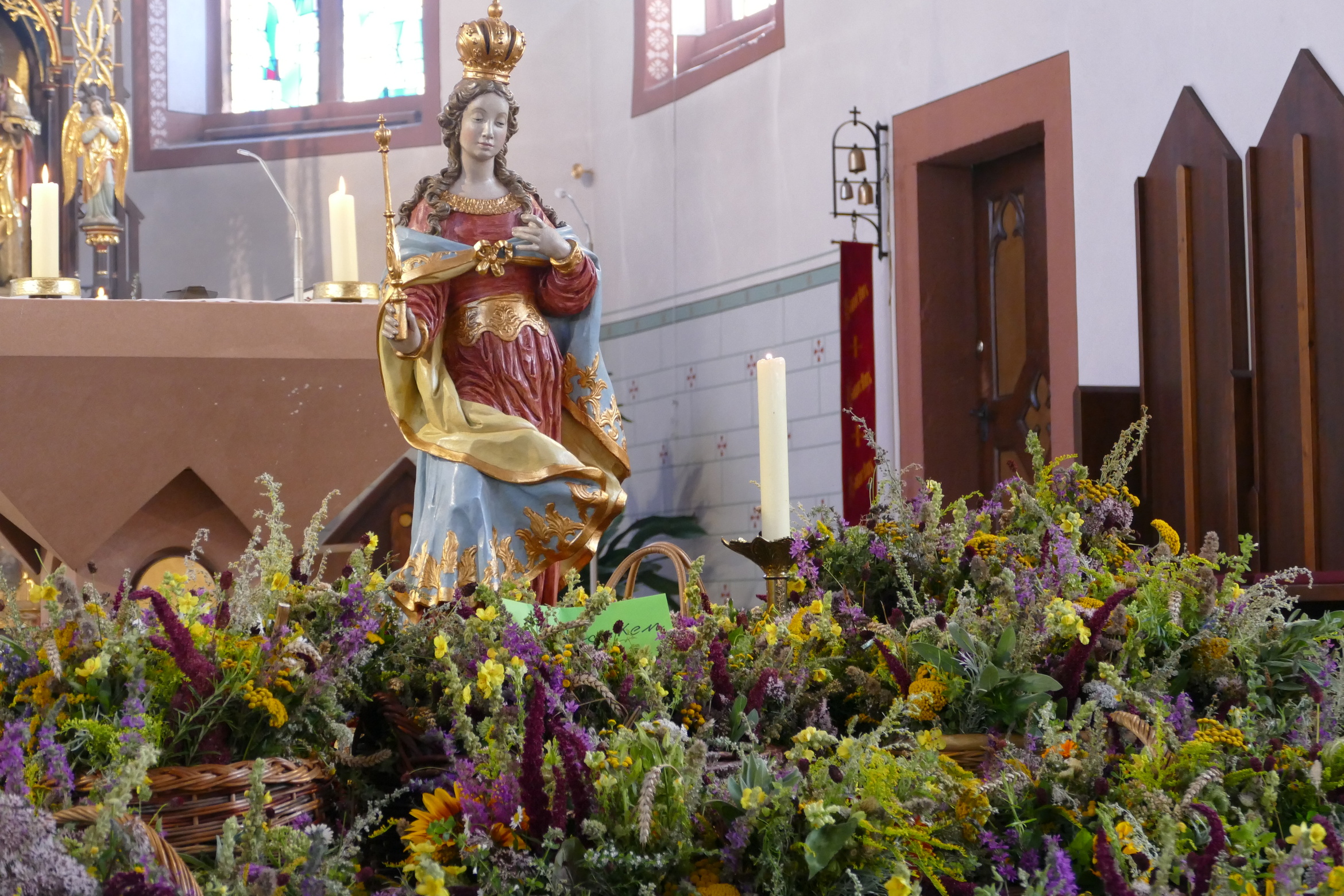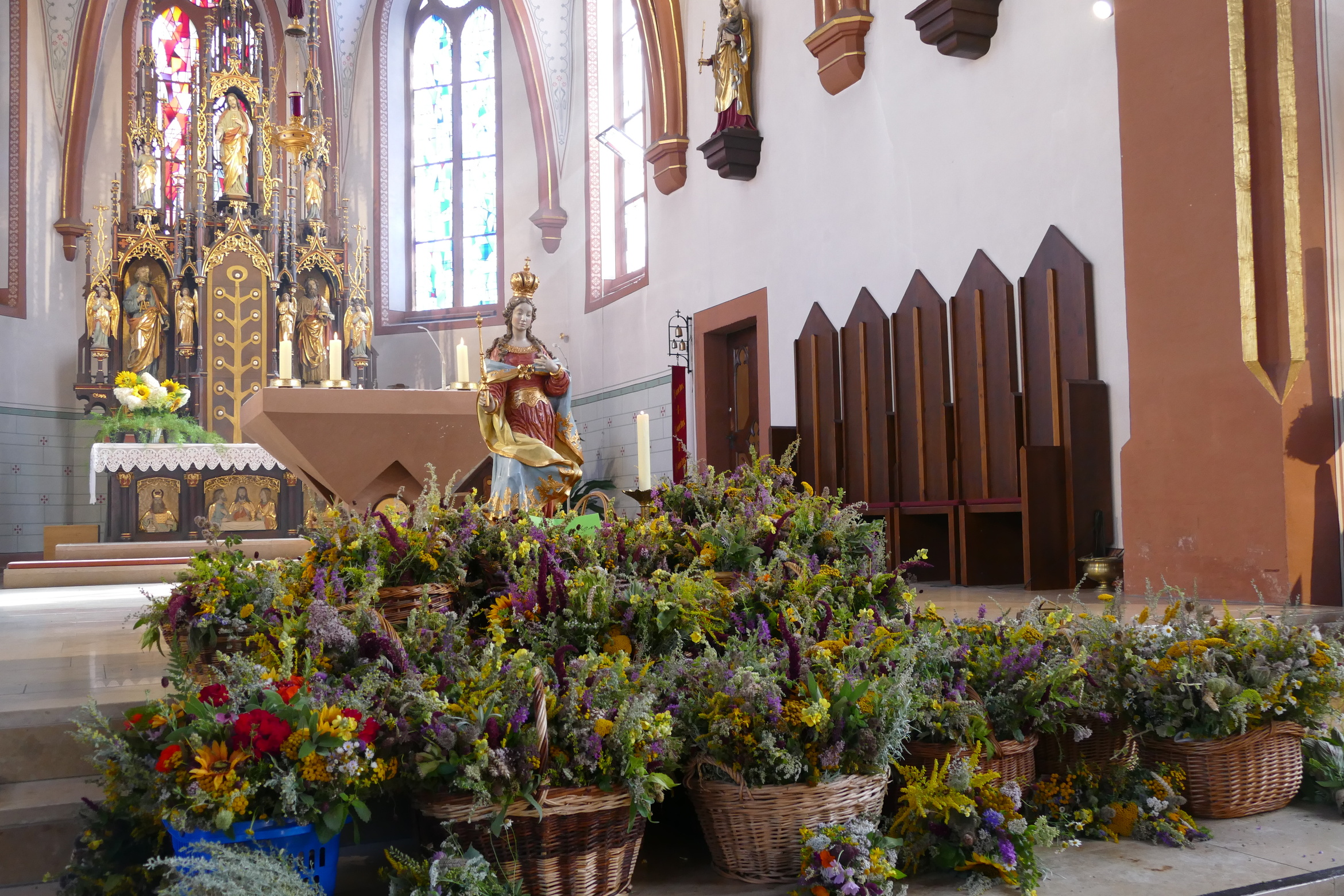 Viele fleißige Hände haben aus duftenden Blumen und Kräutern mehr als 200 Kräuterbüschel gebunden für das Fest Maria Himmelfahrt. Allerlei Heilkräuter aus den Gärten, Blumen und Pflanzen von den Wegrändern. Alles wurde mitverwendet.