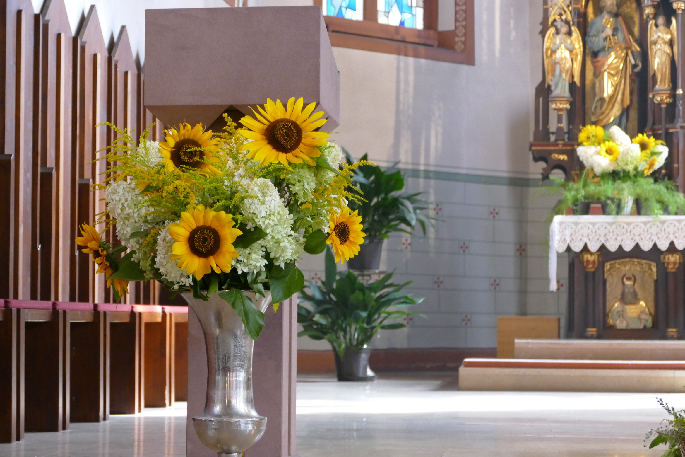 Vor dem Altar ein Meer von Sträußen, gebunden mit Blumen und Kräutern aus den Gärten und den Wegrändern der Pfarrei.