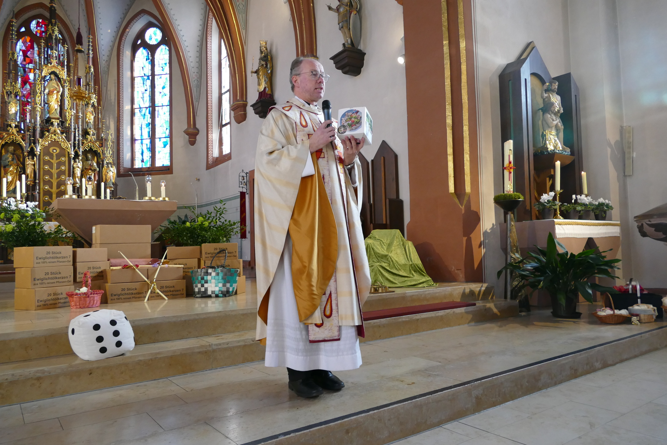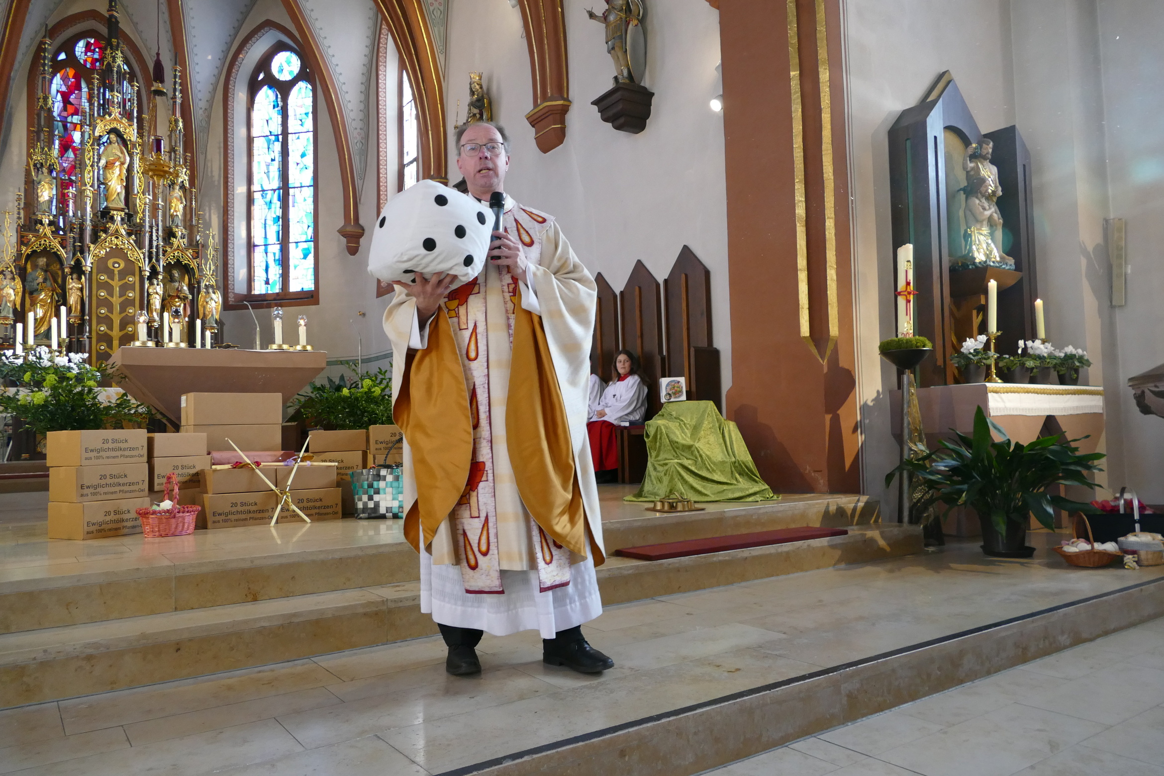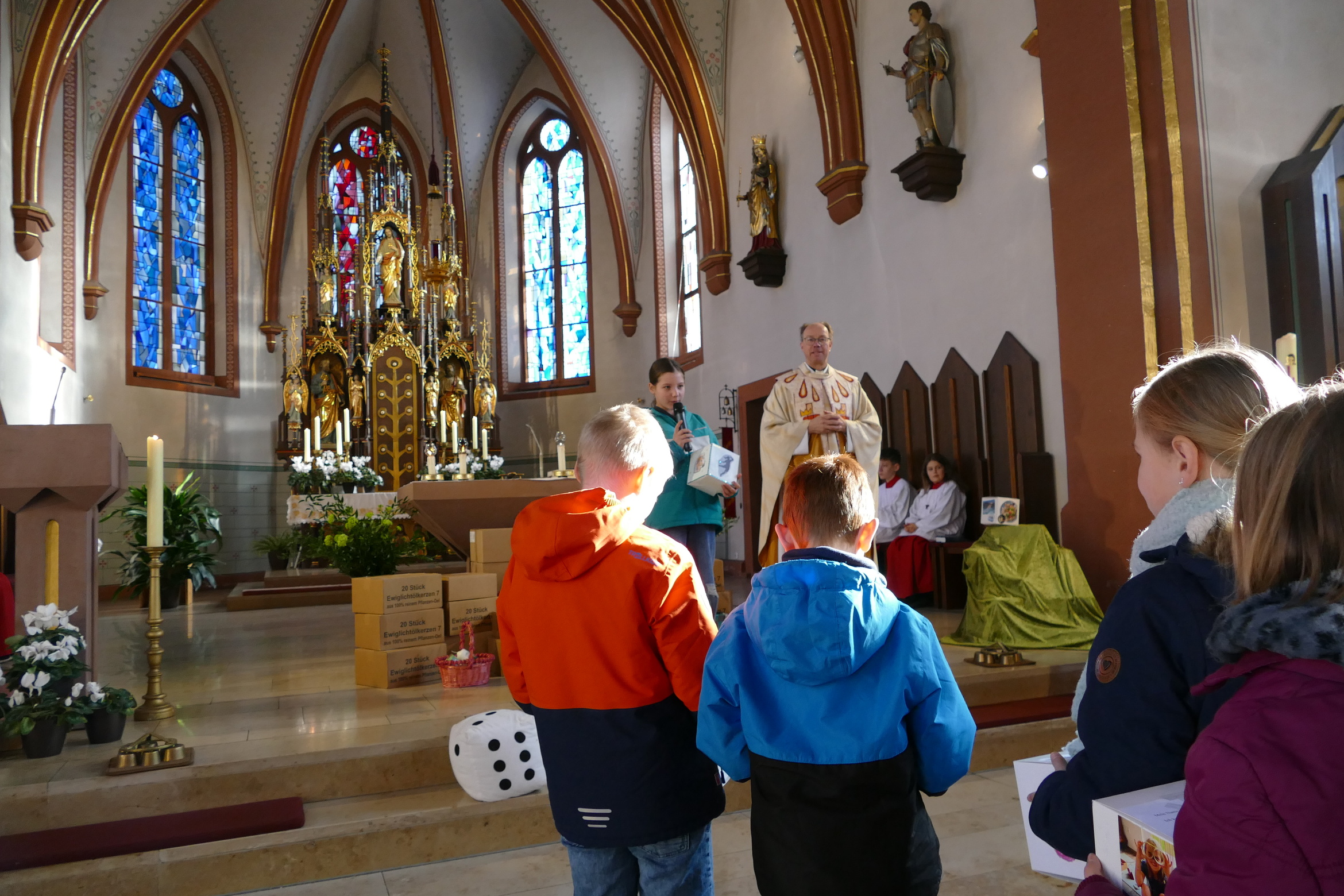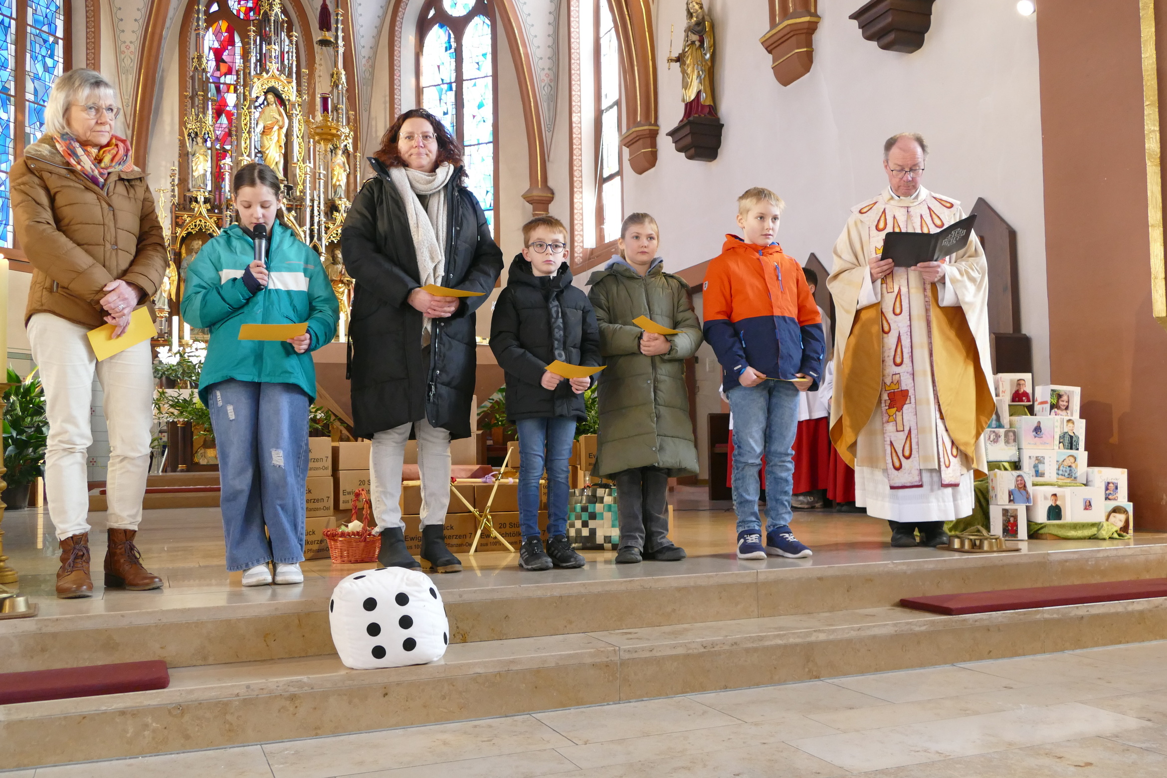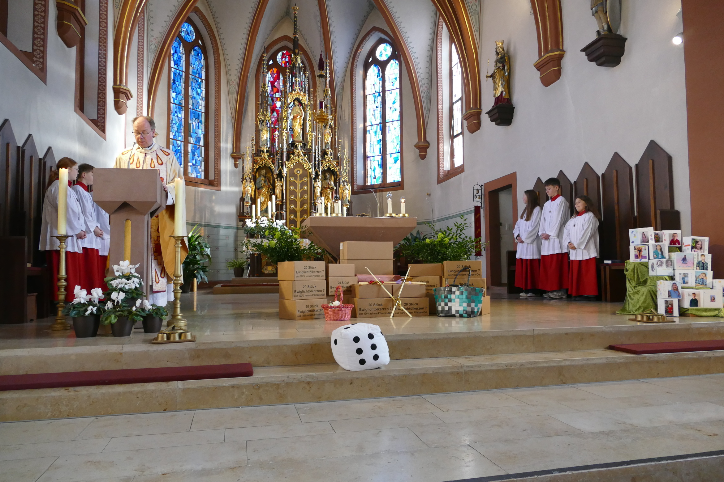 Ebenso stellten sich im Gottesdienst die diesjährigen Kommunionkinder der Gemeinde vor und brachten sich während der Feier mit ein. Unter dem Thema „Zusammengewürfelt“ bereiten sich die Kinder auf den festlichen Tag der Kommunion vor und hatten für die Kirche jeweils einen Würfel mit Namen, Hobbys und Interessen gestaltet. Zusammen mit den beiden Katechetinnen Andrea Schobert und Ramona Arends werden die Weggottesdienste und die Feiern vorbereitet und durchgeführt.
