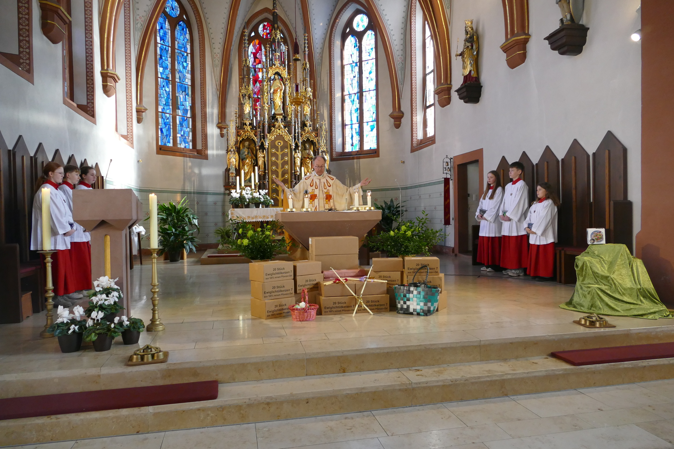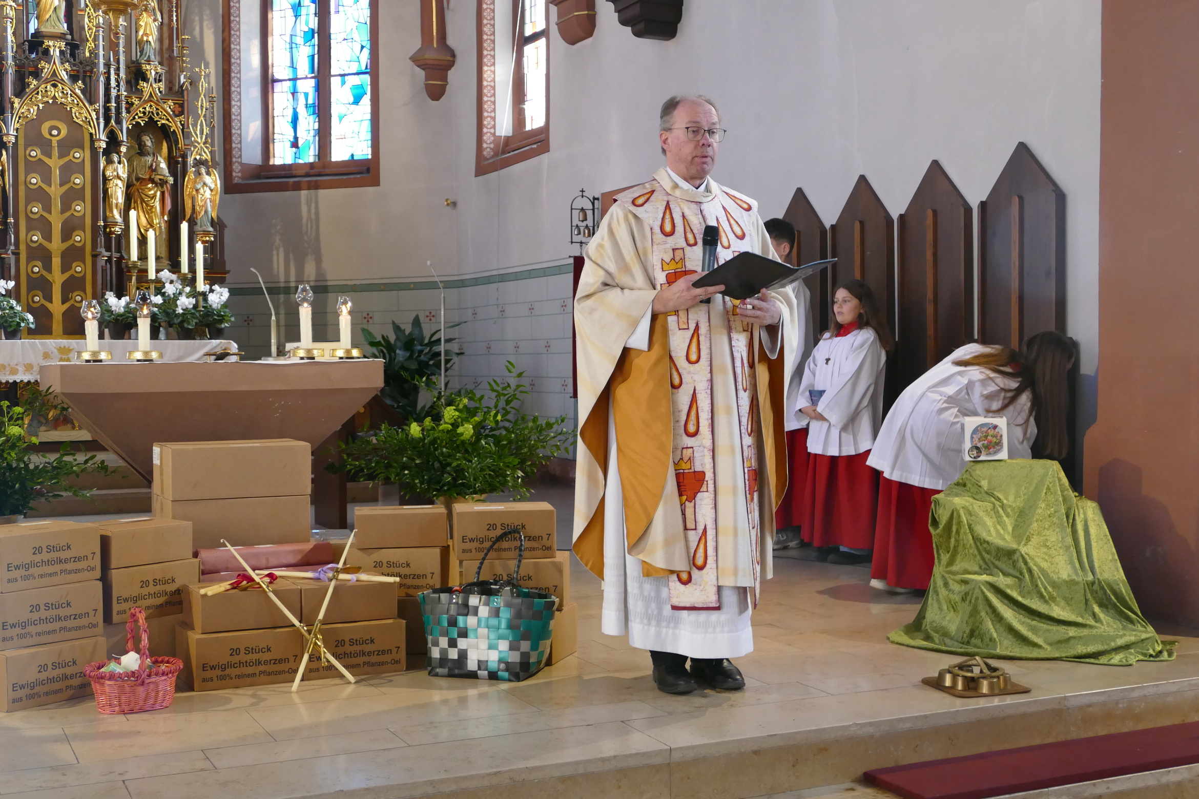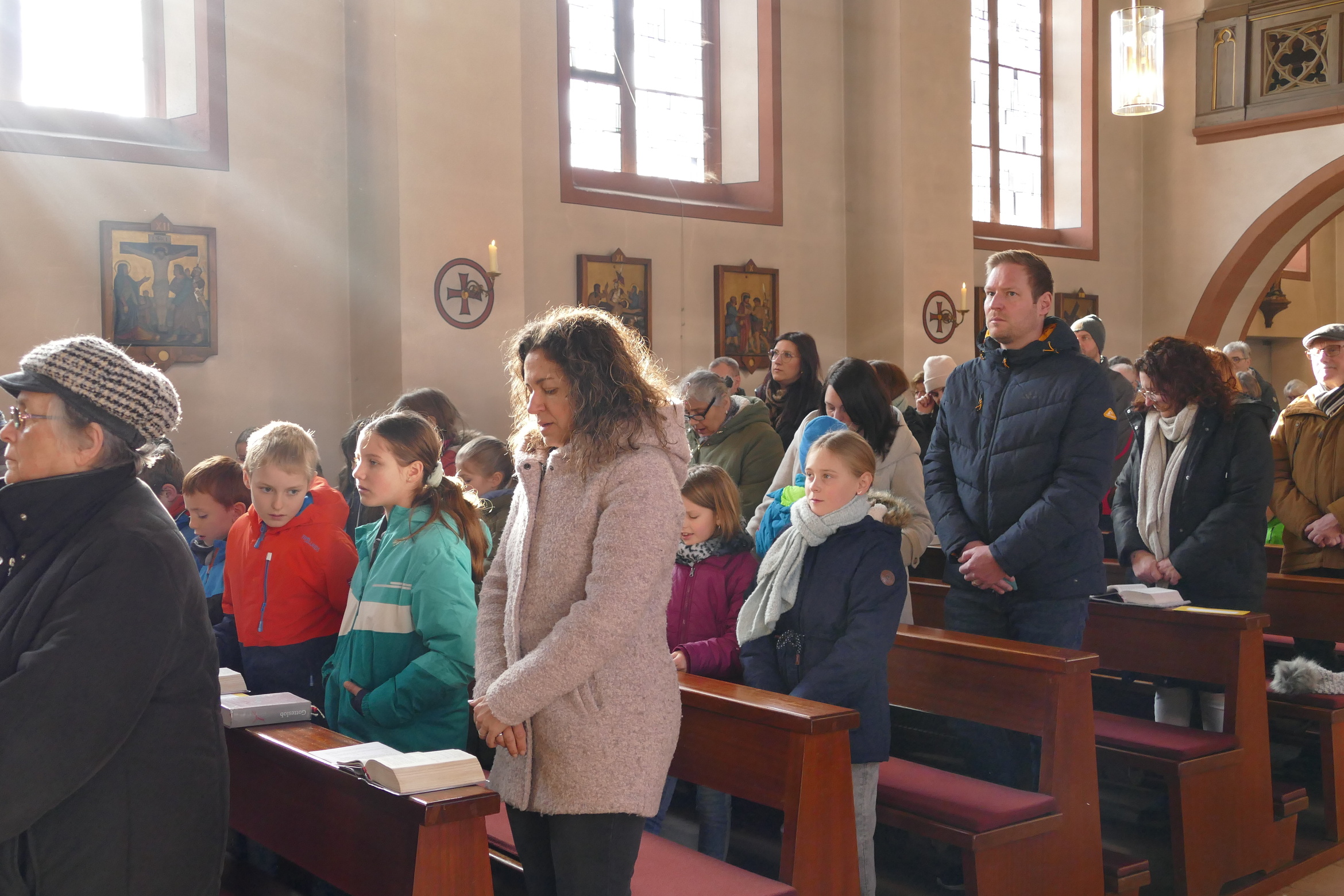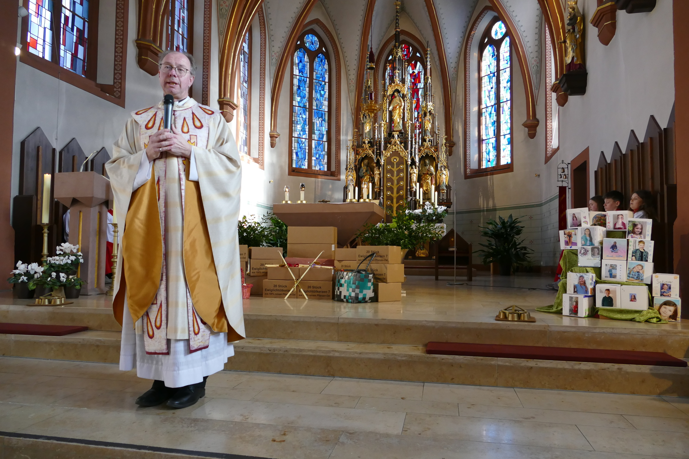 Ebenso stellten sich im Gottesdienst die diesjährigen Kommunionkinder der Gemeinde vor und brachten sich während der Feier mit ein. Unter dem Thema „Zusammengewürfelt“ bereiten sich die Kinder auf den festlichen Tag der Kommunion vor und hatten für die Kirche jeweils einen Würfel mit Namen, Hobbys und Interessen gestaltet. Zusammen mit den beiden Katechetinnen Andrea Schobert und Ramona Arends werden die Weggottesdienste und die Feiern vorbereitet und durchgeführt.