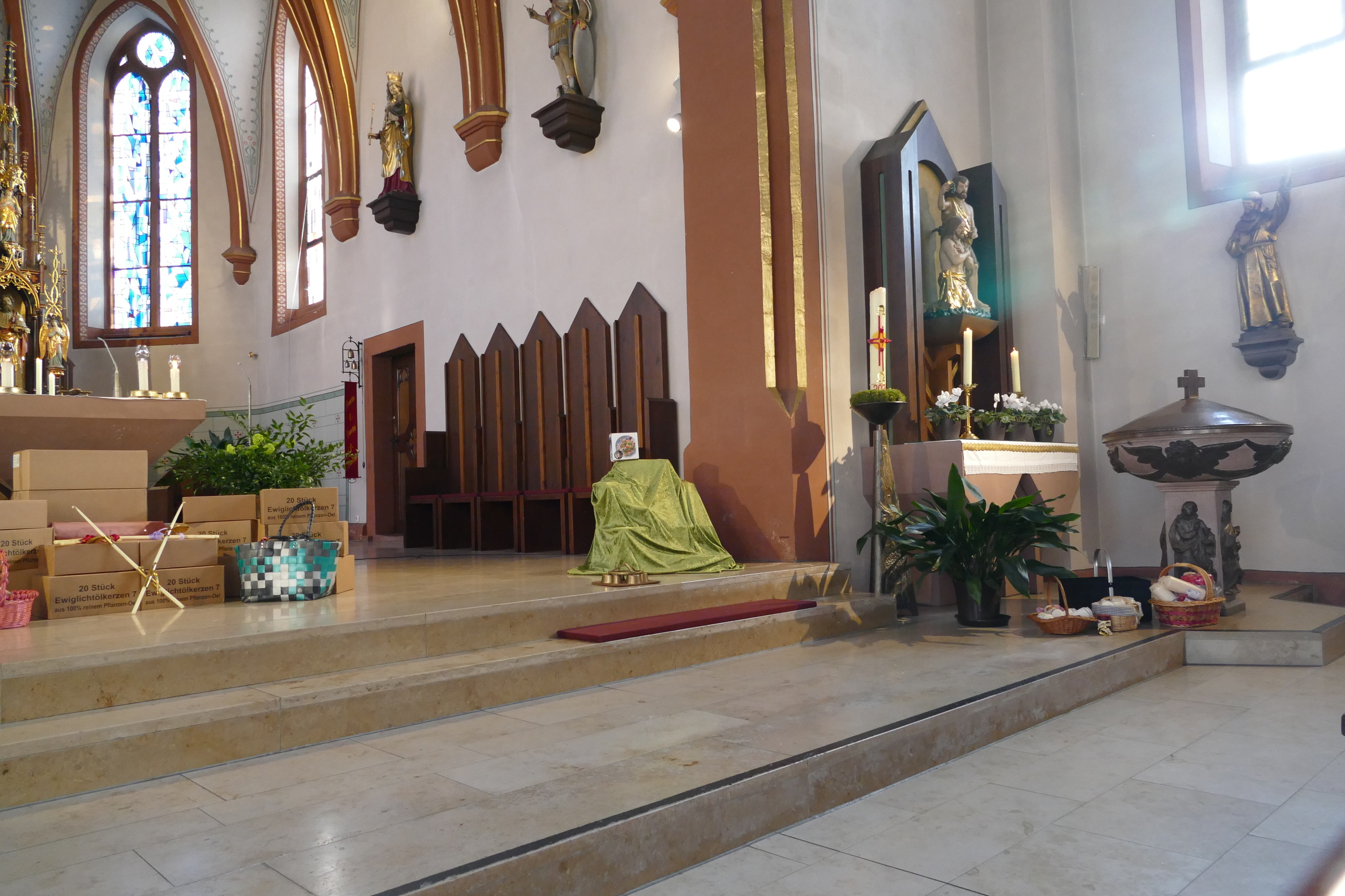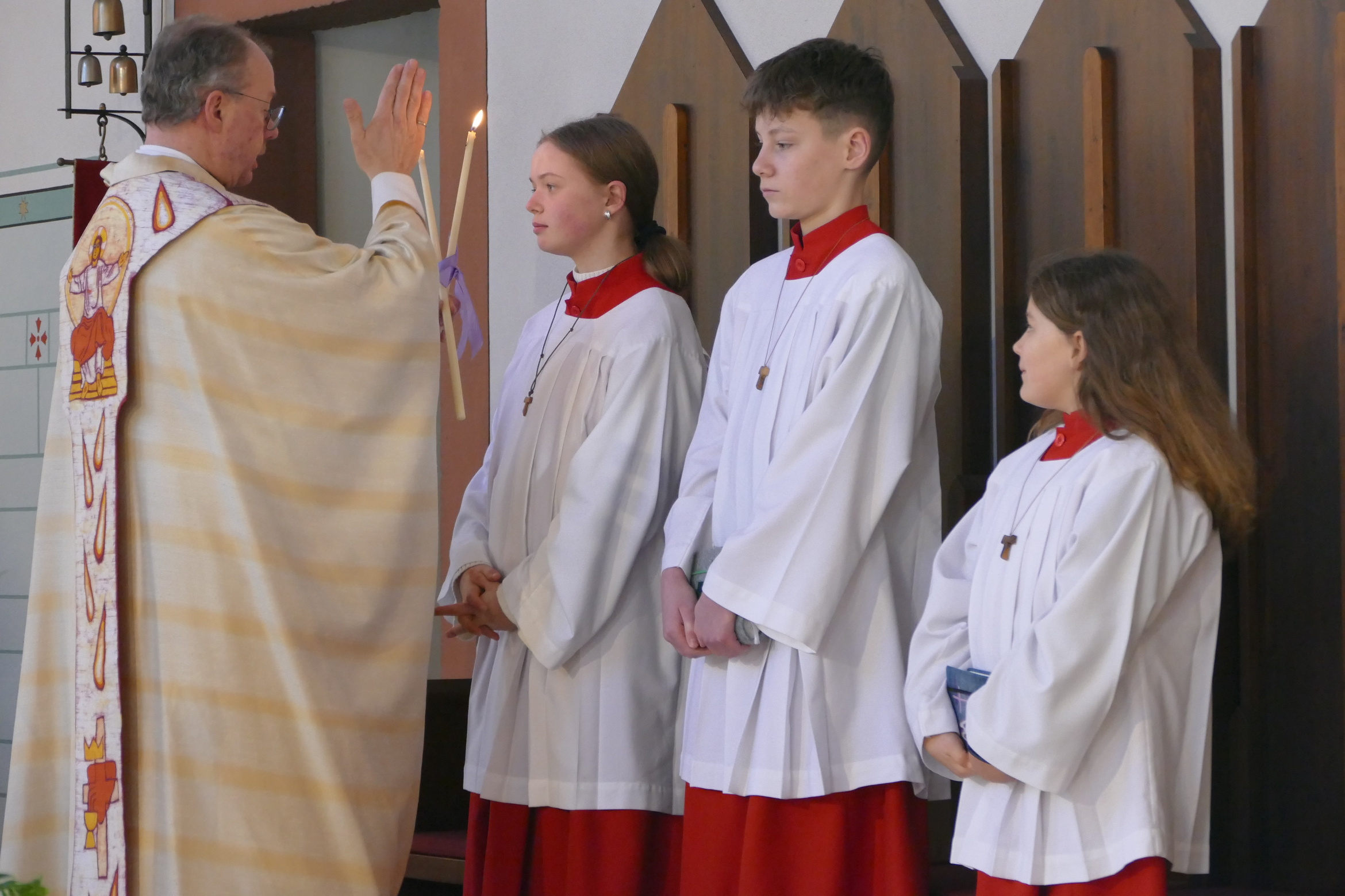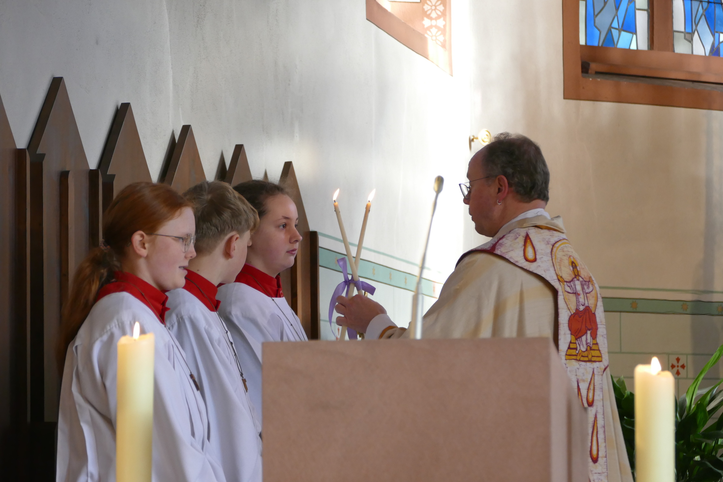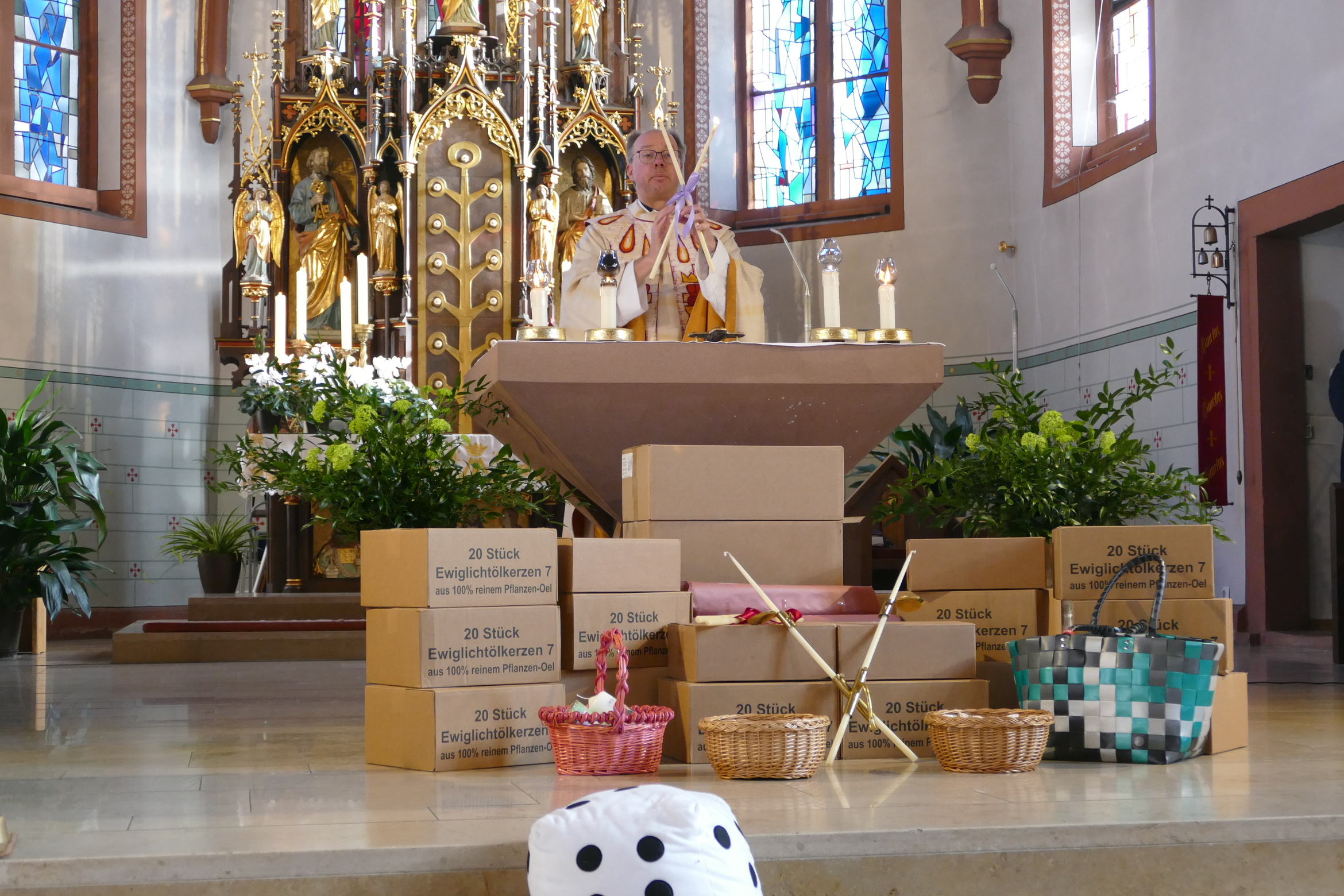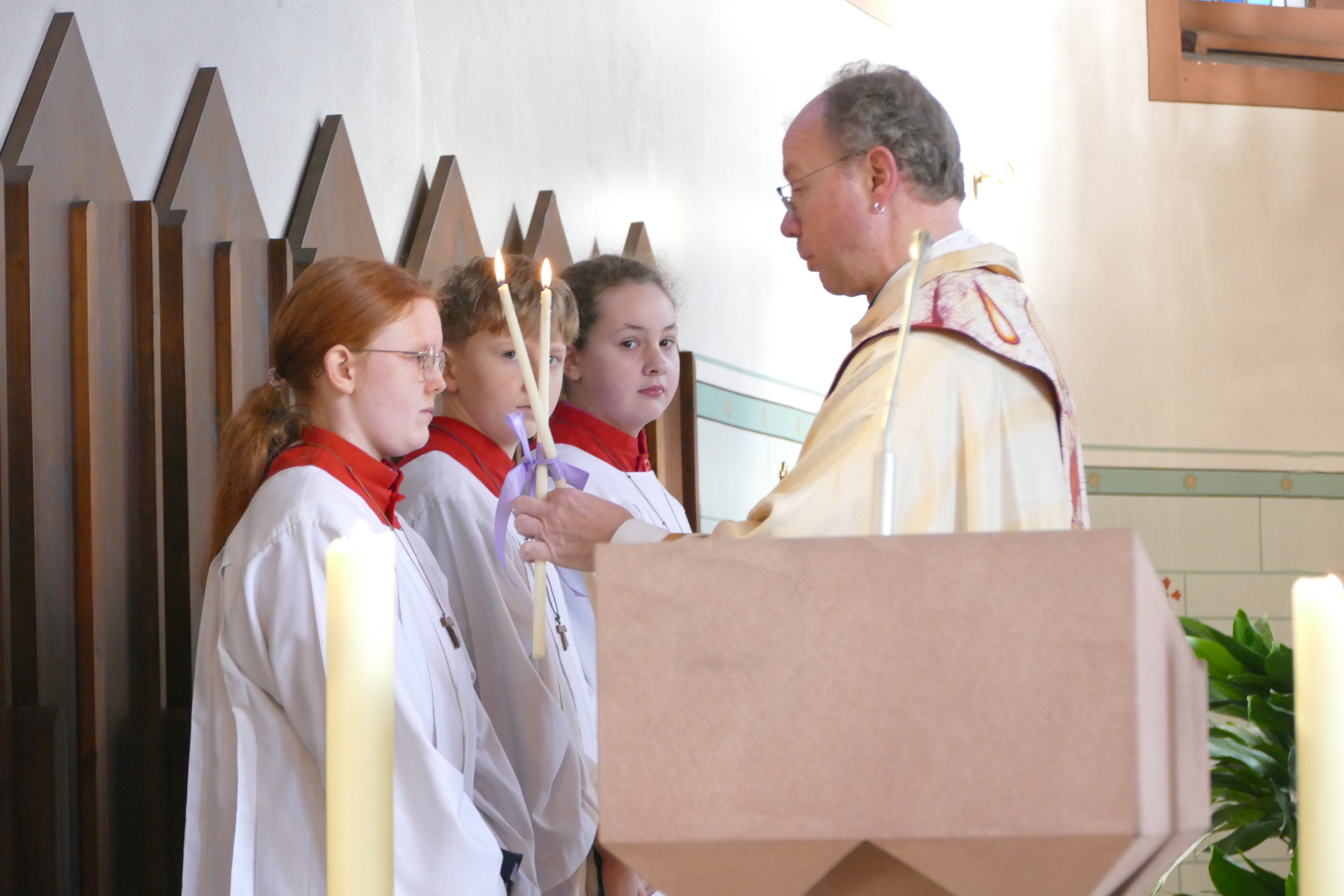 Ebenso stellten sich im Gottesdienst die diesjährigen Kommunionkinder der Gemeinde vor und brachten sich während der Feier mit ein. Unter dem Thema „Zusammengewürfelt“ bereiten sich die Kinder auf den festlichen Tag der Kommunion vor und hatten für die Kirche jeweils einen Würfel mit Namen, Hobbys und Interessen gestaltet. Zusammen mit den beiden Katechetinnen Andrea Schobert und Ramona Arends werden die Weggottesdienste und die Feiern vorbereitet und durchgeführt.