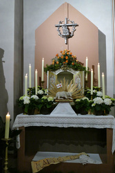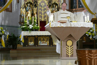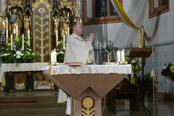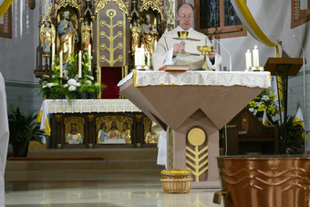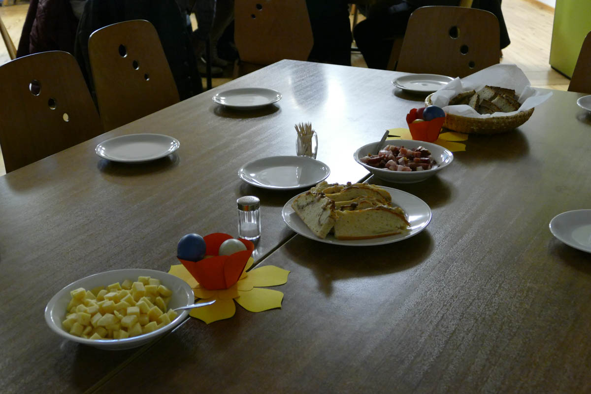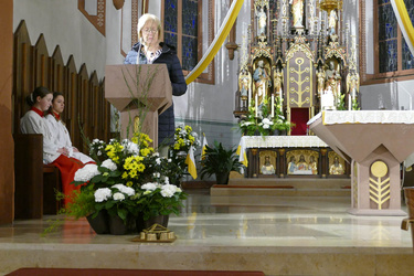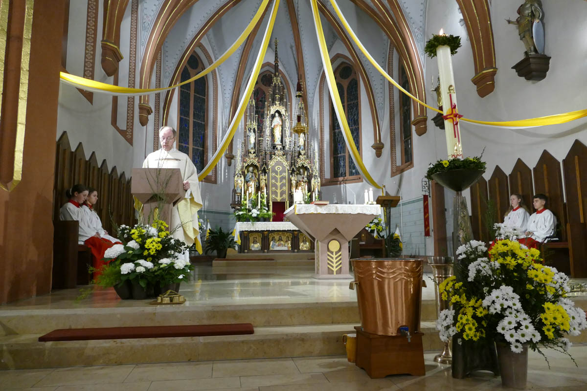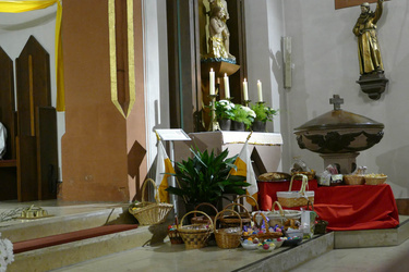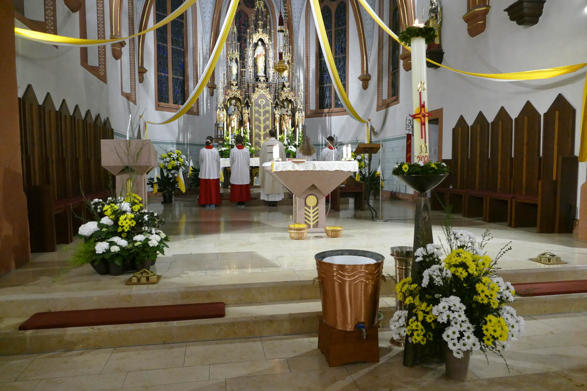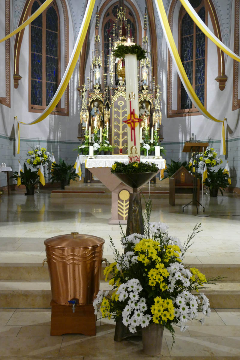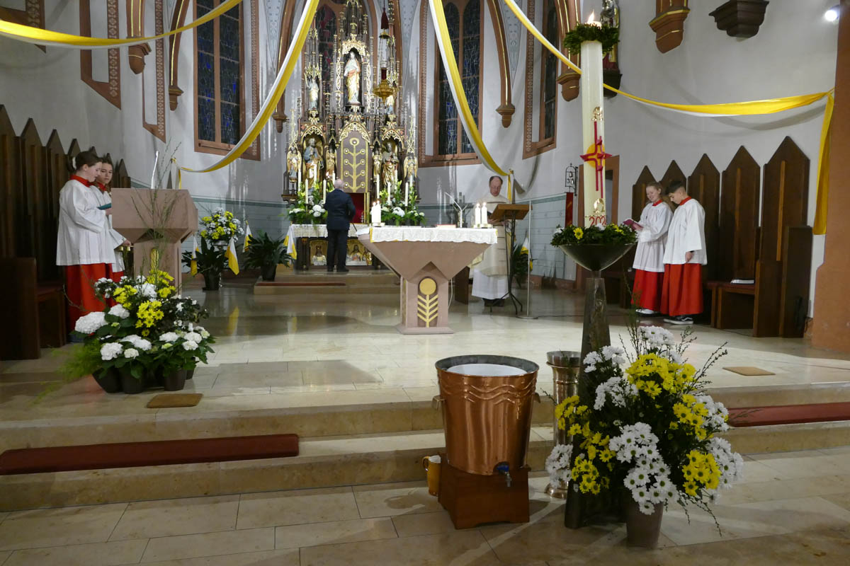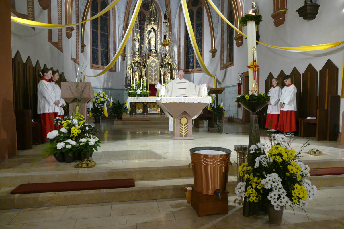 Das österliche Wasser wurde gesegnet und in Erinnerung an die eigene Taufe über die Gottesdienstbesucher ausgebracht. Zum Ende des Gottesdienstes fand die Segnung der österlichen Speisen und das Fest des Lebens im Pfarrheim statt.