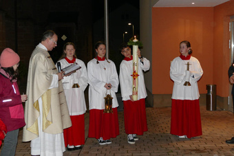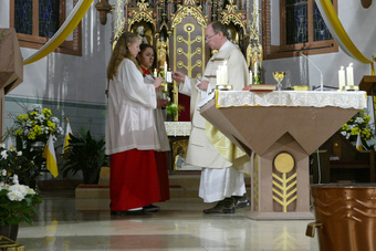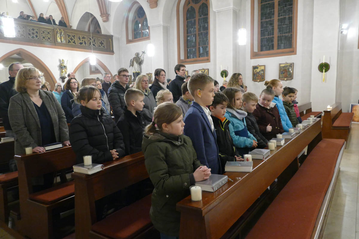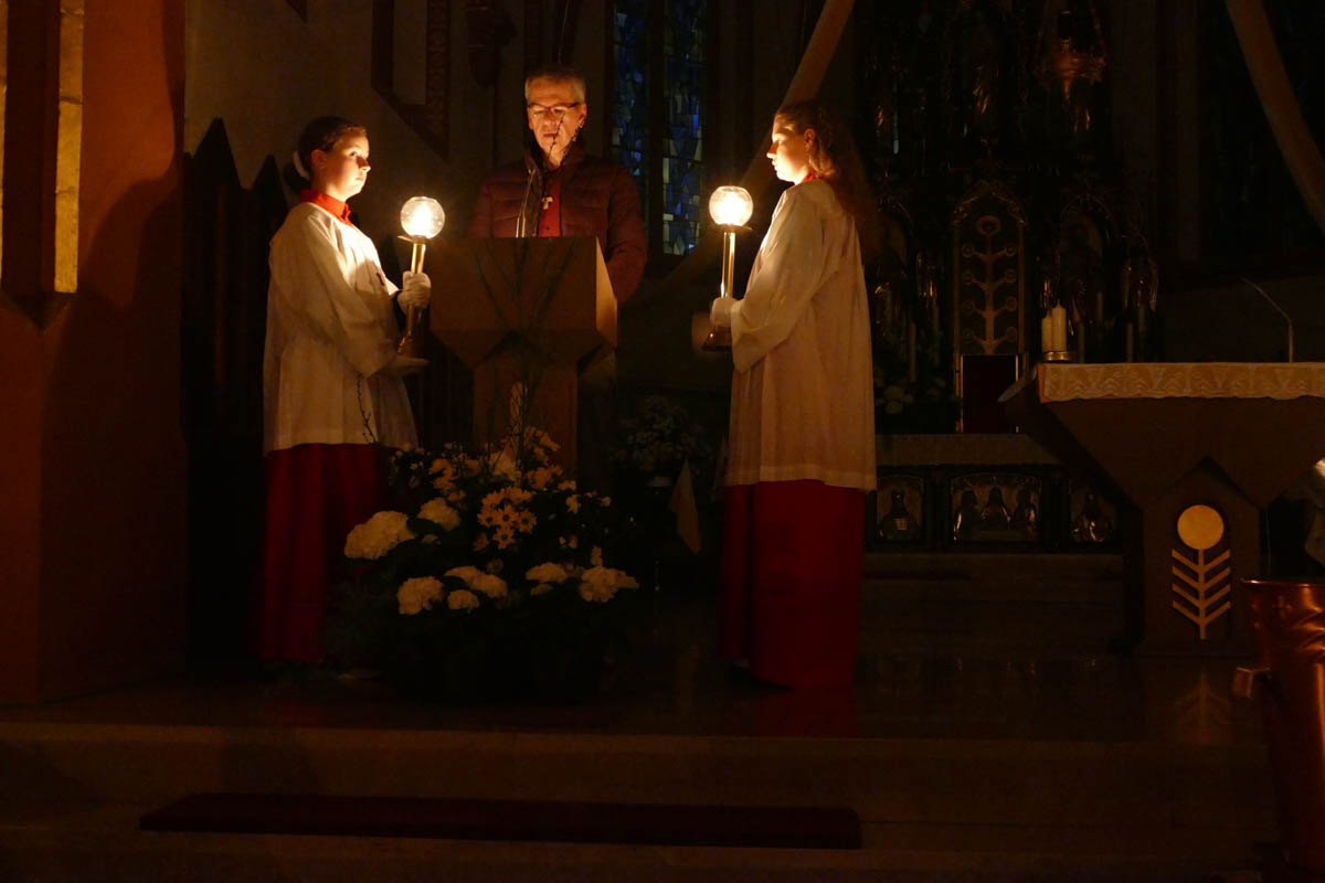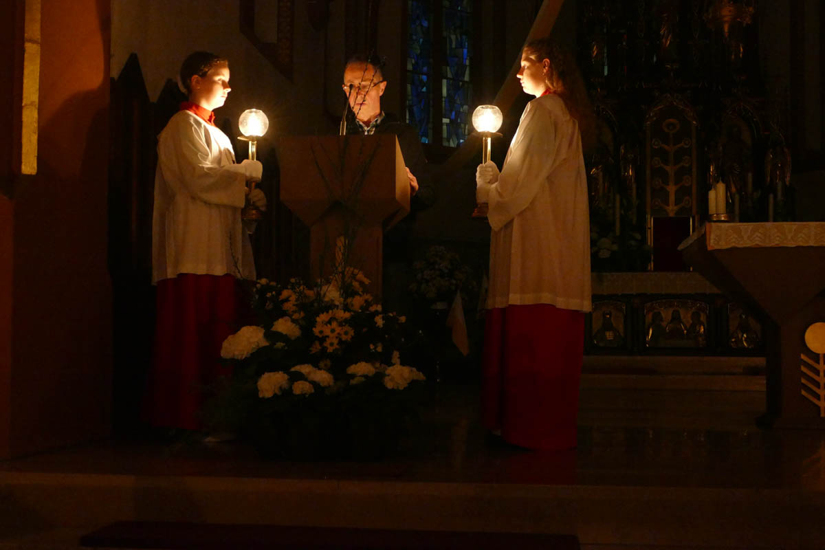 Die Kommunionkinder versammelten sich mit den Ministranten und Pfarrer Michael Prokschi um das Osterfeuer und verfolgten die Segnung der Osterkerze wie auch das Entzünden. Sie zogen gemeinsam mit in die dunkle Kirche ein und gaben das Licht an die Gottesdienstbesucher weiter. Nach dem feierlichen Osterlob und den Lesungen aus dem alten Testament spielte zum Gloria wieder die Orgel und es läuteten die Glocken. Die Karfreitage des eigenen Lebens im Licht von Ostern, im Licht der Auferstehung deuten, so lud Pfr. Prokschi die Gottesdienstbesucher ein. Eben nicht stehen bleiben, vielmehr wie die Frauen sich aufmachen, aktiv werden, eine neue Blickrichtung erhalten.