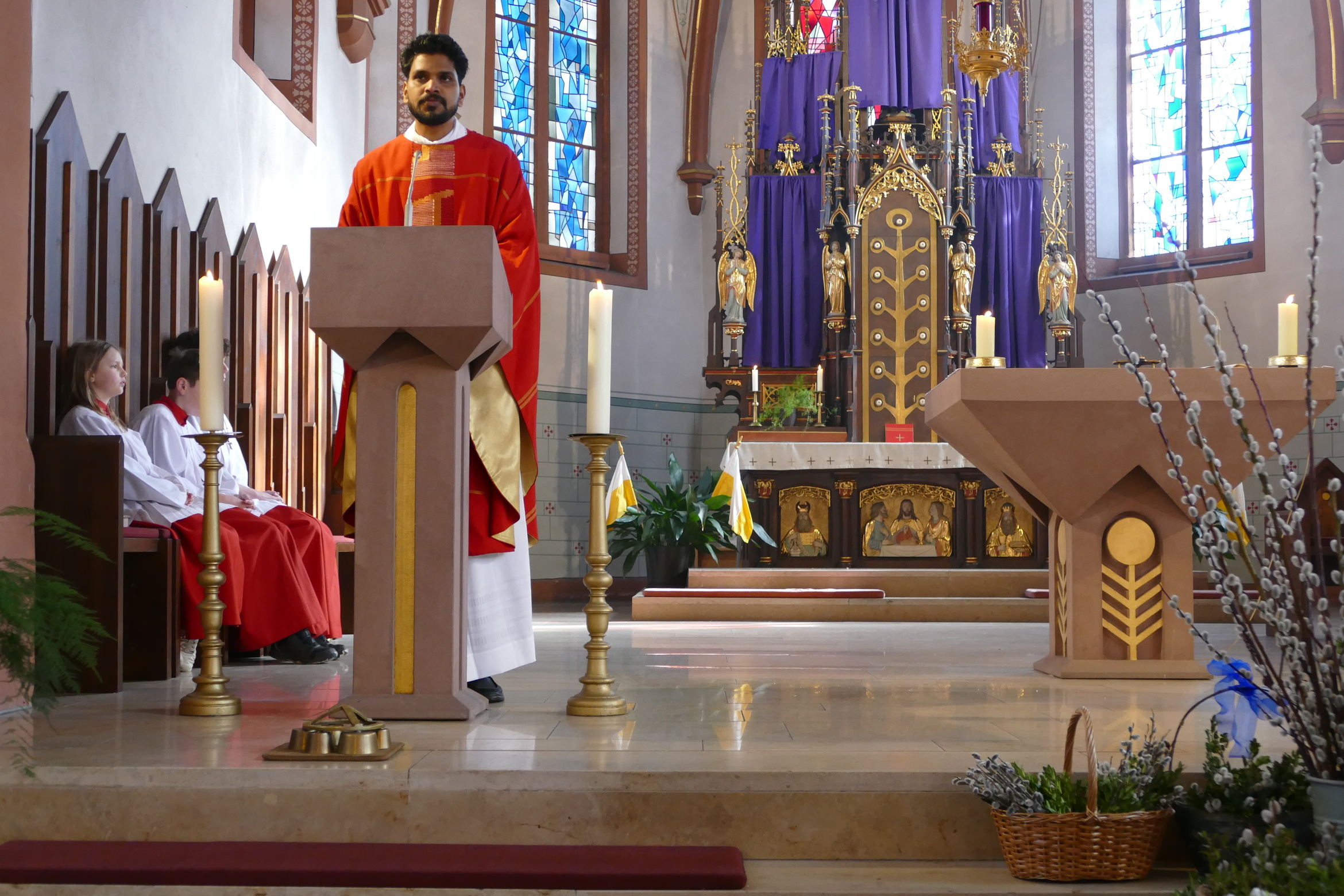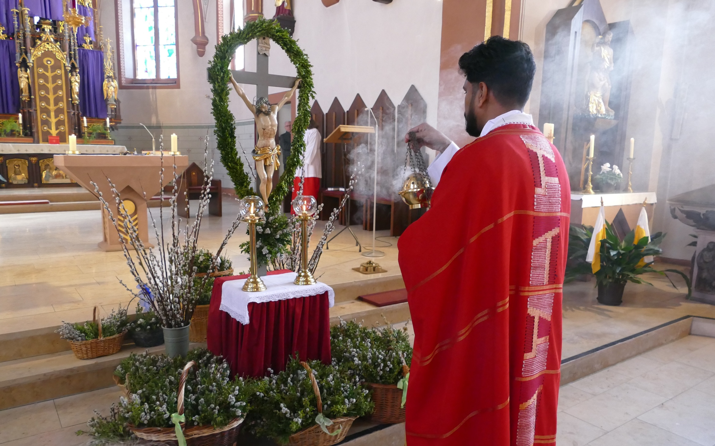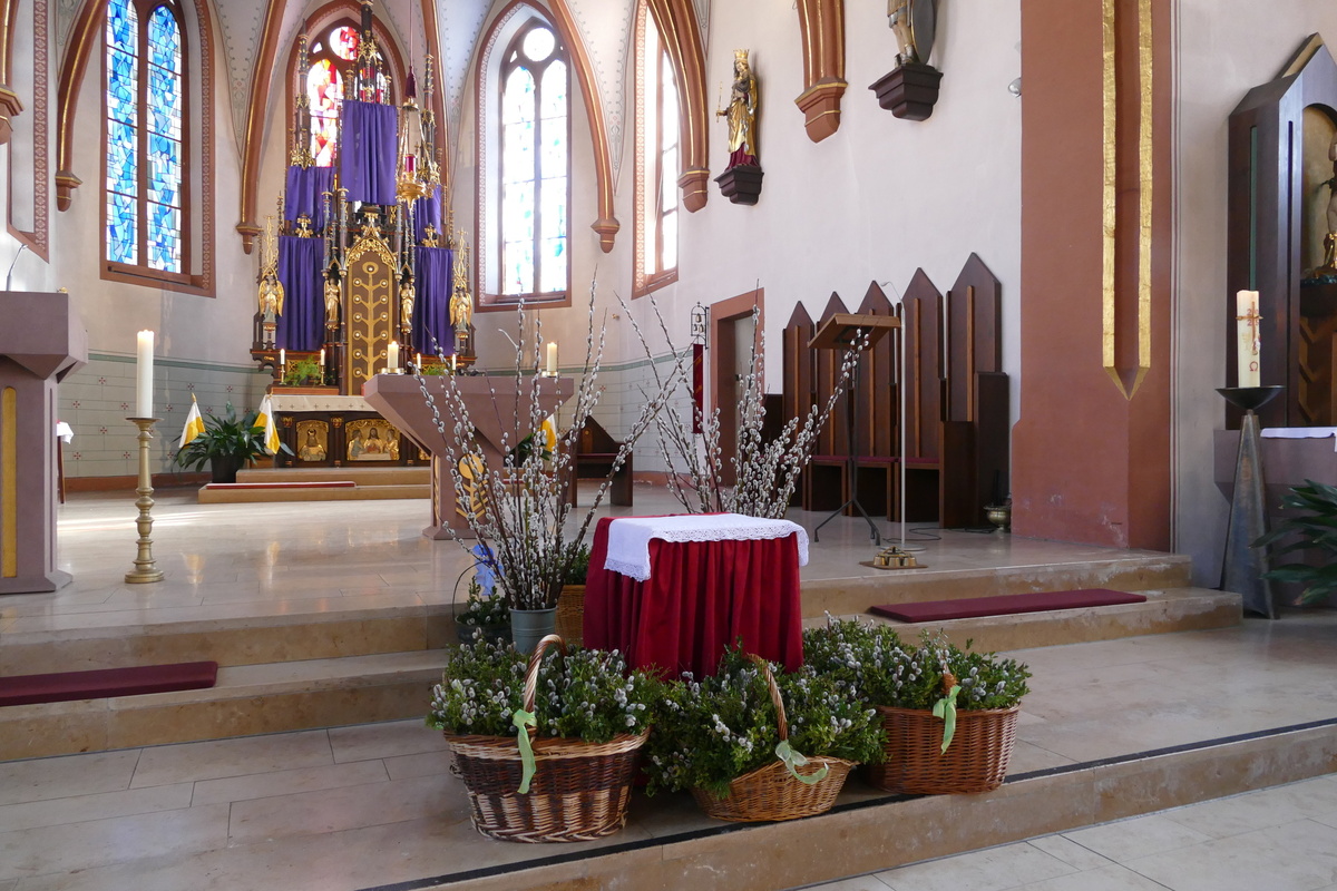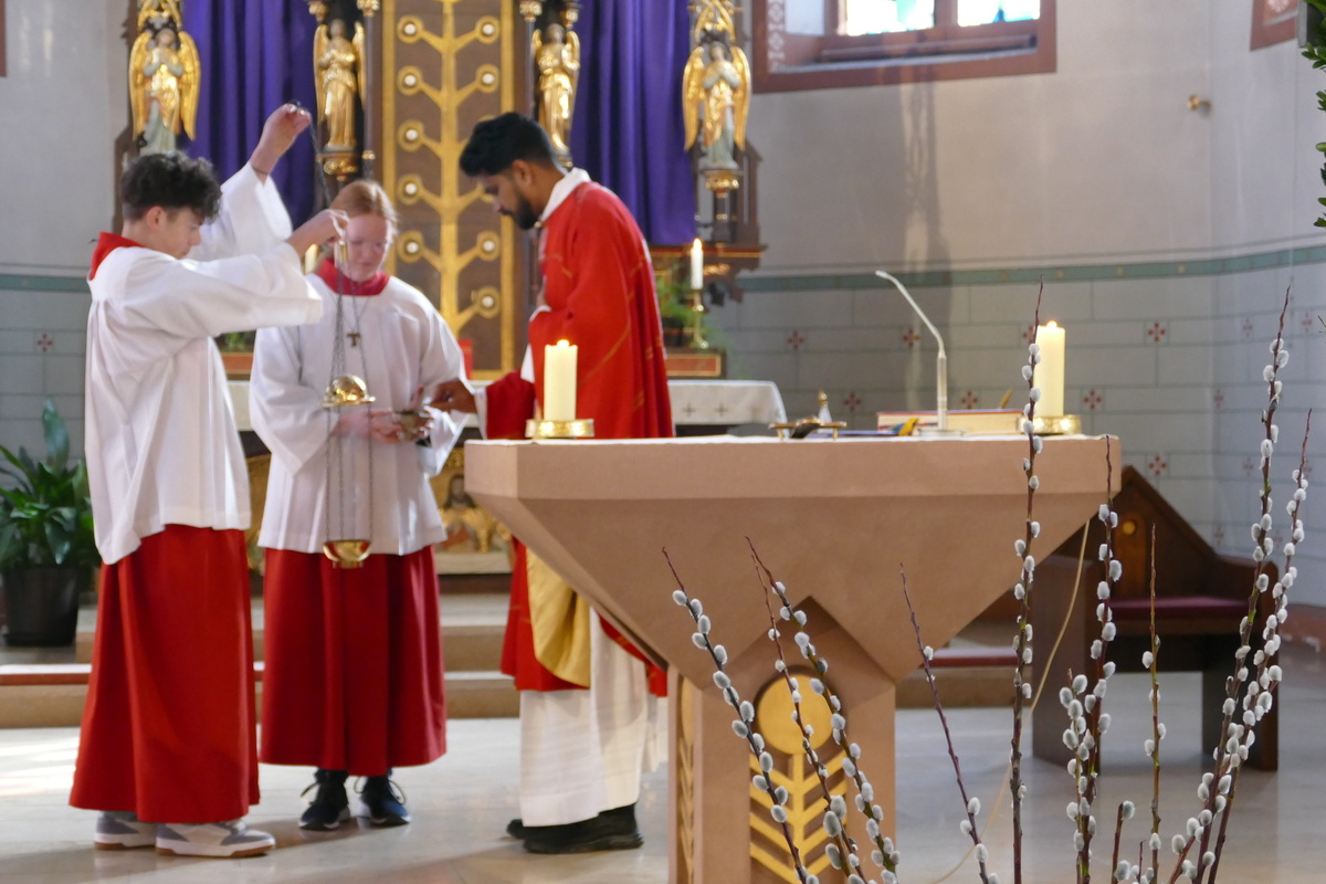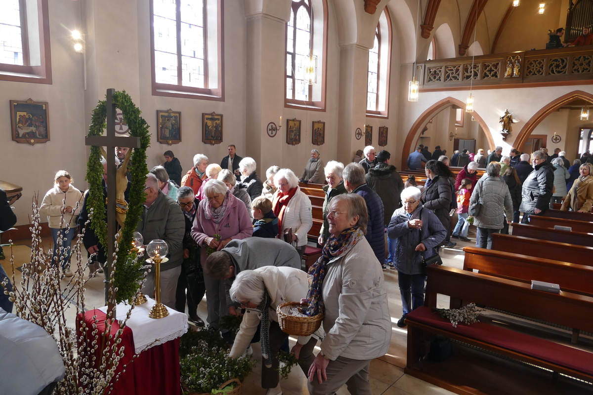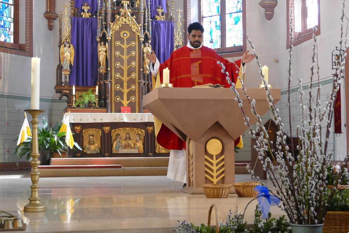 Gemeinsam mit den Kindern der Kinderkirche, ihren Betreuerinnen und dem Altardienst ist am Palmsonntag um 10 Uhr Pater Nidhin (Kloster Engelberg) feierlich in die Pfarrkirche in Kirchzell eingezogen. Vor dem Altar waren viele Palmsträuße und Palmzweige in großen Gefäßen und Körben aufgestellt, die von fleißigen Frauenhänden in der Woche zuvor gebunden worden waren. Pater Nidhin segnete die Palmsträuße. Die Kinderkirchenkinder und ihre Betreuerinnen gingen anschließend ins Pfarrheim, um dort kindgerecht den Palmsonntag zu erleben. Nach dem Vorlesen der Passion durch die Lektoren und dem Evangelium durch Pater Nidhin ging dieser in seiner Ansprache auf den Einzug Jesu in Jerusalem ein. Die Kernaussage lautete: „Jesus kommt nicht auf einem großen Pferd, sondern auf einem Esel und in Frieden. Wahre Größe ist nicht Macht, sondern Liebe und Demut.“ Diese Gedanken begleiteten den gesamten Gottesdienst. Am Ende der Messfeier wurden die Palmsträuße gegen eine Spende für soziale Zwecke an die Gottesdienstbesucher abgegeben.