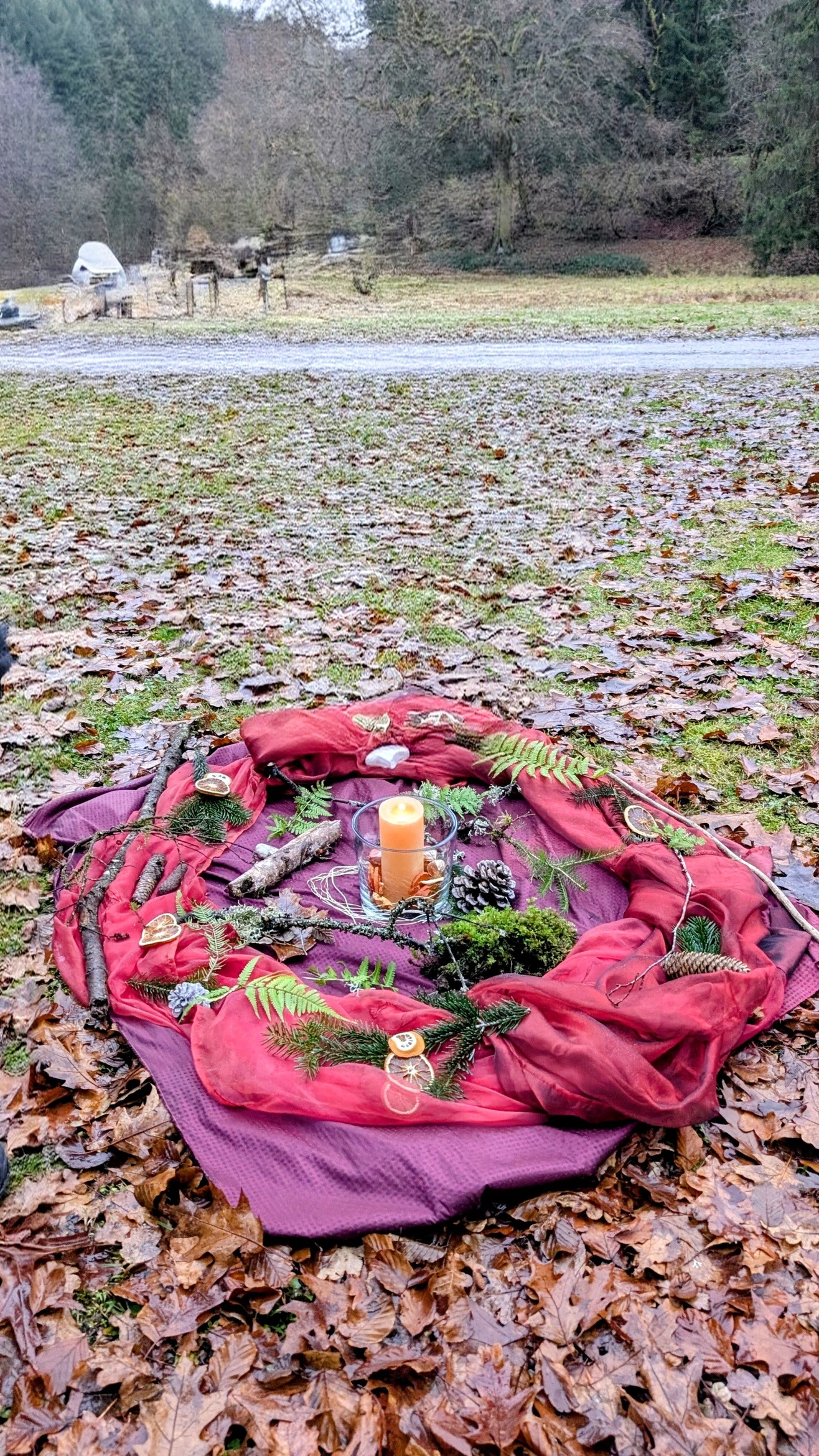 Unterwegs vom Parkplatz zur Kirche leuchteten die Kinder mir ihren Laternen und sammelten unterwegs „Naturschmuck“, wie Äste, Blätter, Moos oder Steine, die dann auf der Wiese vor der Kirche im Breitenbach zu einem Naturkranz gelegt wurden.