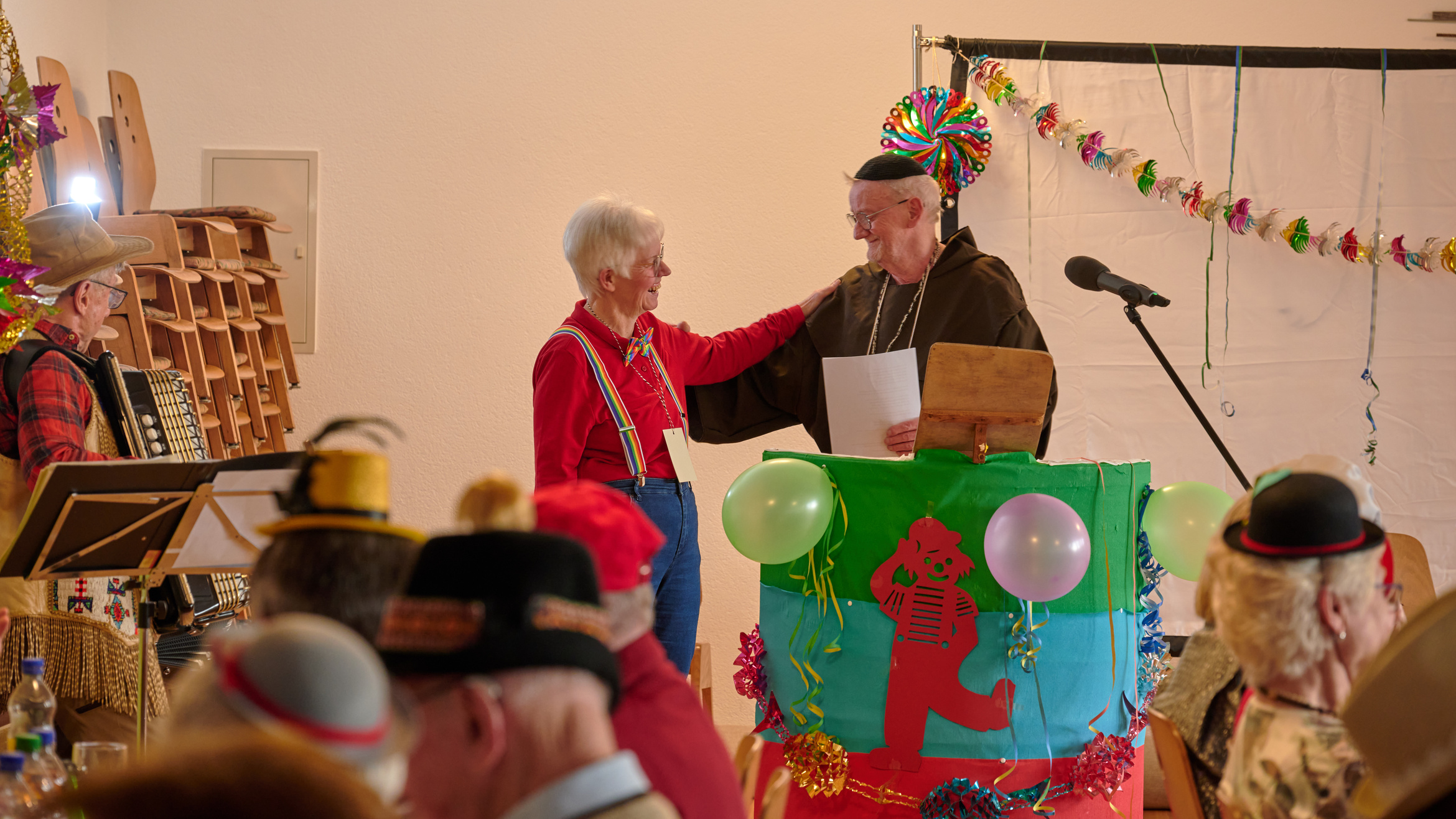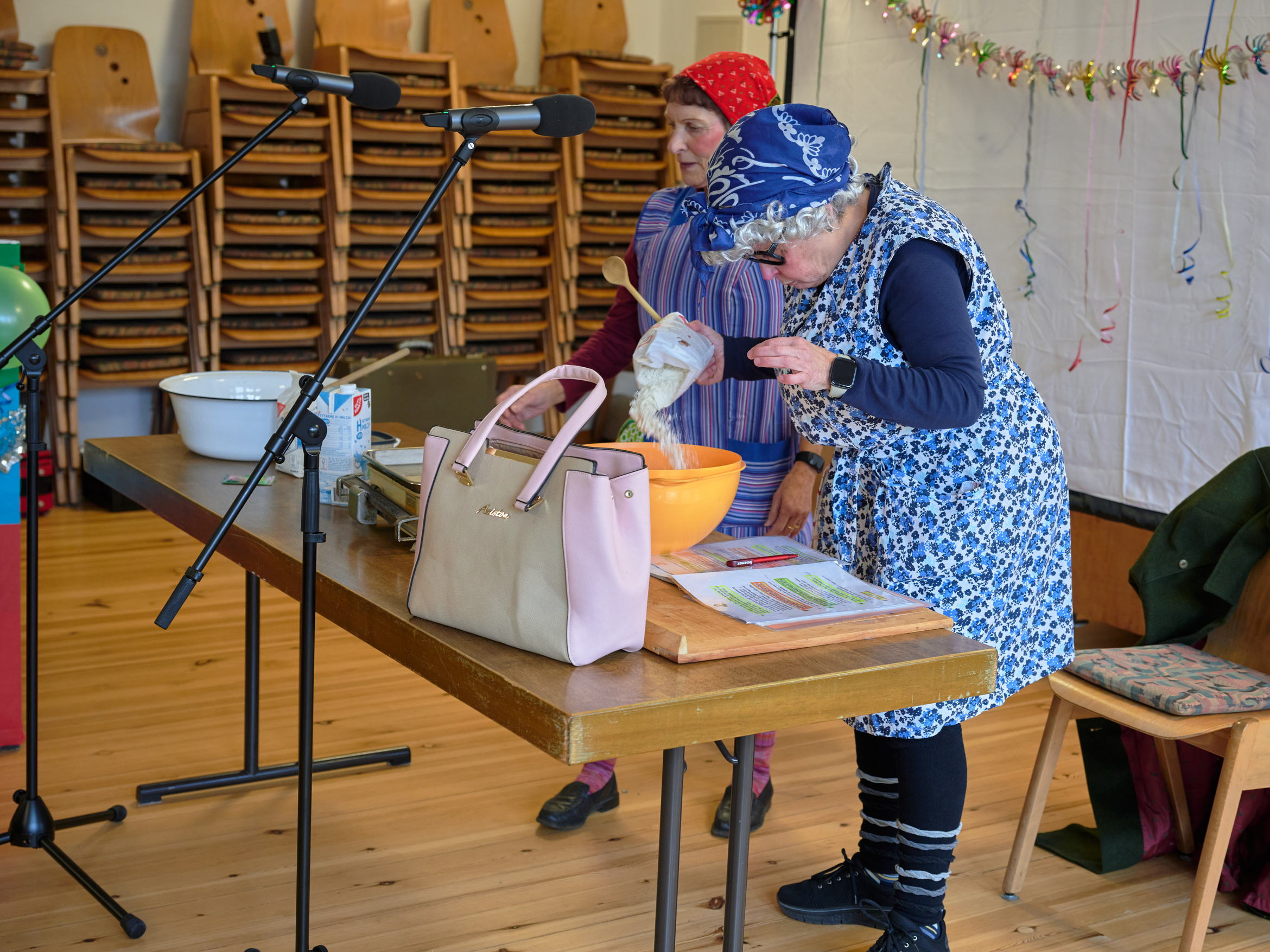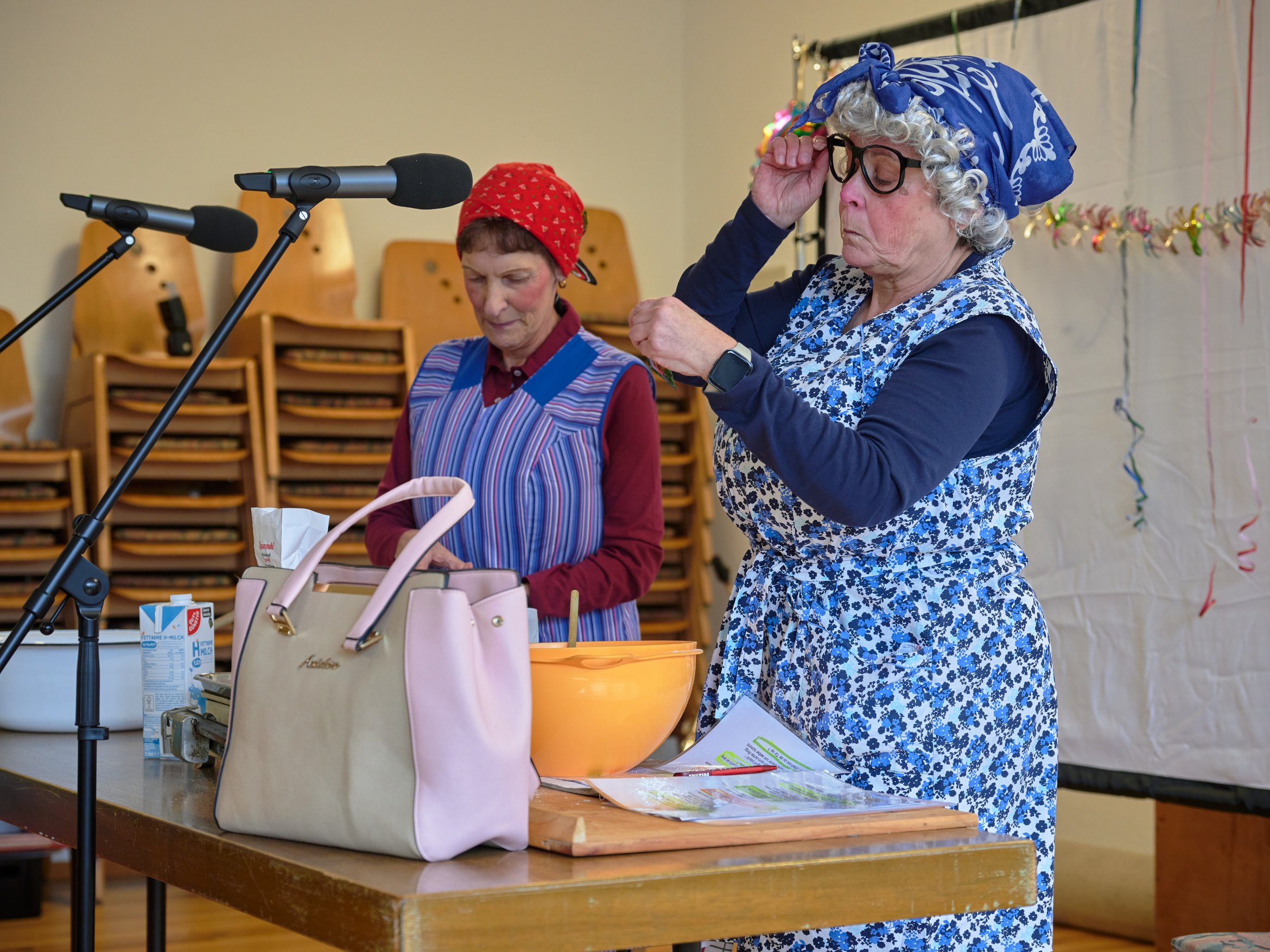 Helga Schmitt und Petra Zang wollten Faschingsküchle backen, was aber heilos daneben ging. Pfarrer Prokschi hielt eine humorvolle Predigt und sagte dem Teufel Alkohol den Kampf an. Maria Schöllig wusste zusammen mit Kasimir Schmitt Lustiges aus dem Seniorenkreis zu berichten und Heinrich Meixner erzählte von seinen Erlebnissen beim Bergwandern. Ein abwechslungsreiches Programm welches mit leckeren Krapfen und einem hausgemachten Wurstsalat als Donebach abgerundet wurde.