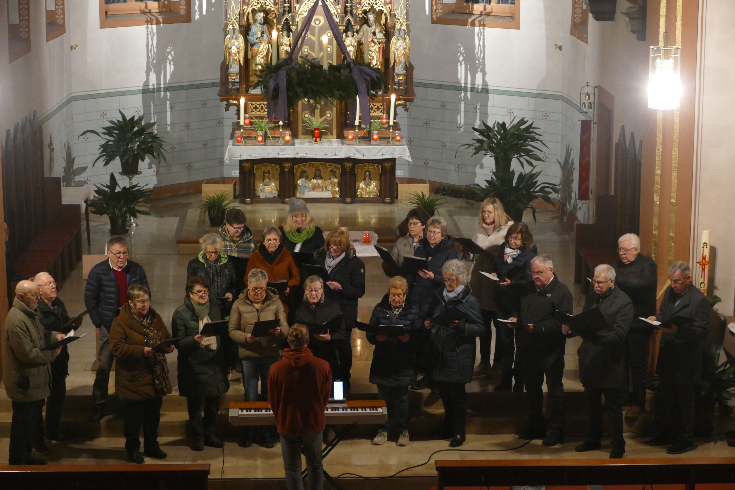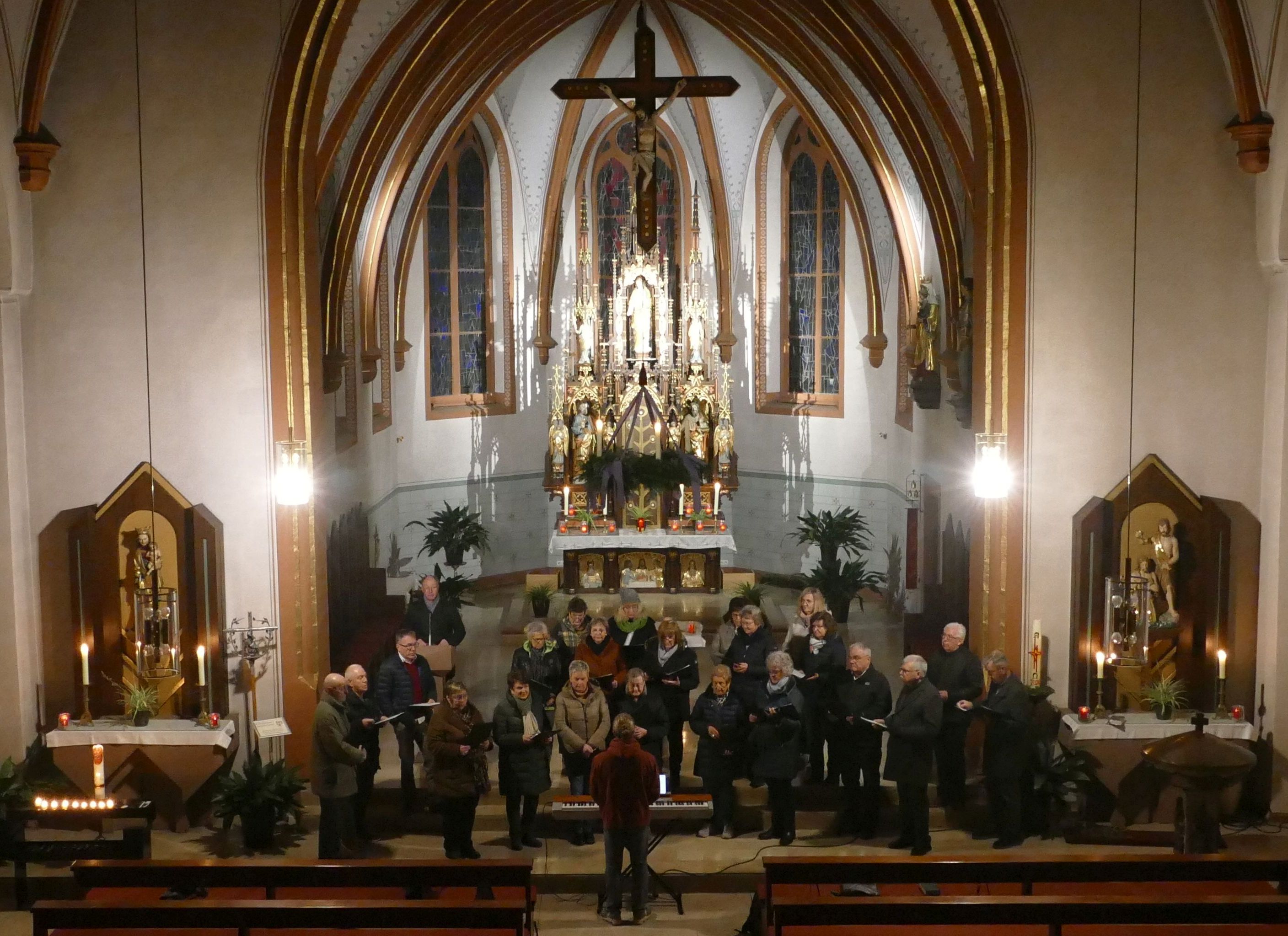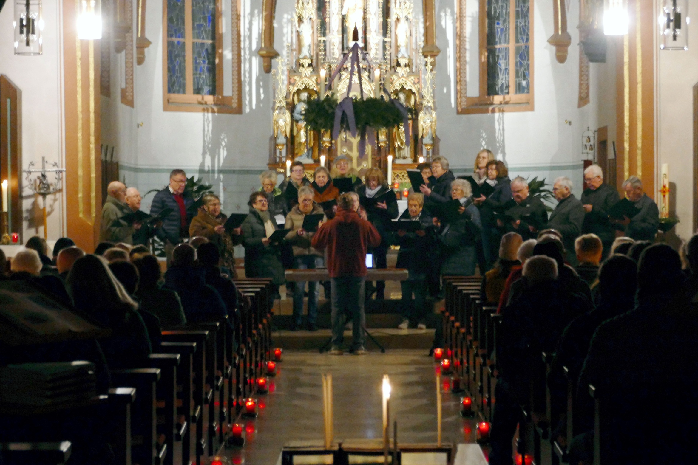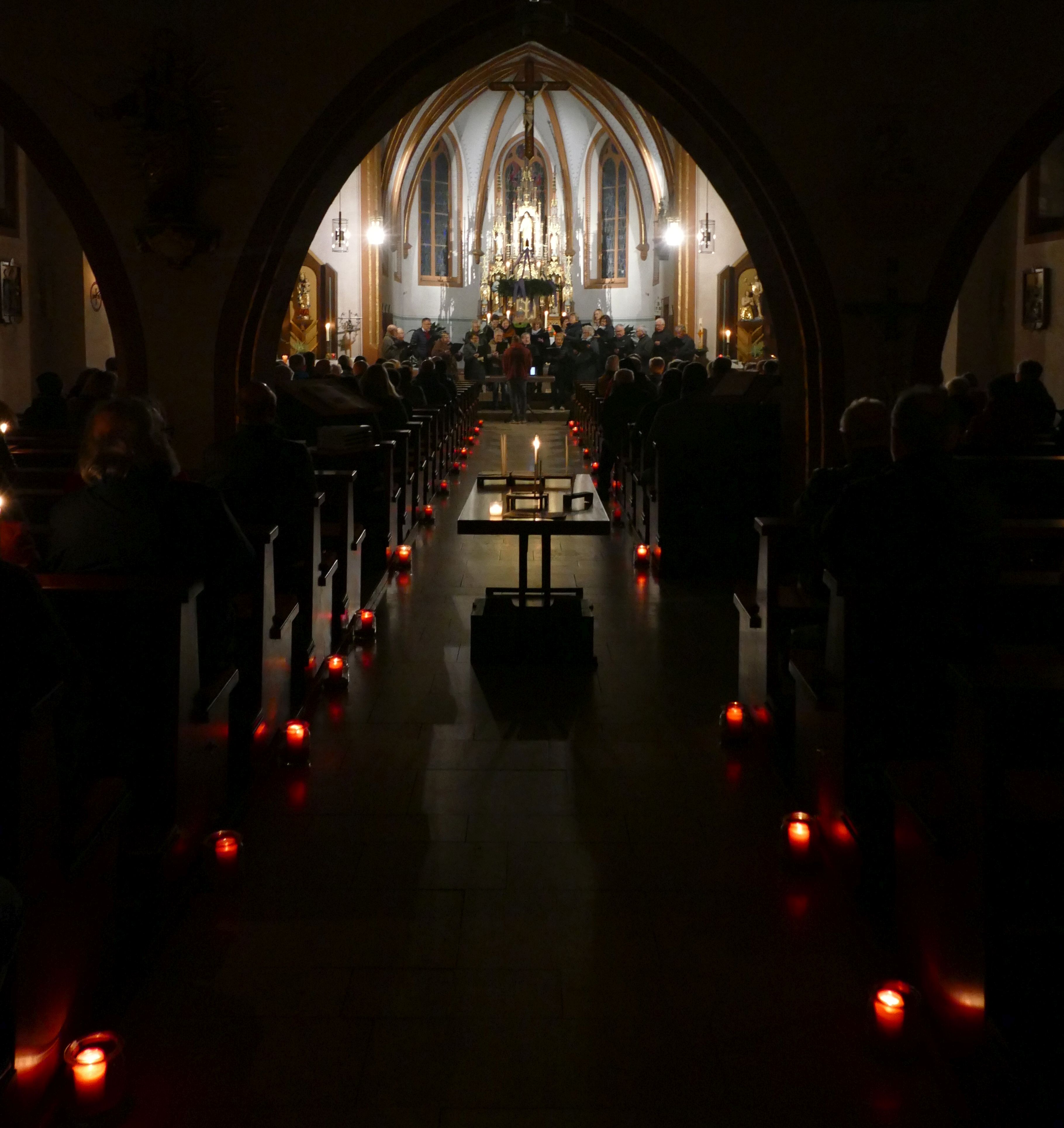 Stimmungsvoll erleuchtet von vielen Kerzen war auch am zweiten Advent die abendliche Andacht „Sonntag um Sechs“ der Kirchenraum der Pfarrkirche Kirchzell. Der Kirchenchor aus Limbach / Krumbach unter der Leitung von Tobias Fertig wusste gekonnt die vielen Zuhörer in den Bann zu ziehen. Lieder wie „Meine Seele ist stille“ oder auch „Ich hebe meine Augen“ gaben ruhige und besinnliche Momente. Pfarrer Michael Prokschi zitierte zwischen den einzelnen Liedblöcken nachdenkliche Texte zum Thema „Verheißung“.
