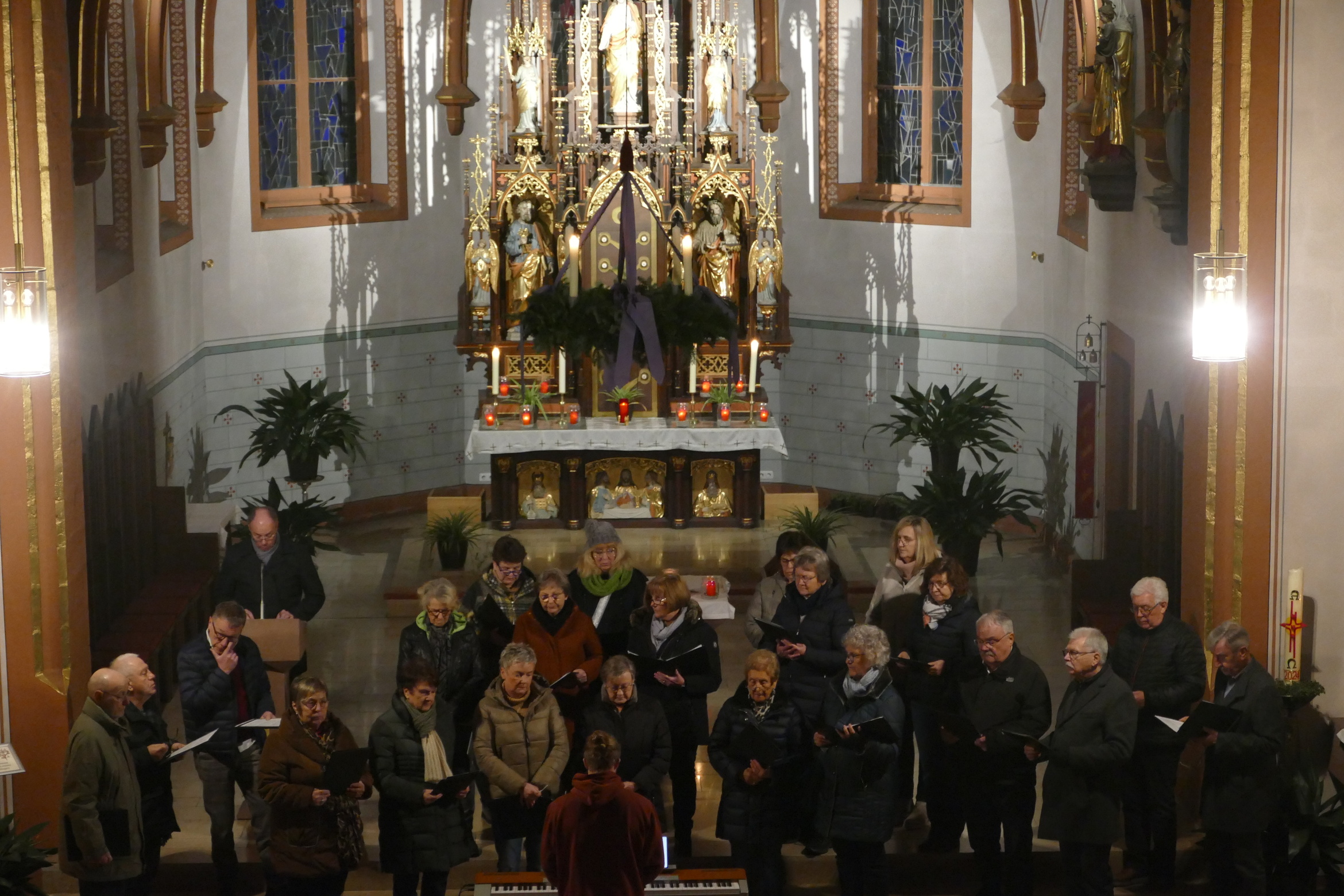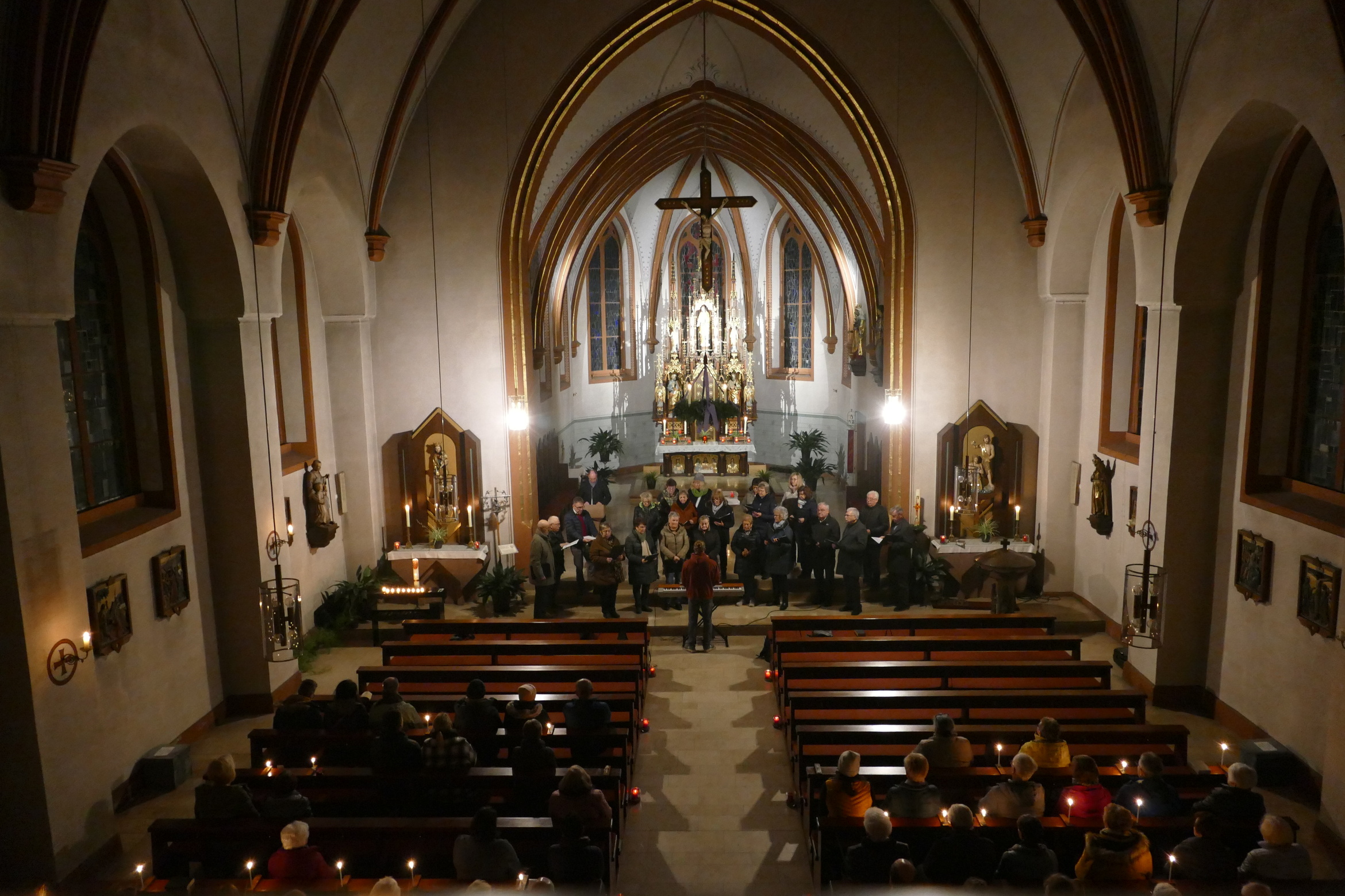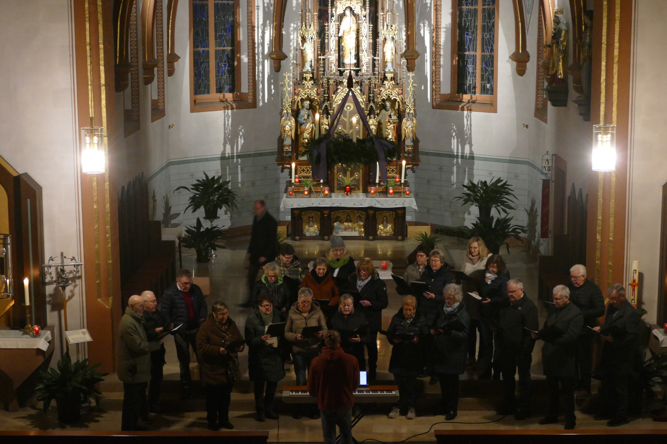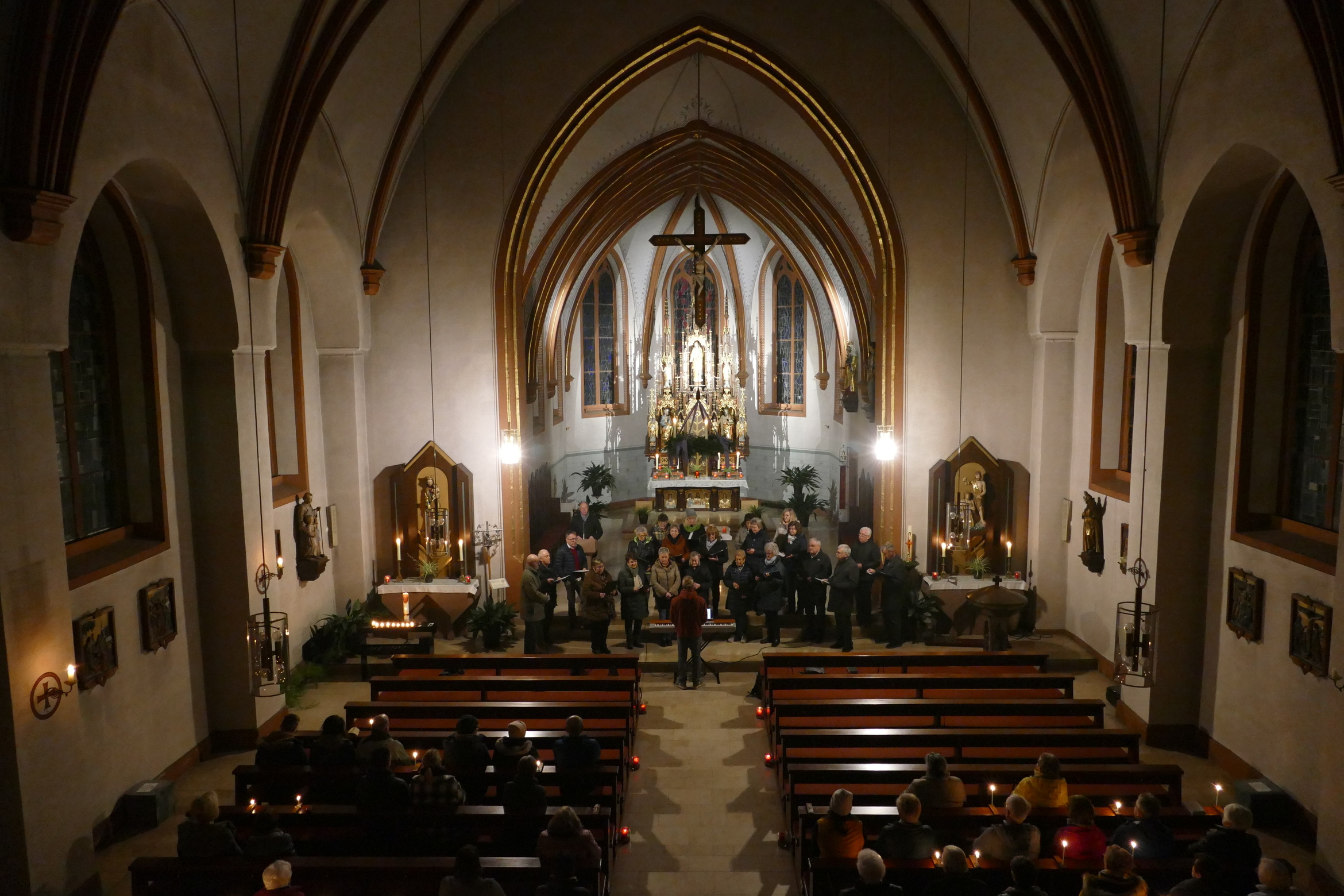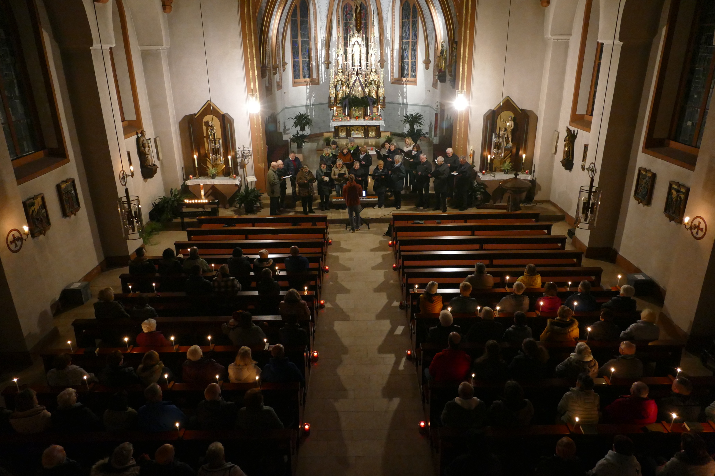 Stimmungsvoll erleuchtet von vielen Kerzen war auch am zweiten Advent die abendliche Andacht „Sonntag um Sechs“ der Kirchenraum der Pfarrkirche Kirchzell. Der Kirchenchor aus Limbach / Krumbach unter der Leitung von Tobias Fertig wusste gekonnt die vielen Zuhörer in den Bann zu ziehen. Lieder wie „Meine Seele ist stille“ oder auch „Ich hebe meine Augen“ gaben ruhige und besinnliche Momente. Pfarrer Michael Prokschi zitierte zwischen den einzelnen Liedblöcken nachdenkliche Texte zum Thema „Verheißung“.