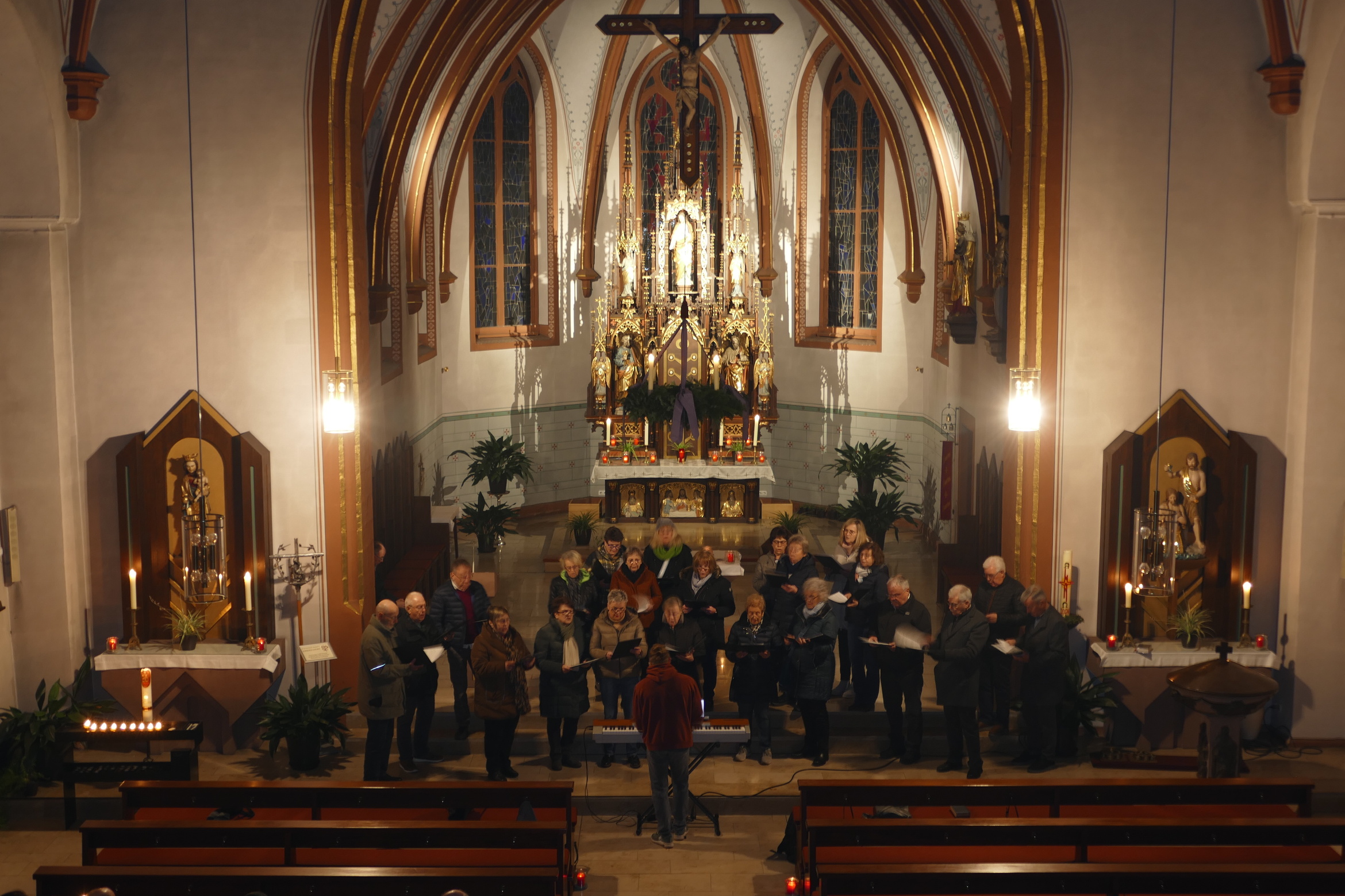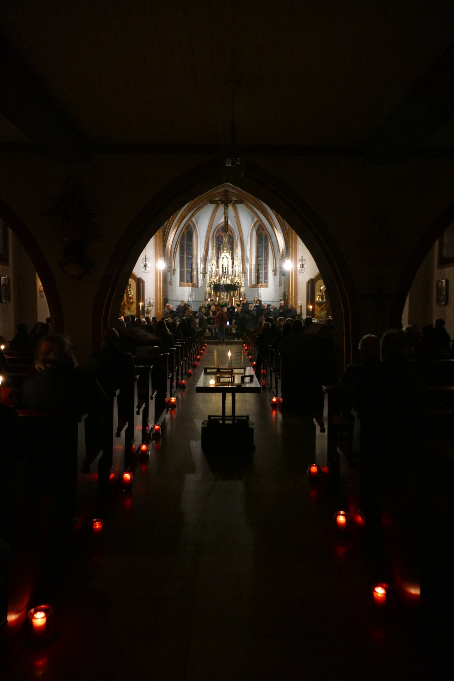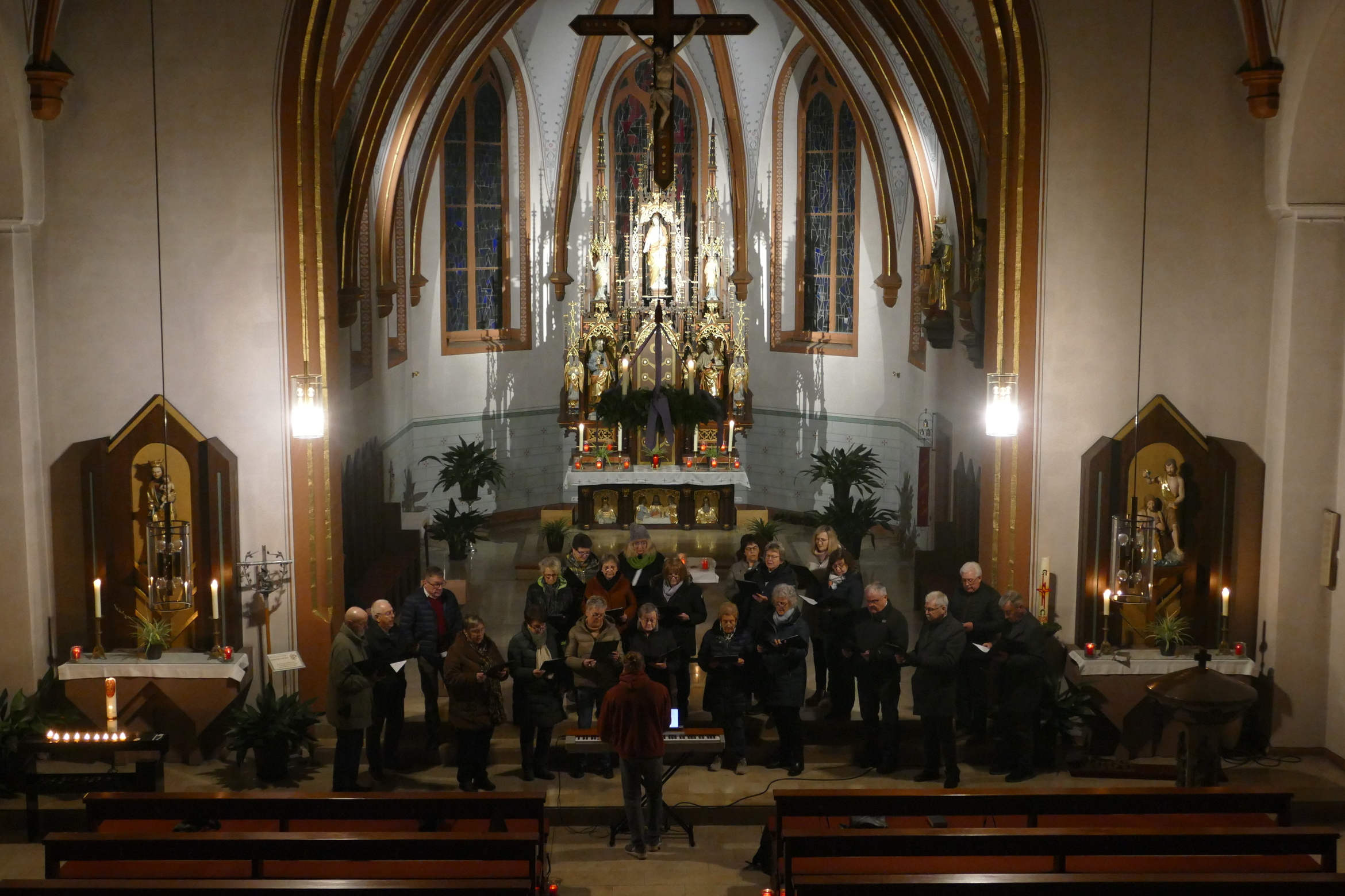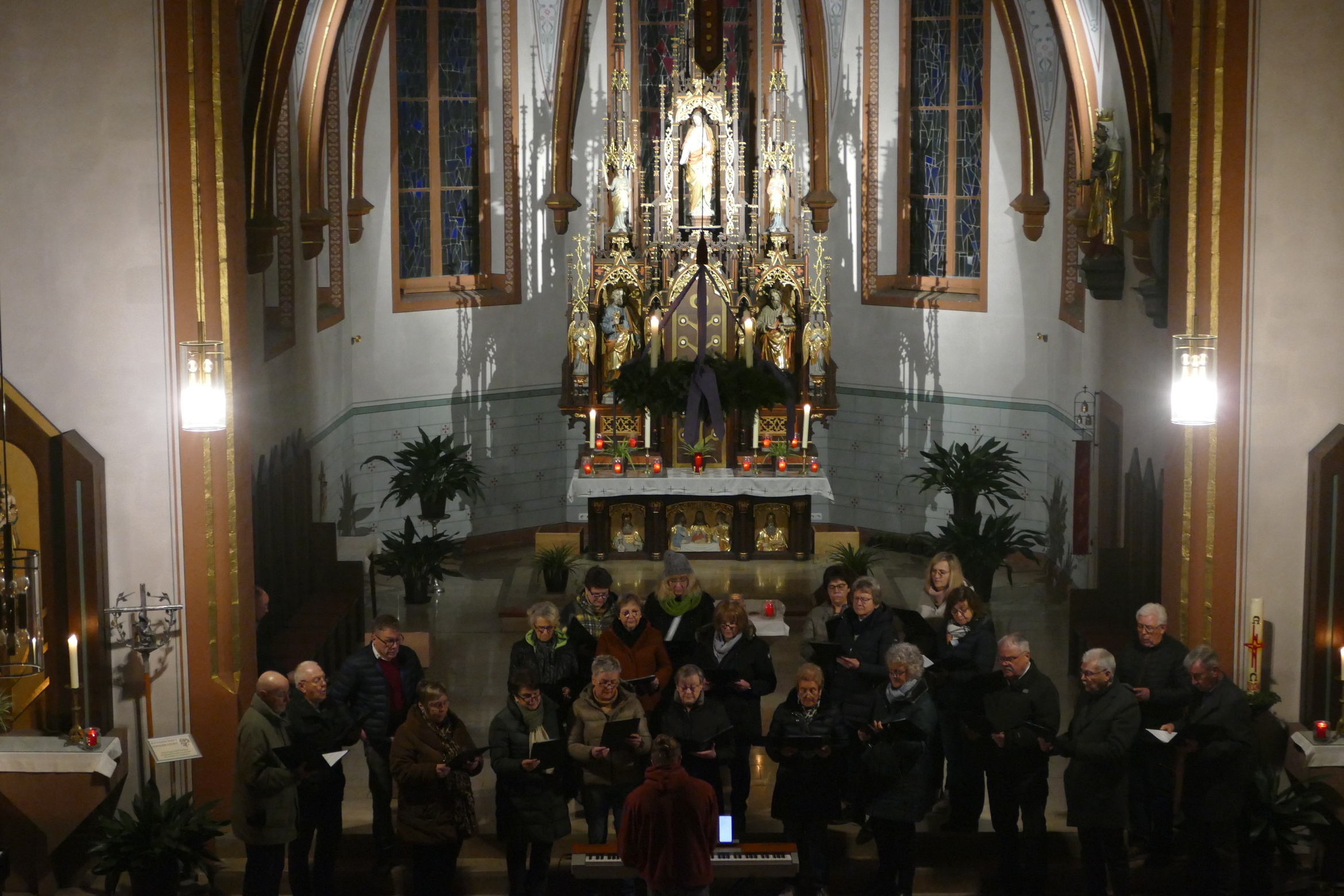 Stimmungsvoll erleuchtet von vielen Kerzen war auch am zweiten Advent die abendliche Andacht „Sonntag um Sechs“ der Kirchenraum der Pfarrkirche Kirchzell. Der Kirchenchor aus Limbach / Krumbach unter der Leitung von Tobias Fertig wusste gekonnt die vielen Zuhörer in den Bann zu ziehen. Lieder wie „Meine Seele ist stille“ oder auch „Ich hebe meine Augen“ gaben ruhige und besinnliche Momente. Pfarrer Michael Prokschi zitierte zwischen den einzelnen Liedblöcken nachdenkliche Texte zum Thema „Verheißung“.